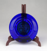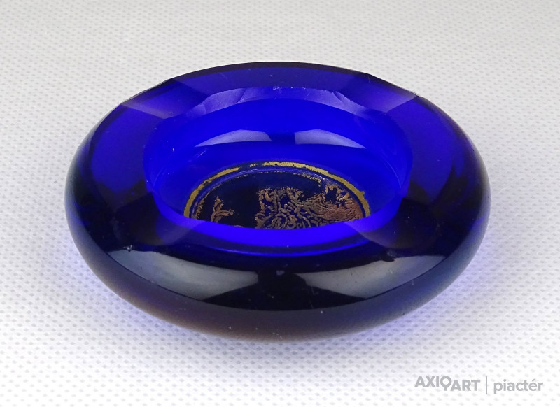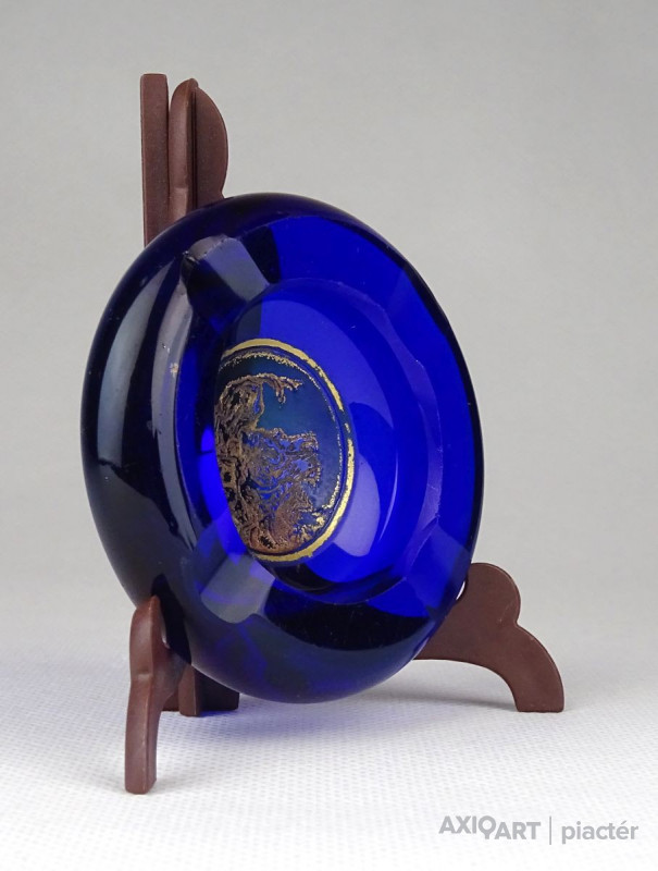 Antik, szép állapotú, jelzett kis méretű királykék színű Moser üveg hamutál. Közepében aranyozott díszítés.