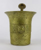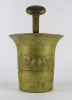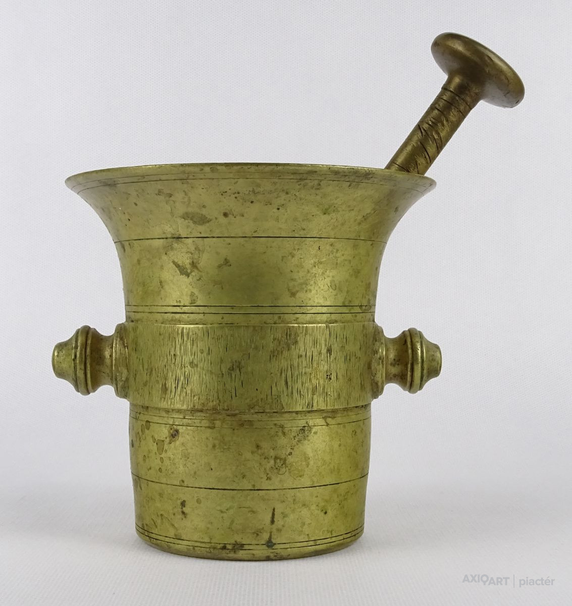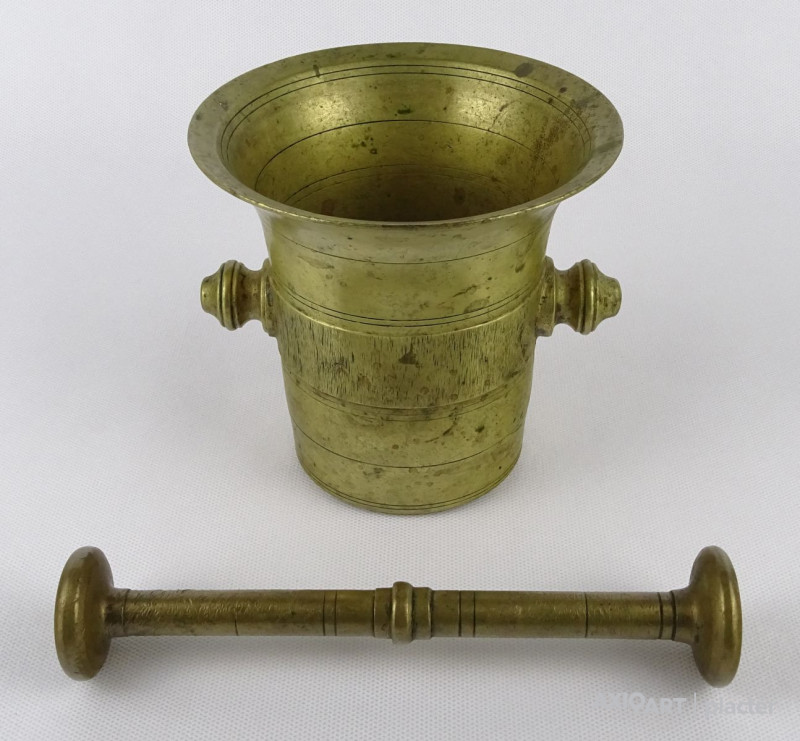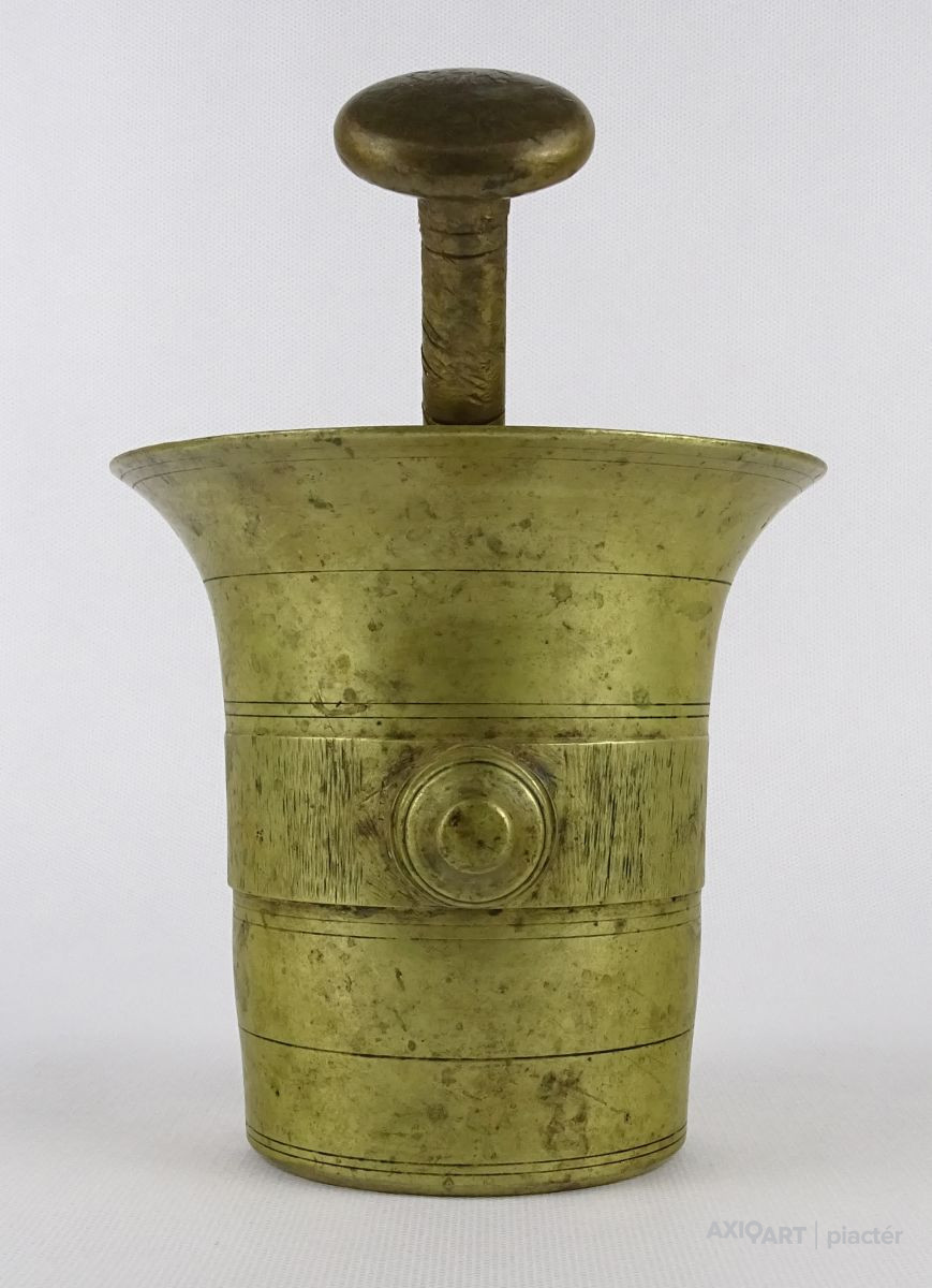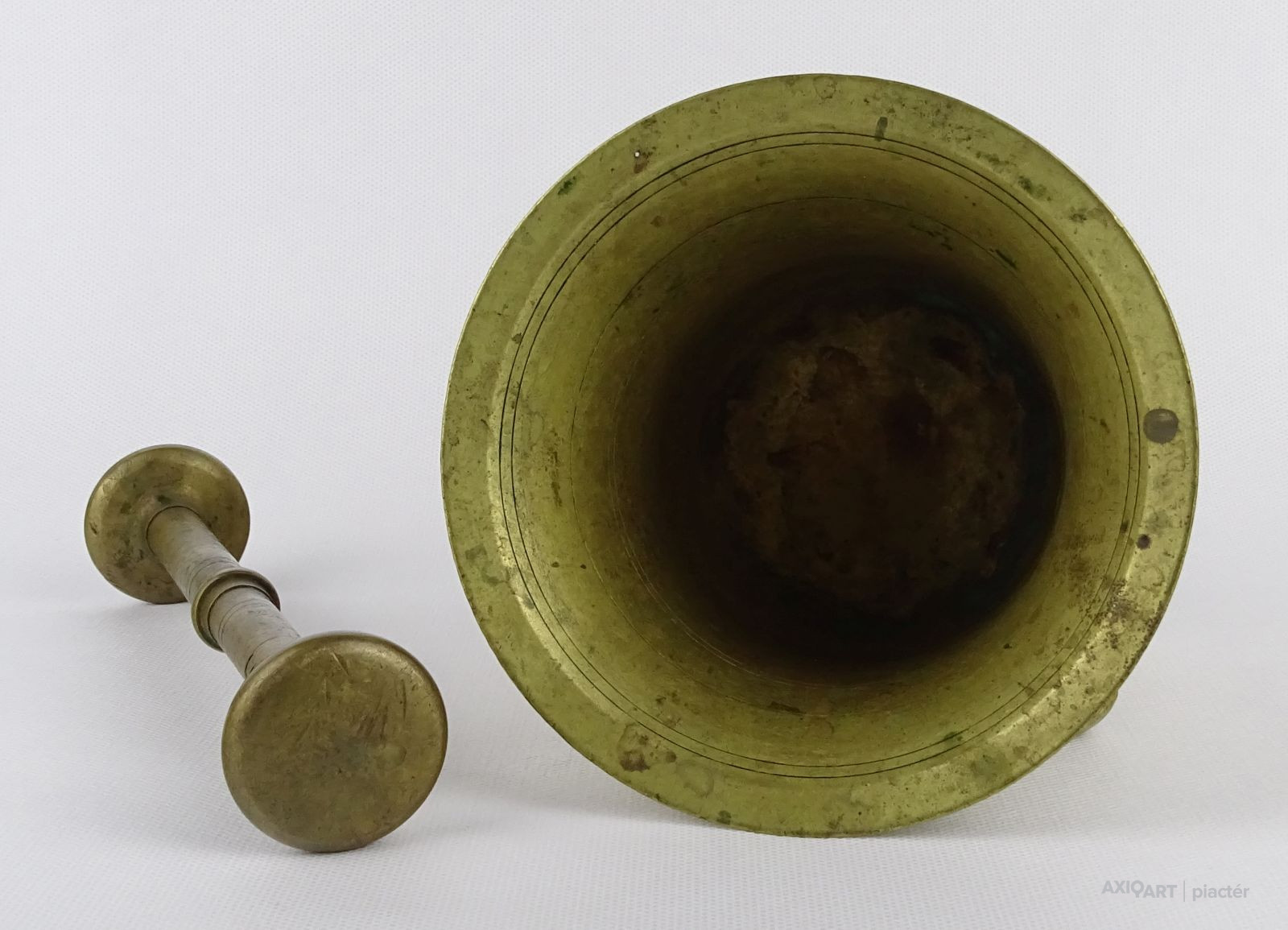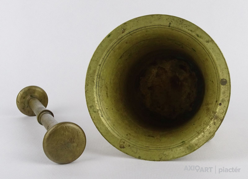 [1O875/X215] Szép állapotú antik réz mozsár. Dísznek és használatra egyaránt tökéletes. A mozsár alján és a törőn egy-egy méretjelölés található, lásd fotó. A mozsár alján ritkán látható gravírozott, vésett cirkalmas betűjel: "F" Magasság: 12.7 cm Szélesség: 13.2 cm Hosszúság: 15 cm Súly: 1.84 kg   A mozsár magassága 11 cm. Legnagyobb átmérője 12,5 cm. A törő hossza 18,5 cm.