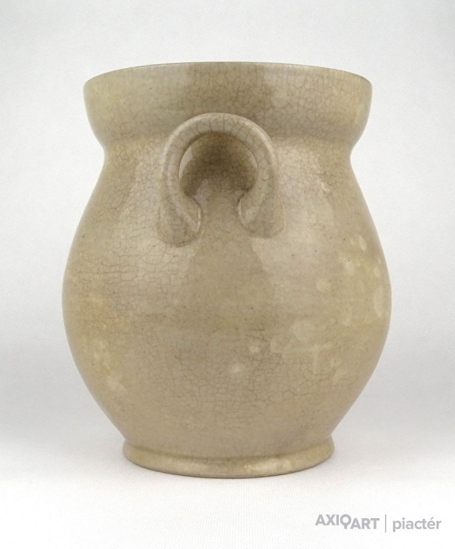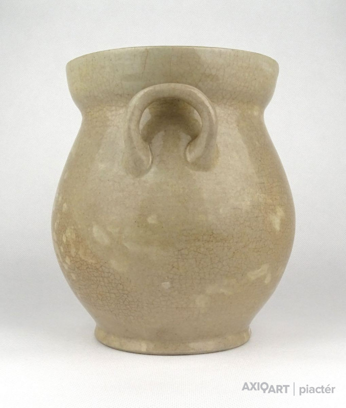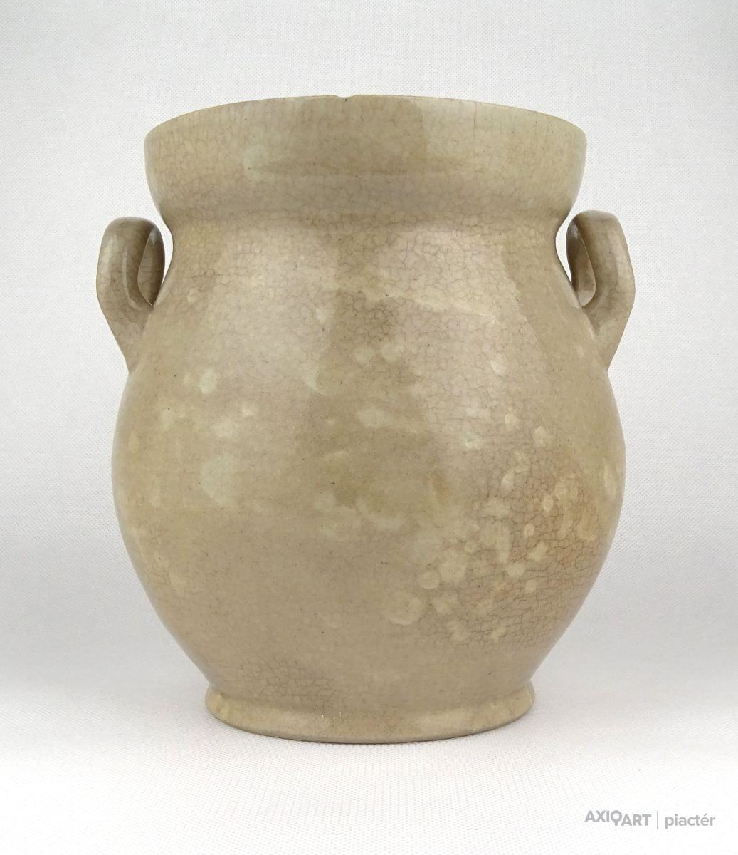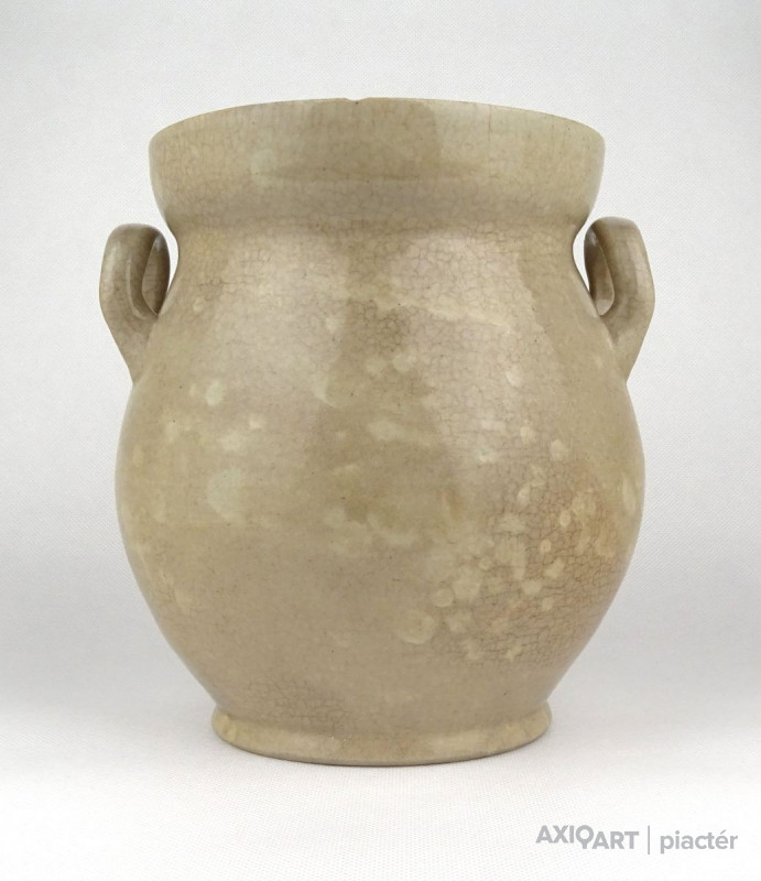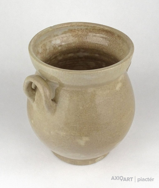 Antik, közepes méretű, szürkés színű, kétfülű kőcserép tárolóedény az 1800-as évek végéről. Talpán egy lepattanás található.