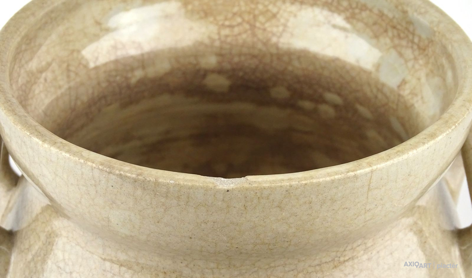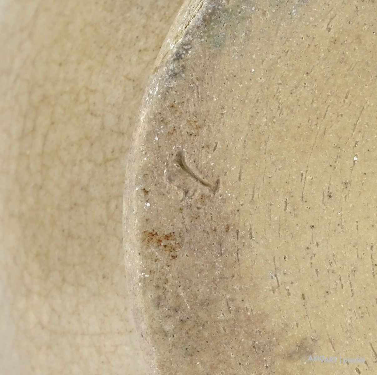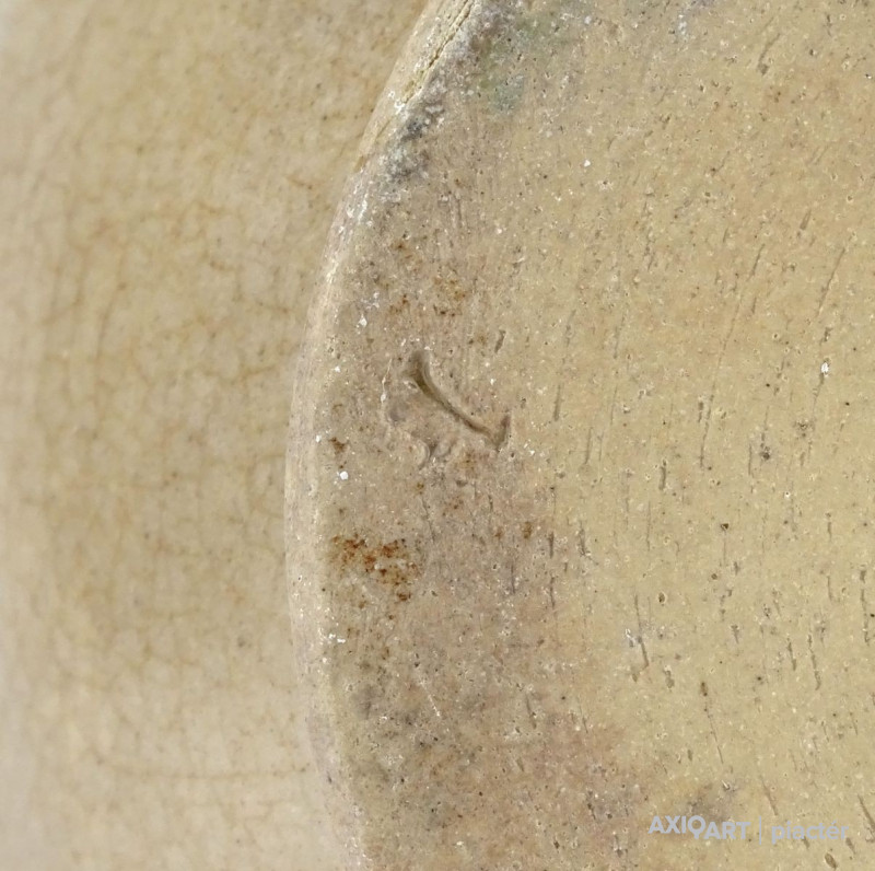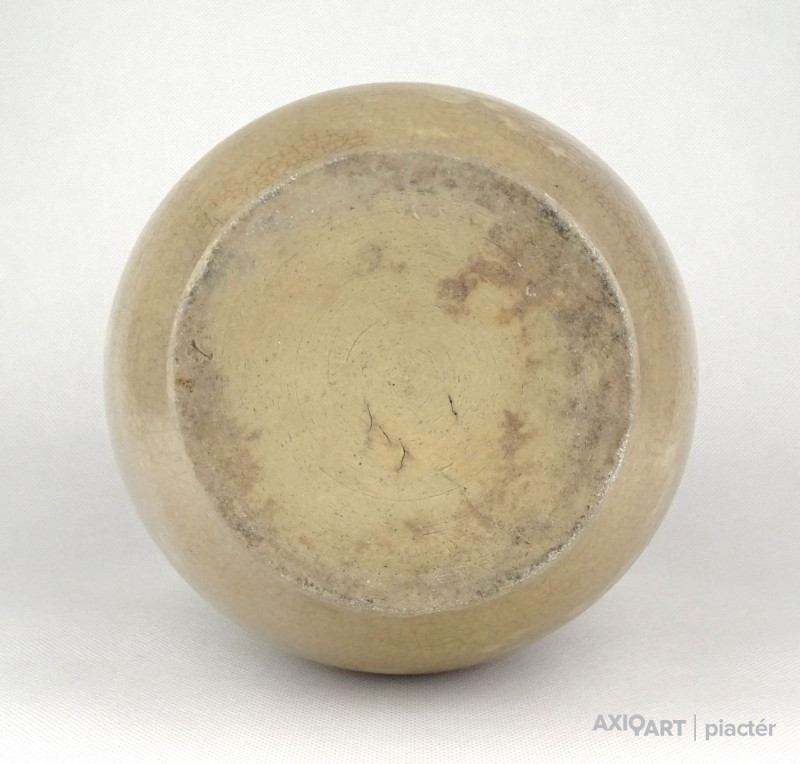 Antik, közepes méretű, szürkés színű, kétfülű kőcserép tárolóedény az 1800-as évek végéről. Talpán egy lepattanás található.