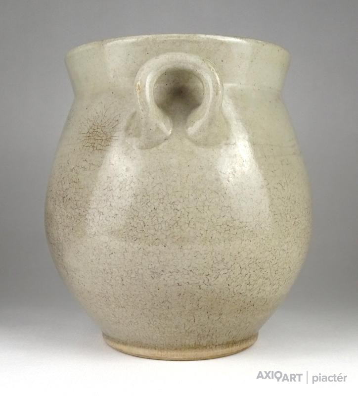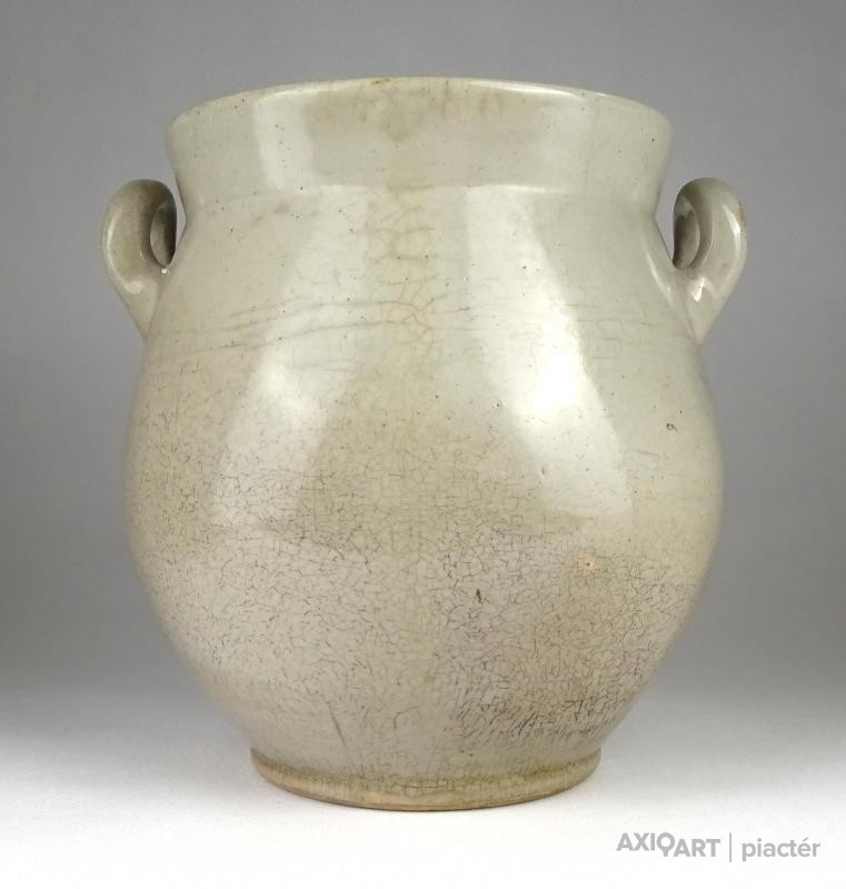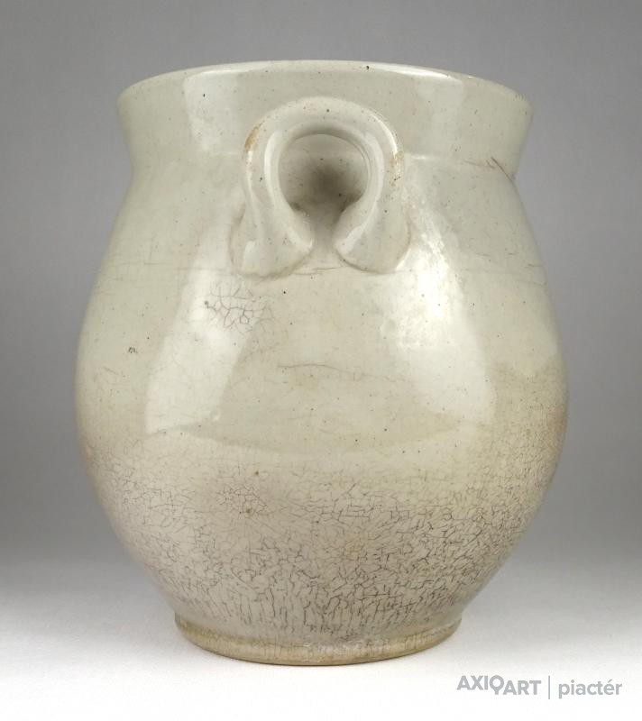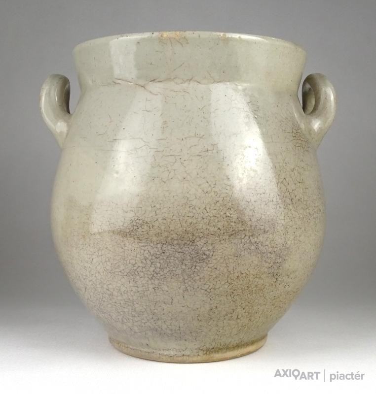 [1K701/X134] Antik, ép állapotú, jelzett, szürke színű, kétfülű kőcserép tárolóedény az 1800-as évek végéről. Alján jelzés: ZSOLNAY PÉCS Magasság: 21 cm Szélesség: 21 cm Súly: 1.83 kg