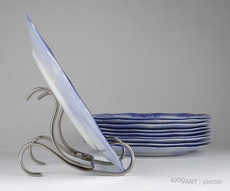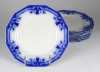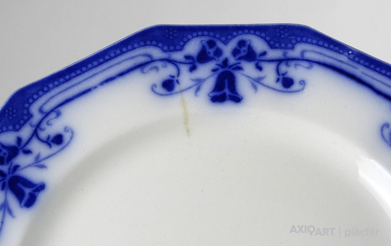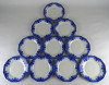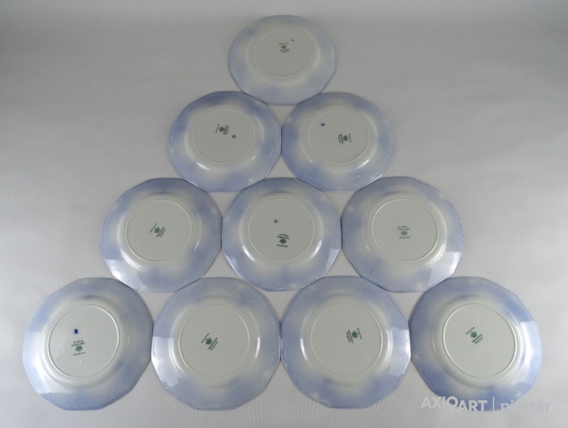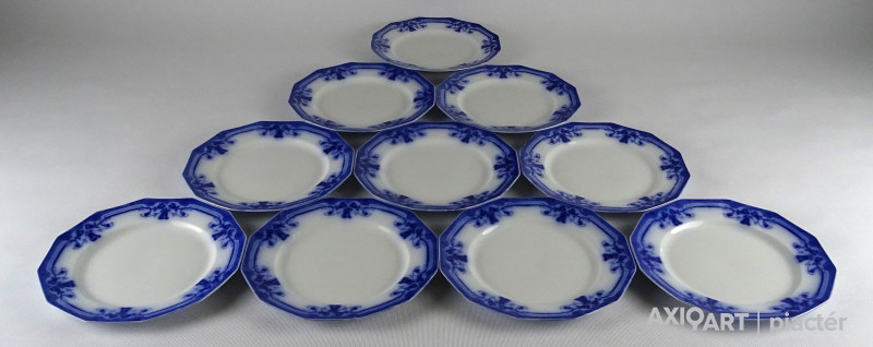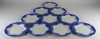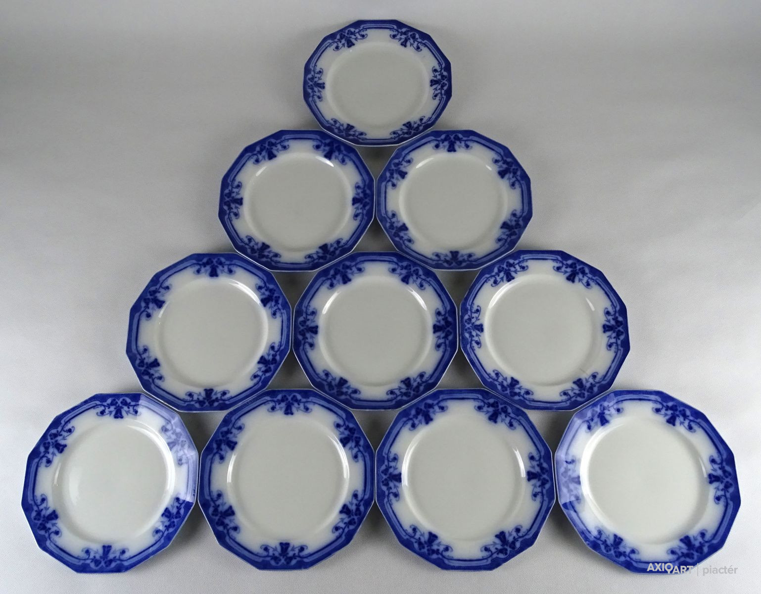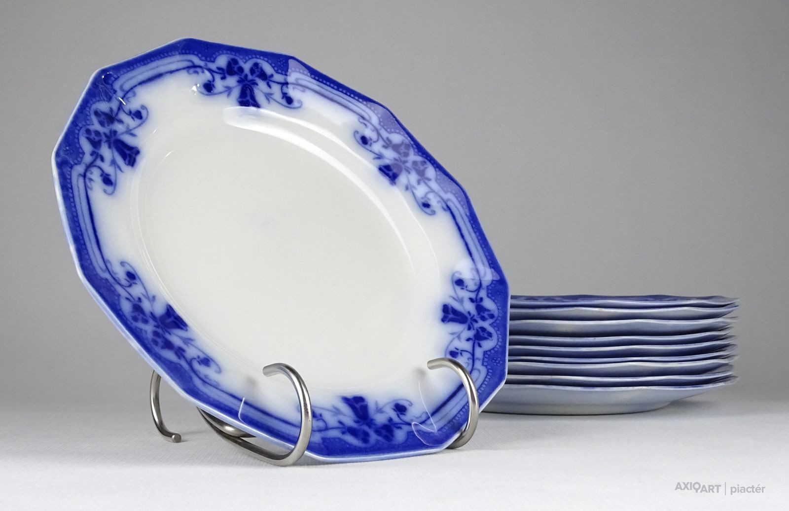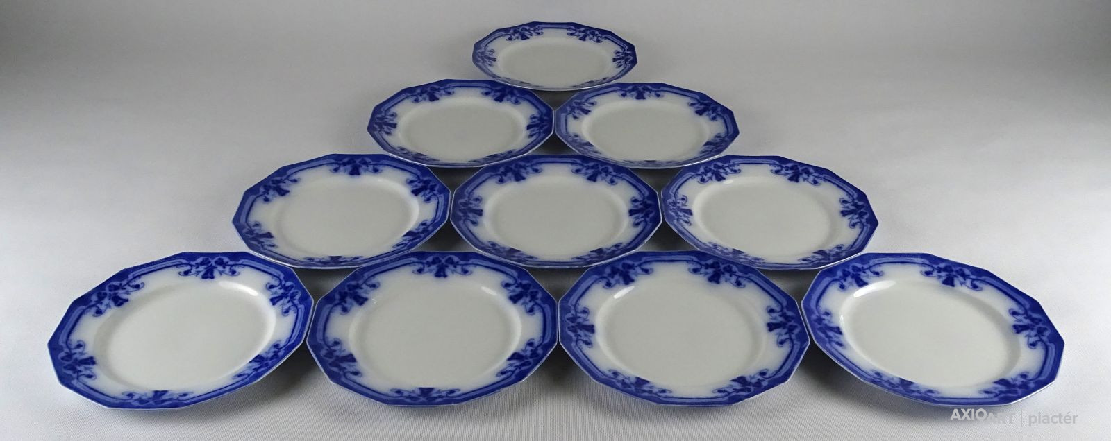 Antik, kék-fehér, virág mintás, jelzett süteményes porcelán tányér készlet, 10 darabos készlet.