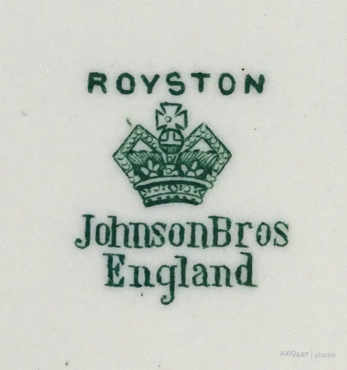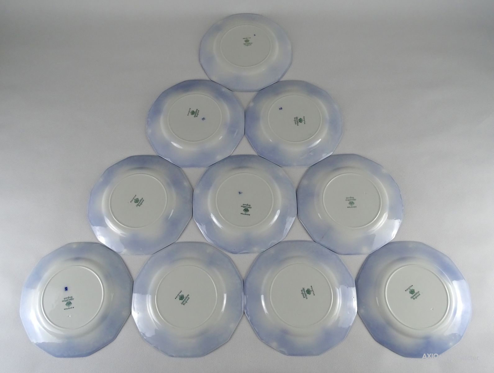[1M533/X061] Antik, kék-fehér, virág mintás, jelzett süteményes porcelán tányér készlet, 10 darabos készlet. Alján zöld koronás jelzés: ROYSTON JOHNSON BROS ENGLAND Szélesség: 20 cm Súly: 2.485 kg