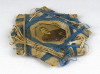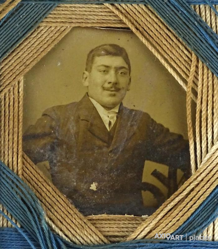 [1H632/FSZ] Antik Első vagy Második Világháborús, izraeli zászló kék-fehér színeivel készített zsidó emléktárgy. Közepében antik fotográfia, férfi portré. Magasság: 11.5 cm Szélesség: 11.5 cm Súly: 0.015 kg