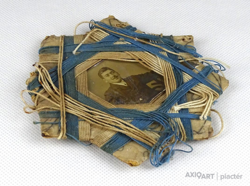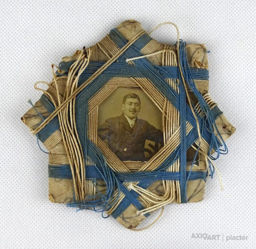 Antik Első vagy Második Világháborús, izraeli zászló kék-fehér színeivel készített zsidó emléktárgy. Közepében antik fotográfia, férfi portré.
