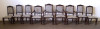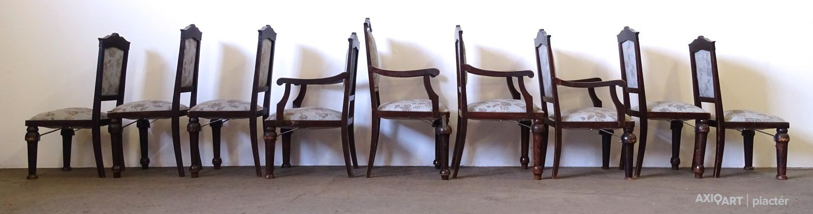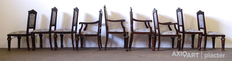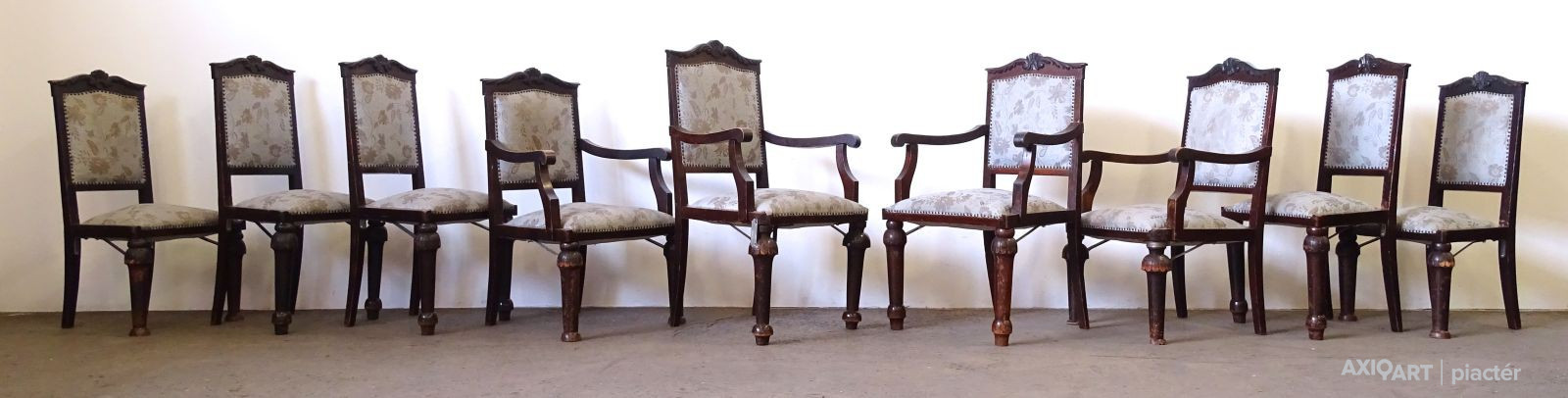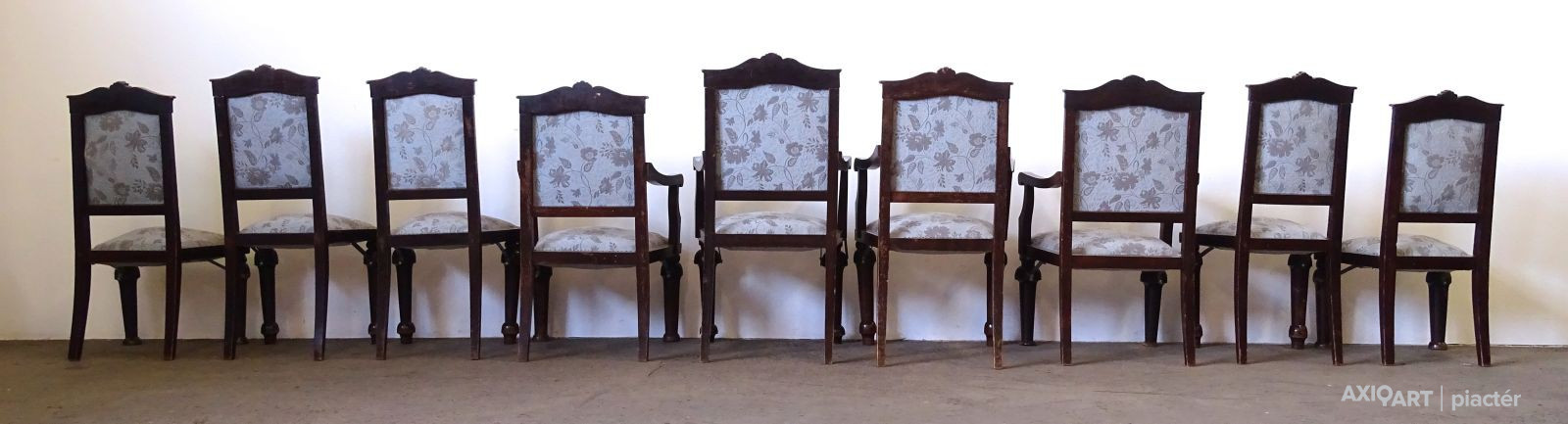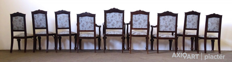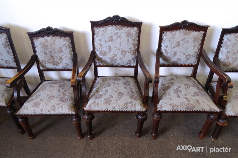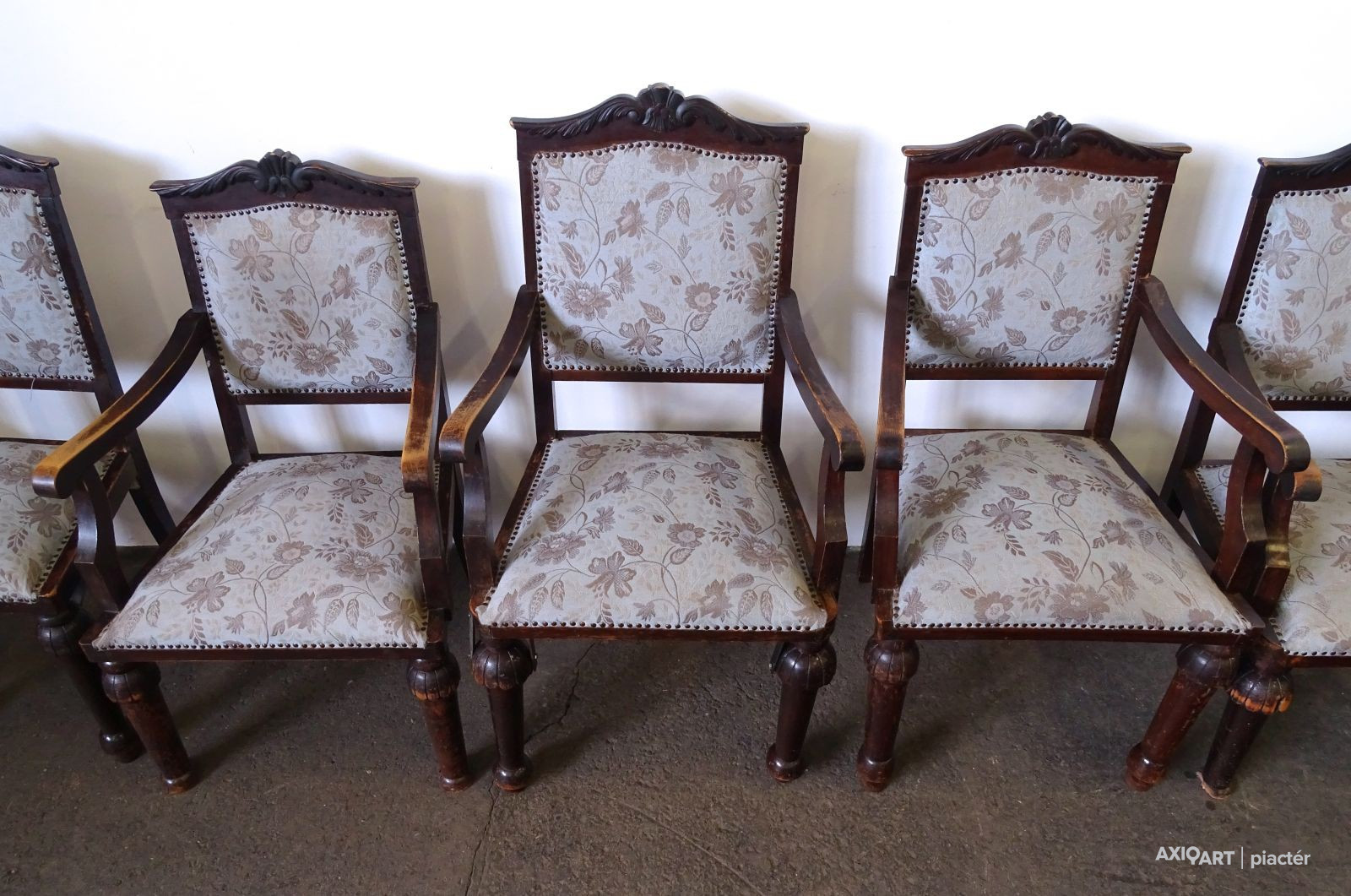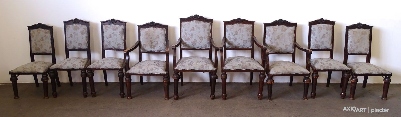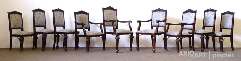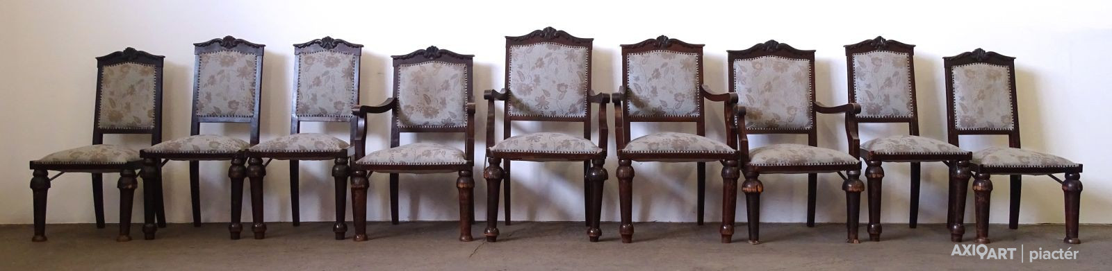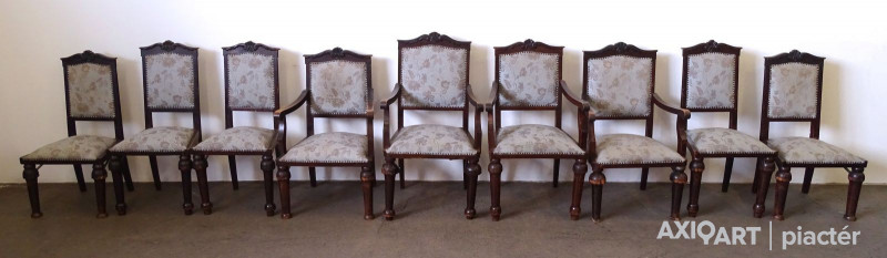 [1F699/KCS] Antik faragott díszes kárpitozott szék garnitúra. Faragott vastag oszlopos lábakkal és egységes, halványkék kárpittal rendelkeznek. Szélén körben szegecsekkel díszített. A garnitúra részei: - 4 darab karfás szék (106 x 62 x 60 cm) Az egyik szék 6.5 cm-rel alacsonyabb. - 5 darab támlás szék (106 x 53 x 48 cm) Két szék 6.5 cm-rel alacsonyabb.