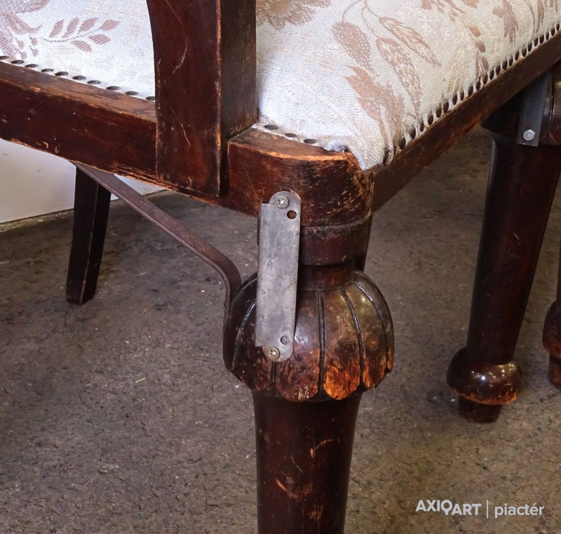 Antik faragott díszes kárpitozott szék garnitúra. Faragott vastag oszlopos lábakkal és egységes, halványkék kárpittal rendelkeznek. Szélén körben szegecsekkel díszített.