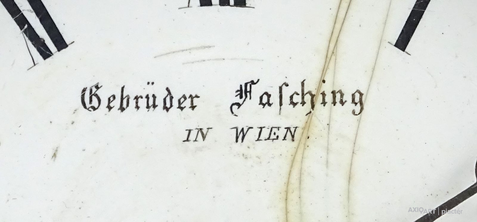 Antik kis méretű asztali óra az 1800-as évekből. Üveglap mögött zománcozott fehér számlapon kézzel festett felirat, jelzés: GEBRÜDER FASCHING IN WIEN