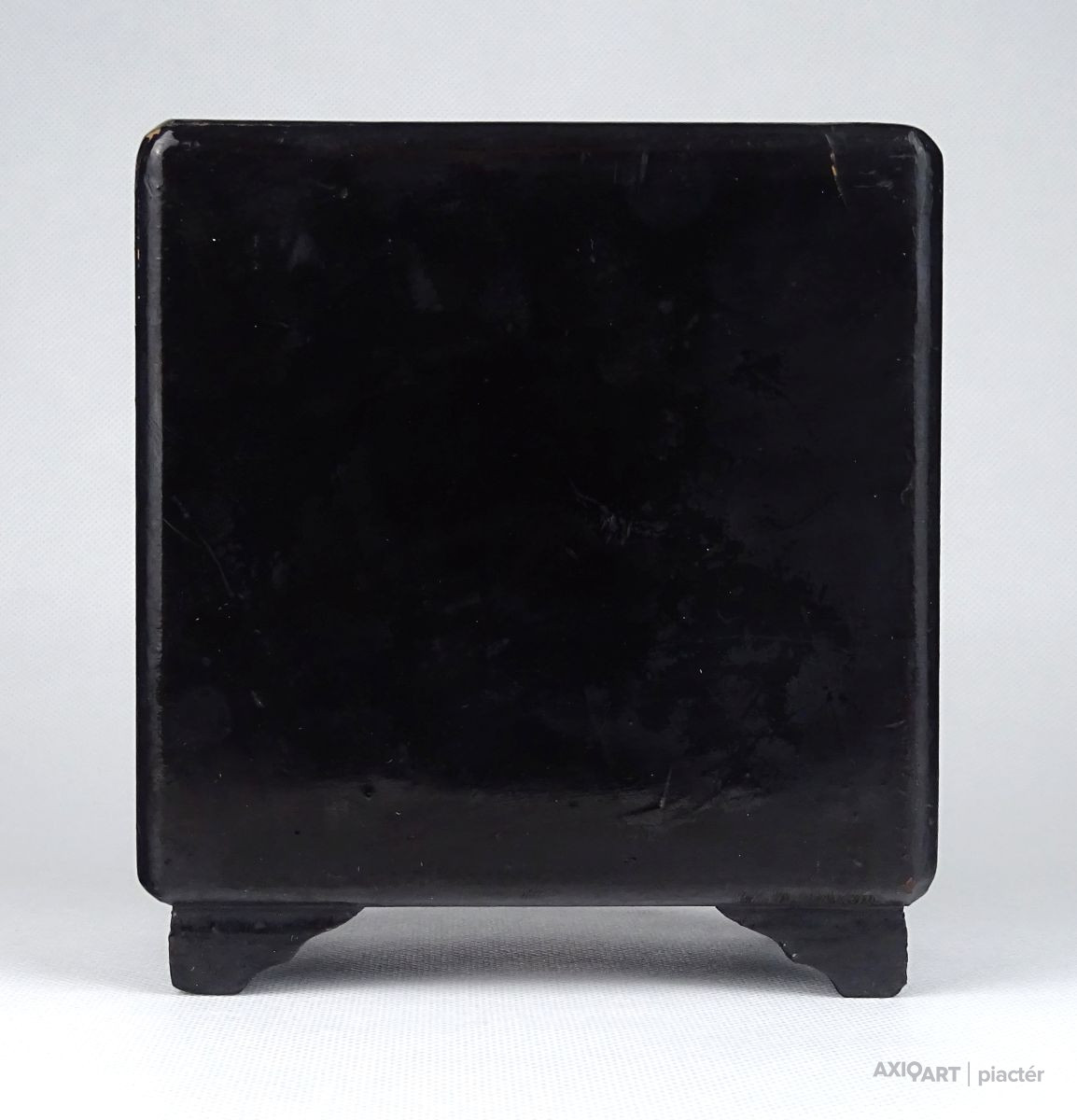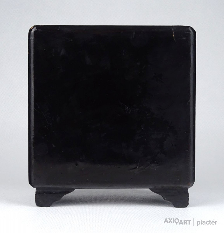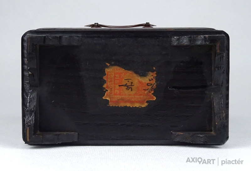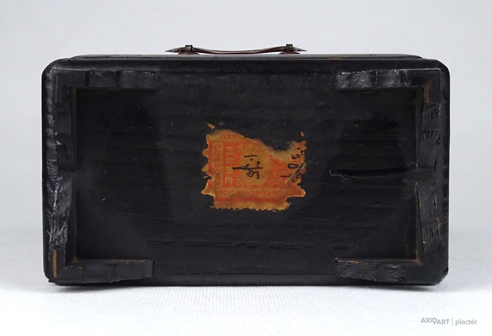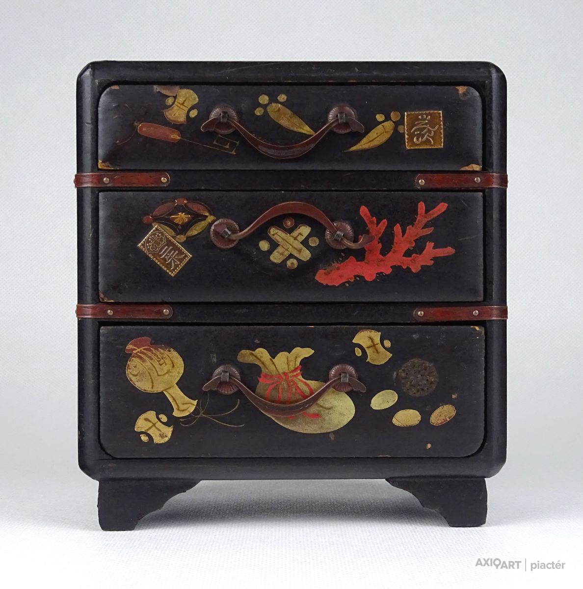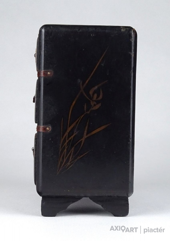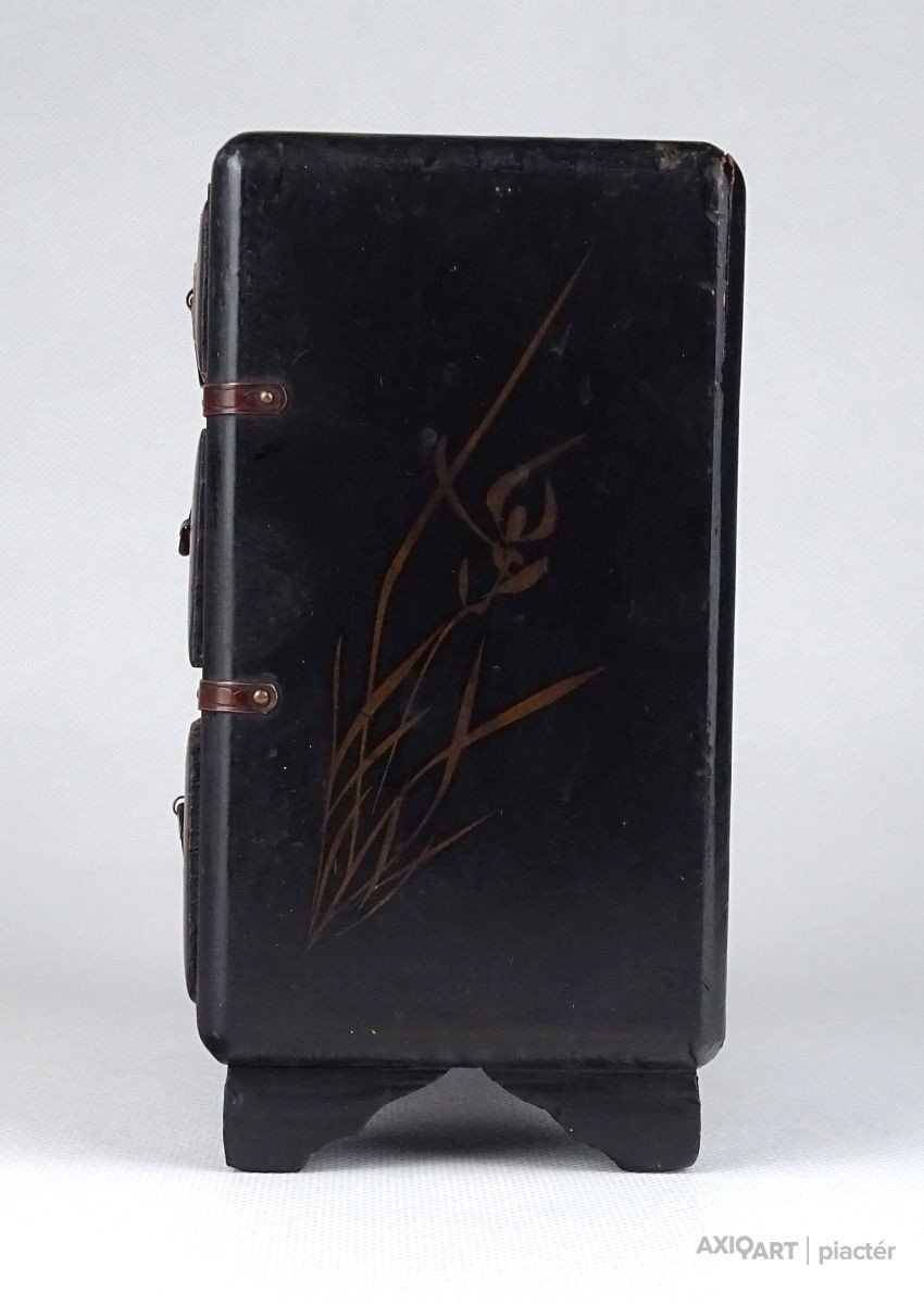 [1H183/UZ-K] Antik, szép állapotú, fekete színű japán ékszeres szekrény, ékszertartó. Nagyon dekoratív, vörösréz fiók fogantyúkkal rendelkezik. Két fiókon kaligrafikus vörösréz pici tábla, jelzés látható. Magasság: 13.7 cm Szélesség: 7 cm Hosszúság: 12.7 cm Súly: 0.21 kg