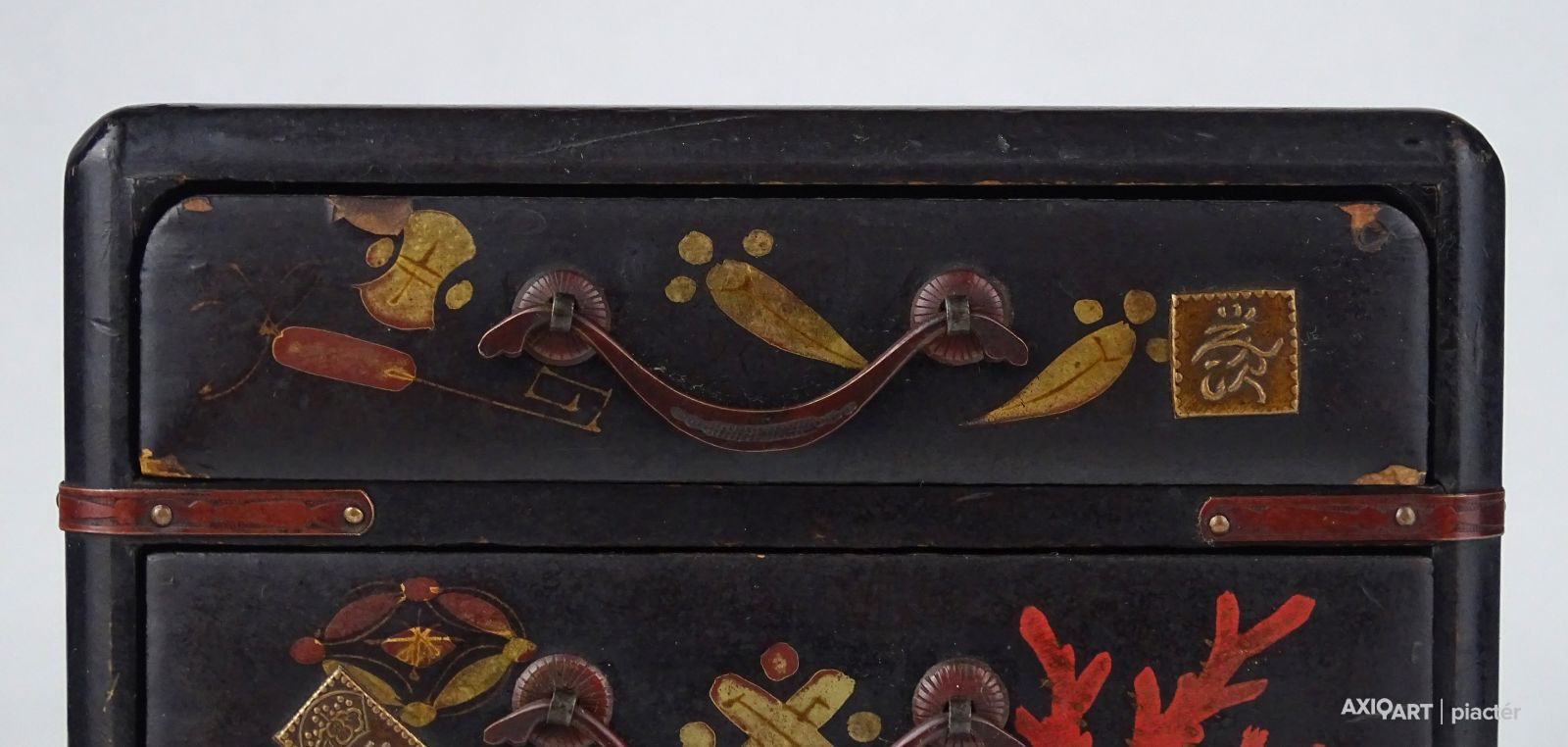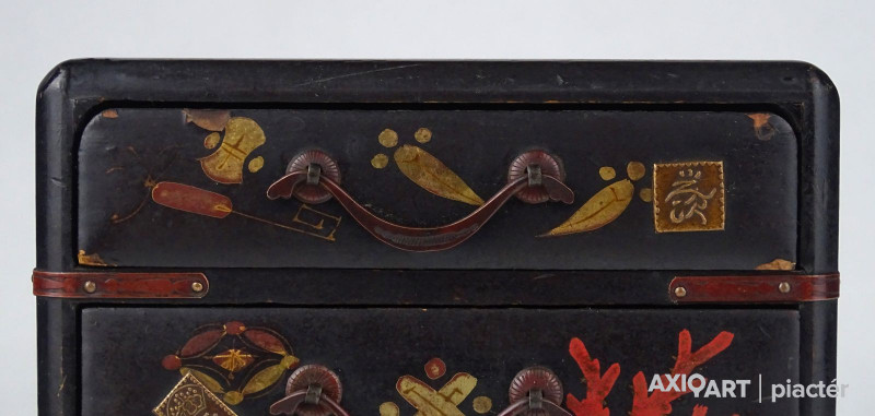Antik, szép állapotú, fekete színű japán ékszeres szekrény, ékszertartó. Nagyon dekoratív, vörösréz fiók fogantyúkkal rendelkezik. Két fiókon kaligrafikus vörösréz pici tábla, jelzés látható.