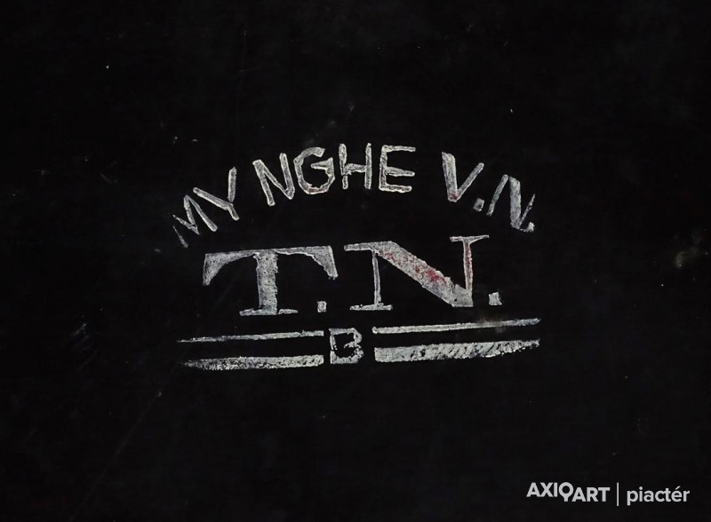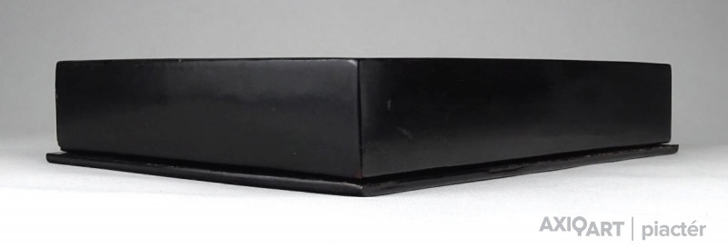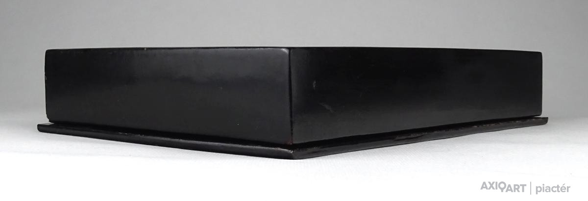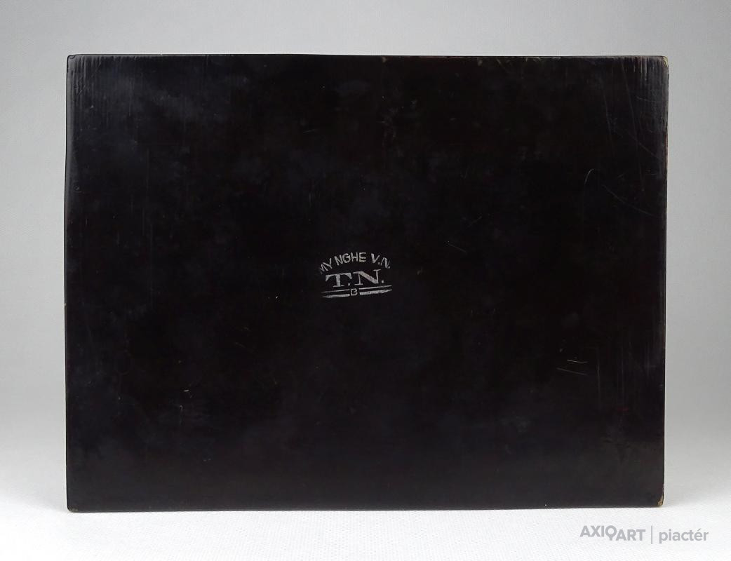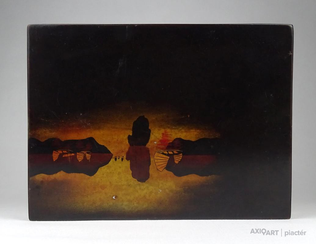 [1J112/Z059] Szép állapotú fekete lakkozott fa kártyadoboz, szivardoboz. Tetején vitorláshajókkal díszített kézi festésű tájkép. Alján jelzés: MY NGHE V.N. T.N. Magasság: 4.5 cm Szélesség: 18.3 cm Hosszúság: 24.2 cm Súly: 0.565 kg