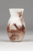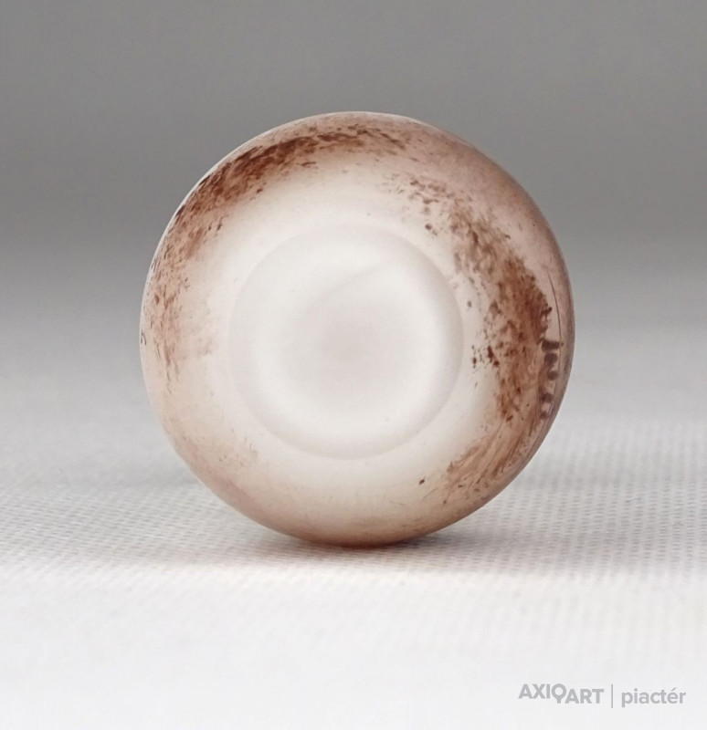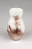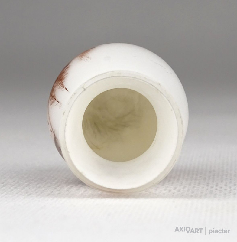 [0X674/Z022] Antik, szép állapotú, fehér és barna színű kétrétegű fújt üveg váza, ibolyaváza. Oldalán körben kézzelfestett tájkép házzal látható. Századeleji szecessziós darab. Magasság: 5.5 cm Szélesség: 3.3 cm Súly: 0.025 kg