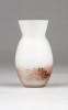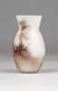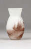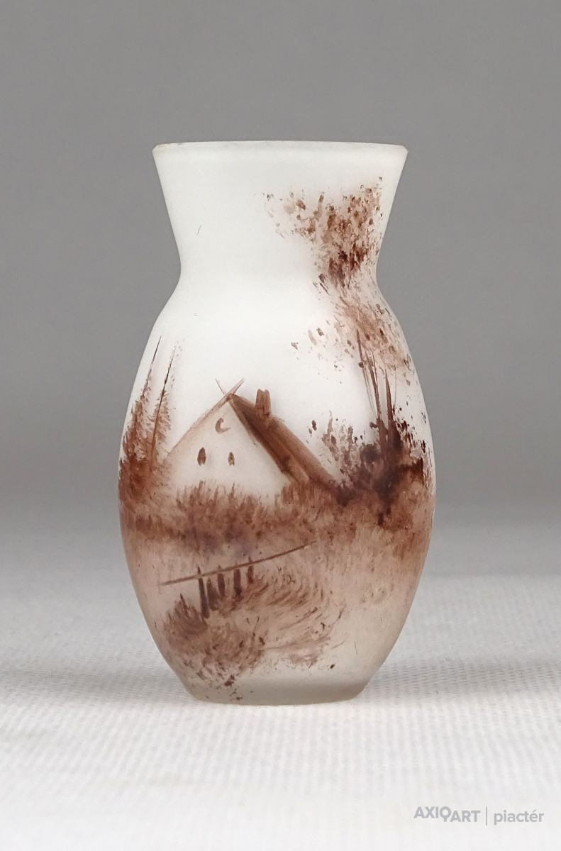 Antik, szép állapotú, fehér és barna színű kétrétegű fújt üveg váza, ibolyaváza. Oldalán körben kézzelfestett tájkép házzal látható. Századeleji szecessziós darab.
