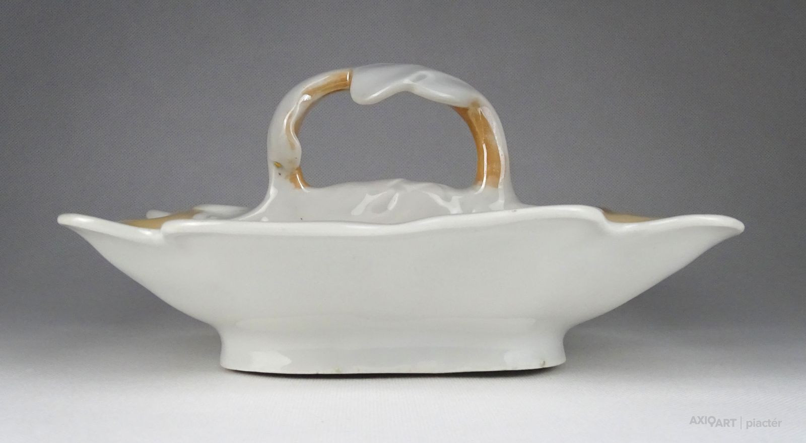 [1N579/X225] Hibátlan állapotú, jelzett porcelán figura. Ülő, galambot etető nő figura. Alján zöld Kőbányai Porcelángyár márkajelzés és felirat: KP KÉZIFESTÉS Kézifestés monogramja: ZM (Z.M.) Magasság: 12.7 cm Szélesség: 18.5 cm Súly: 0.305 kg Egy kis történelem Kőbányai Porcelángyár a hatvanas években, fekete-fehér képekből összeállítva, színezve; Fotó: ismeretlen   Az ős gyár Alois Miesbach X. Külső Jászberényi út 41. téglagyárának kibővítése révén jött létre. A termelés 1846.-ban indult meg és 1908.-ig kizárólag tégla, tetőcserép és keramit útburkoló kockákat gyártottak. A társulat a fajansz- és porcelángyárat 1908.-ban hozta létre. A termelés főként falburkoló áruk, műszaki és egészségügyi porcelánok készítésével folyt. A díszmű gyártás, bár erről pontos adatok nem állnak rendelkezésre, a húszas évek elejéig tarthatott és 1936.-ig a Porcelángyár újraindításáig megint csak ipari és egészségügyi árut termelt. 1936.-tól ismét beindult a díszműgyártás. A gyárat 1941.-ben hadiüzemmé nyilvánították, majd 1944.-ben súlyos bombatalálat érte. A termelés a szovjet parancsnokság alatt 1945.-ben indult be újra. 1949.-ben a Kőszénbánya és Téglagyár Társulat Pesten (azelőtt Drasche) államosításakor három téglagyárra, egy tűzállógyárra és a Drasche Porcelángyár Nemzeti Vállalatra osztották.   A gyár profilja műszaki porcelán, edény és díszműporcelán lett. 1949. május 31-től a Nagybátony-Újlaki Téglagyár telepén működött elektrokerámiai üzemet átadták a Porcelángyárnak. Ezzel egy időben megkezdődött Kőbányán a szteatit szigetelők és pirolit nevü hőtechnikai szigetelők gyártása is. Az elektrokerámiai (híradástechnikai) üzemet először a megszűnt edénygyár területére helyezték, később 1953 végén külön épületet kapott. Fotó: ismeretlen, 1975, a kémény mögött a magas Drasche lakóházon jól látszik a később épített felső szint, az utca felé a gyár épületén még csak a vörös csillag van, nincs ott a nagy "Finomkerámiaipari Művek", aminek a helyére a KŐPORC felirat került később. Fotó: archivum.mtva.hu, 1961, Liget utcai telephely 1950-51-ben új laboratórium épült a gyárban. A modern 5 szintes épületben az anyagvizsgáló kémiai laboratóriumon kívül itt kapott helyet a híradástechnikai fejlesztés-, és vizsgálólabor, valamint új nagyfeszültségű vizsgálólabor is. A gyárban a termelést gyáregységekbe szervezték. Így alakult ki a porcelán, a híradástechnikai és gépészeti gyáregység. A gépészeti gyáregységben a folyamatos karbantartási munkák mellett jelentős helyet foglalt el a gépfejlesztés, azaz új célgépek és kemencék tervezése és kivitelezése. A híradástechnikai gyáregység részére terveztek és készítettek számos speciális gyártó és szerelő gépet, automatákat. Fotó: ismeretlen, a massza üzem eleje Fotó: ismeretlen, a mai Porcelán utca a 70-es években 1951 Kőbányai Porcelángyár lett a gyár neve. 1954-ben a megszűnt Solus Csiszolókoronggyár kőbányai Liget utcai telepét a gyárhoz csatolták, ahol sajtolt porcelánszerelési cikkeket, porcelán díszműárut, kordierit-, és pirolit hőtechnikai termékeket állítottak elő. 1969-ben a Budapesti Porcelángyár nógrádverőcei telepét a gyárhoz csatolták, ahol laboratóriumi porcelánokat gyártottak. A Liget utcai telepet 1969-ben átadták a Hollóházi Porcelángyárnak, ezzel megszűnt a díszmű gyártás. A festést végző dolgozókkal együtt a tervező csapat is a Hollóházi Porcelángyárhoz került. A széntüzelésű, szennyező kemencéket bezárták. Fotó: ismeretlen, 1976(?), főbejárat A híradástechnikai gyáregységben a kísérleti és kutatómunka alapján megkezdték a csőkondenzátorok gyártását. Ezek égetésére előbb egy periódikusan működő, gáztüzelésű (Pb-gáz), majd egy folyamatos üzemű gáztüzelésű, tolólapos kemencét építettek. 1957-ben megkezdték a trimmer kondenzátorok gyártását. Úgyszintén eredményesen végződtek a lágymágnes-ferrit termékek gyártására megindított kísérletek is és ferrit gyártó üzem létesült. Fotó: ismeretlen, 1982 előtt 1959-60-ban jelentős beruházások kezdődtek. Megkezdődött a porcelán gyáregység rekonstrukciója. Ennek keretében újjáépítették, ill. korszerűsítették a nyersanyagtárolót és a porcelánmassza üzemet. 1970-ben sajtolómassza előkészítésére porlasztószárítási (atomizer) technológiát vezettek be. Fotó: ismeretlen, 1976(?) A gyár 1960-ban új telephelyet létesített Balassagyarmaton, ahol saját tervezésű és készítésű célgépekkel kondenzátor termékeket gyártottak. A IV. ötéves terv keretében Debrecenben és Bernecebarátiban létesült híradástechnikai üzem. Fotó: Bognár József - KŐPORC 1836-1988, 1982(?)   1982 Átnevezik KŐPORC Elektronikai Alkatrész és Műszaki Kerámiagyártó Vállalat névre a gyárat. A kilencvenes évek felé az elektronika-technikai fejlődés annyira felgyorsult, hogy a hagyományos termékek folyamatosan kiszorultak a piacról. Ez és a KGST piac összeomlása azt eredményezte, hogy a gyár fokozatosan megszűntetni kényszerült először a vidéki telephelyeit, majd Budapesten is megszűnt a híradástechnikai termékek gyártása. A porcelánszigetelő gyártmányok iránt is csökkent a kereslet, ezért a porcelán gyáregység átszervezésére is sor került. Fotó: ismeretlen, 1982 előtt, még a FINOMKERÁMIAIPARI MŰVEK felirat látható 1990 Megkezdődött a privatizáció. A minisztériumi felügyelet átkerült az Állami Vagyonügynökséghez. Az új vevő a termelést leállította és nem is kívánta folytatni. Az értékes berendezések jelentős része tönkrement, a kemencéket lebontották, fejlesztési laboratóriu