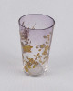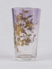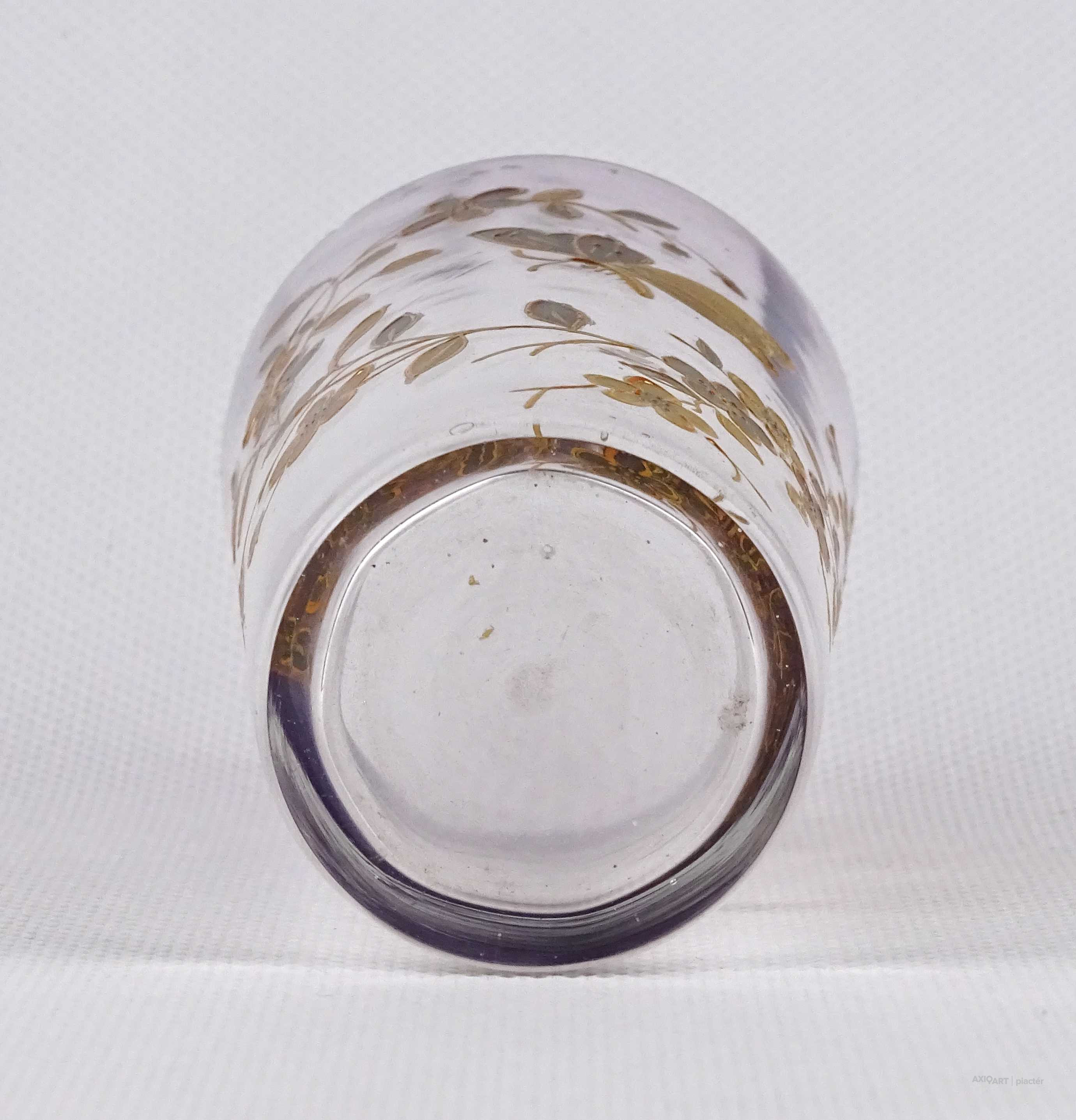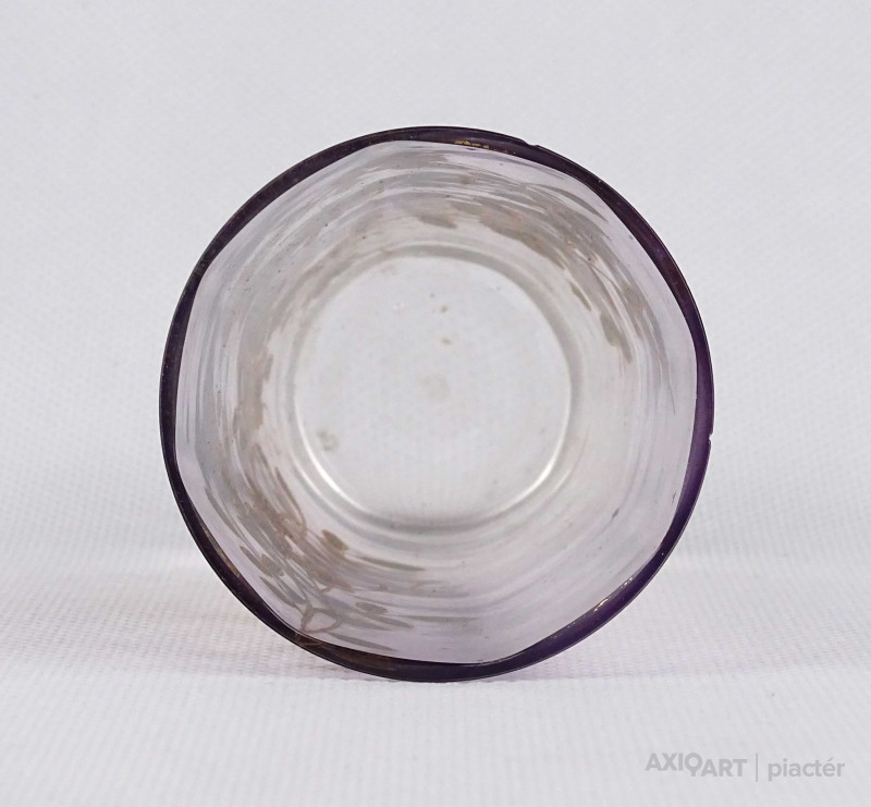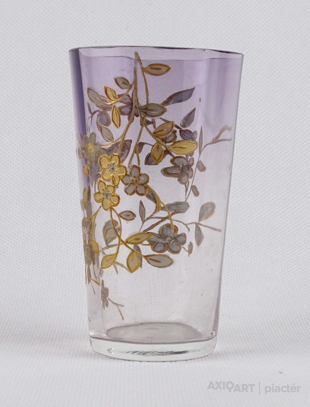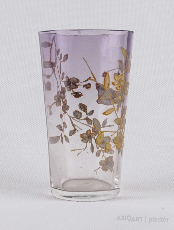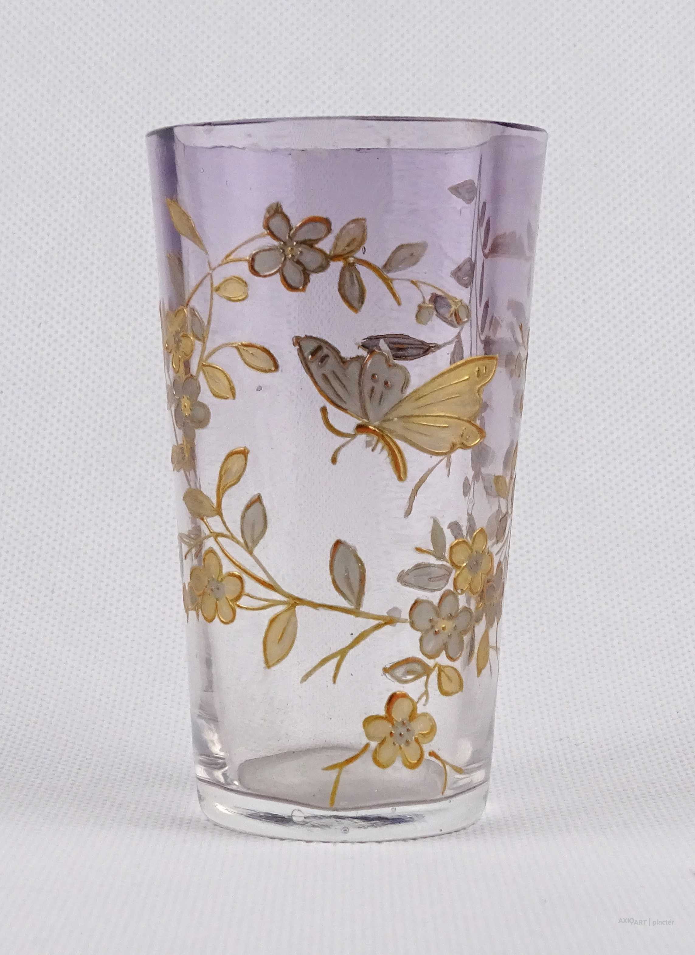 Antik, kézi festéssel díszített, belülről fazettált, fújt üveg pohár a XIX-XX. század fordulójáról. Oldalán, kézzel festett, aranyozott virág és pillangó mintás díszítés.