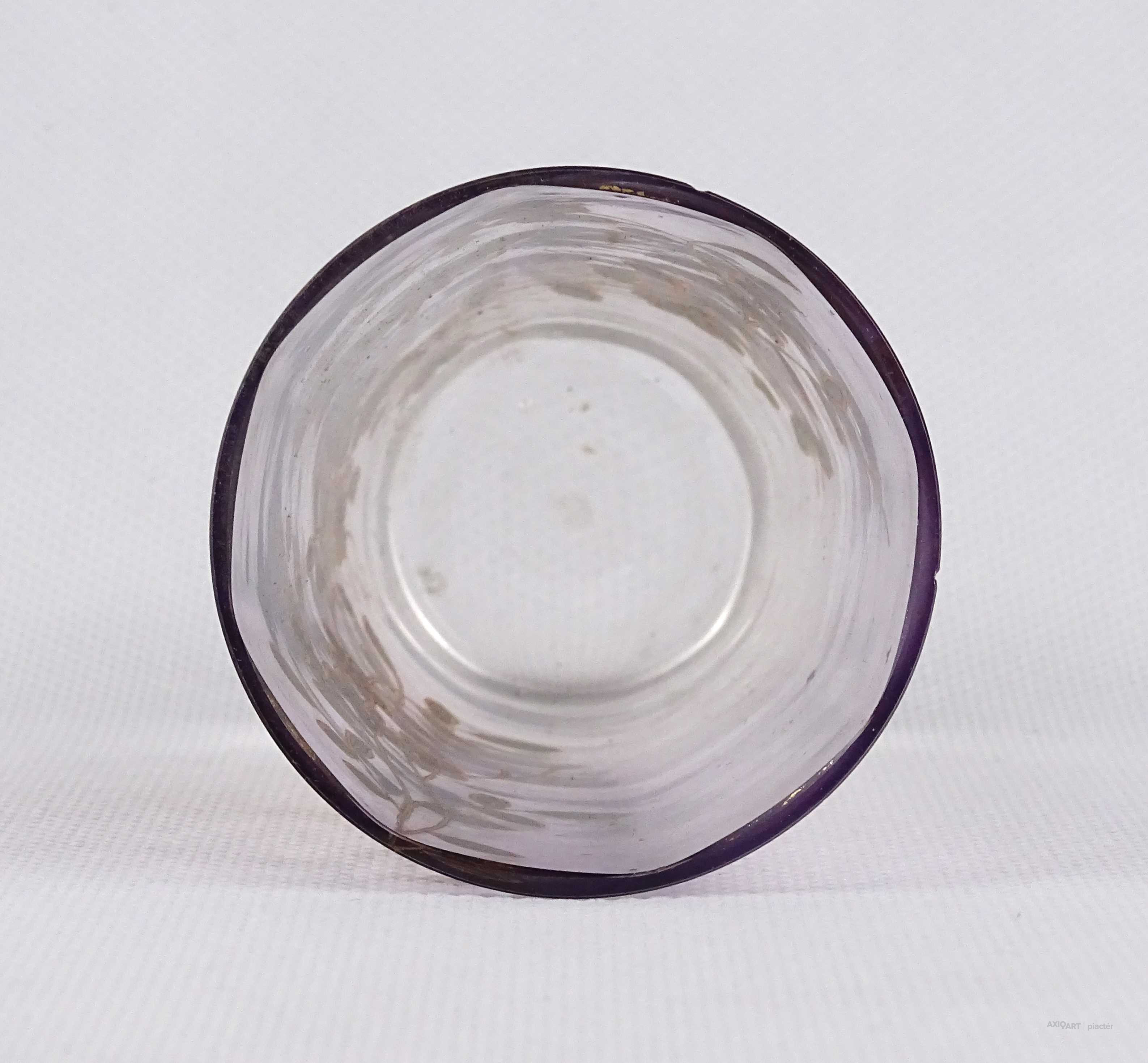 [1W500/X117] Antik, kézi festéssel díszített, belülről fazettált, fújt üveg pohár a XIX-XX. század fordulójáról. Oldalán, kézzel festett, aranyozott virág és pillangó mintás díszítés. Magasság: 9.8 cm Szélesség: 5.7 cm Súly: 0.09 kg