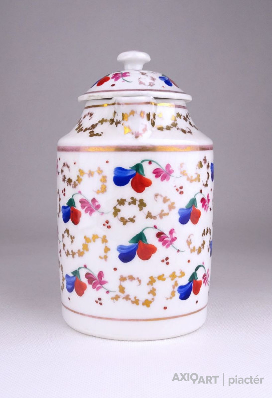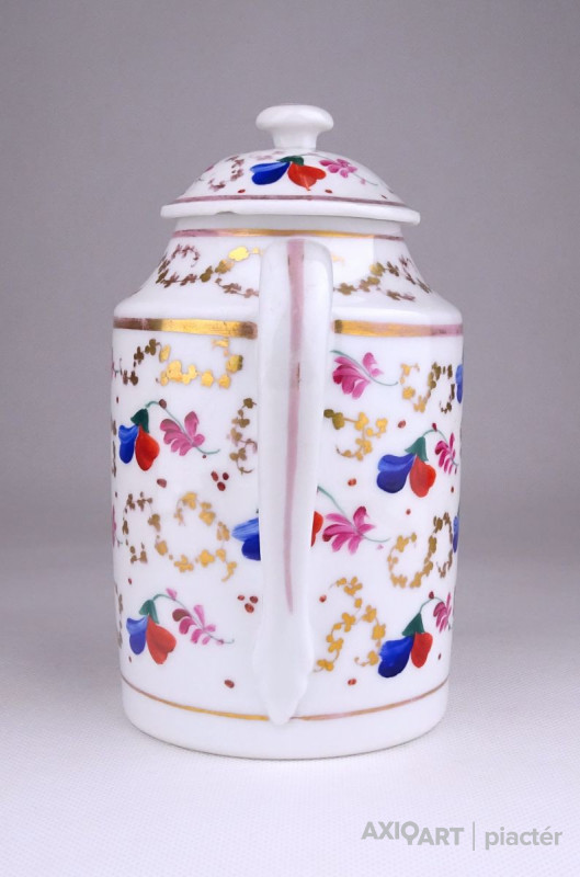 Antik, kézi festésű, gazdagon aranyozott, virágmintás, hibátlan porcelán kiöntő, az 1800-as évek második feléből. Eredeti teteje is megvan.