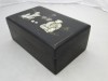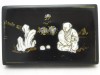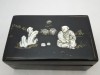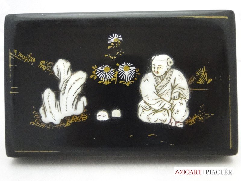 Nagyon régi, fekete színű lakkdoboz, tetején csiszolt kagylódíszítés, japán emberábrázolás.