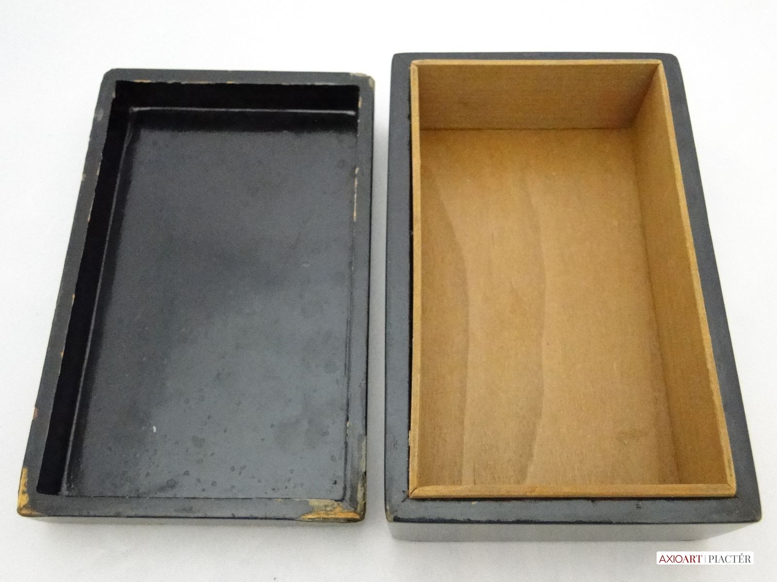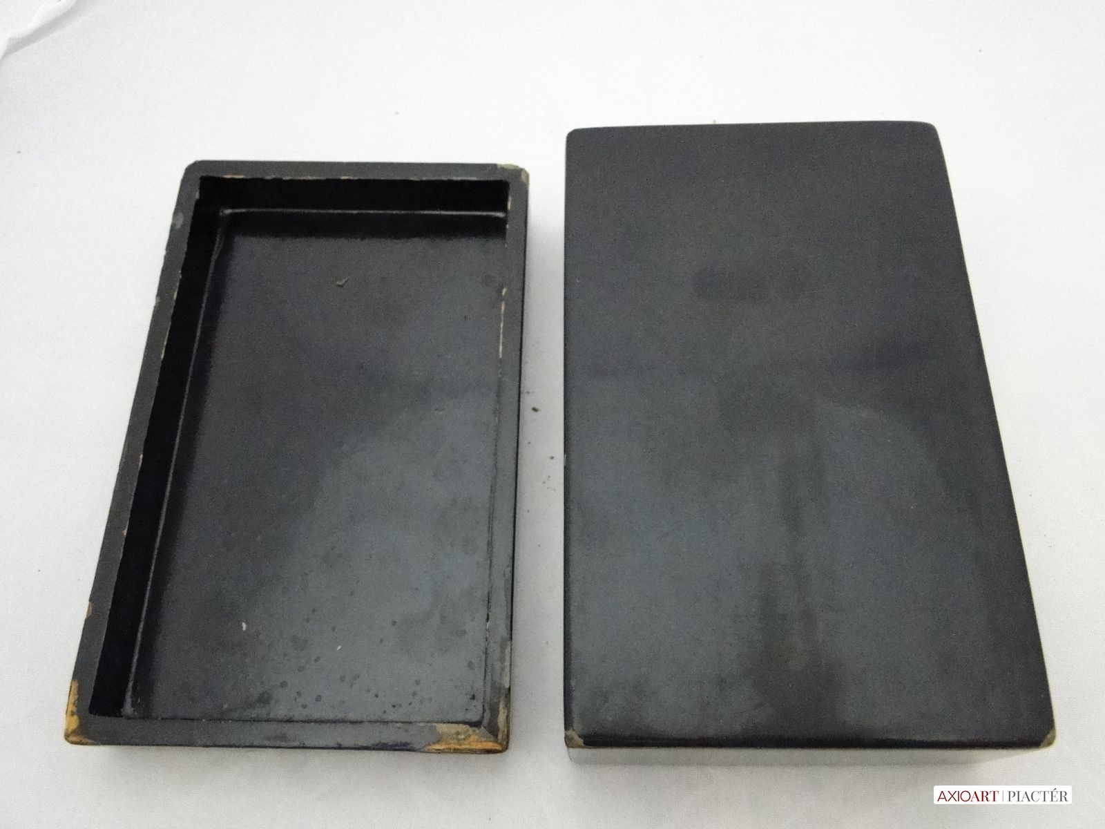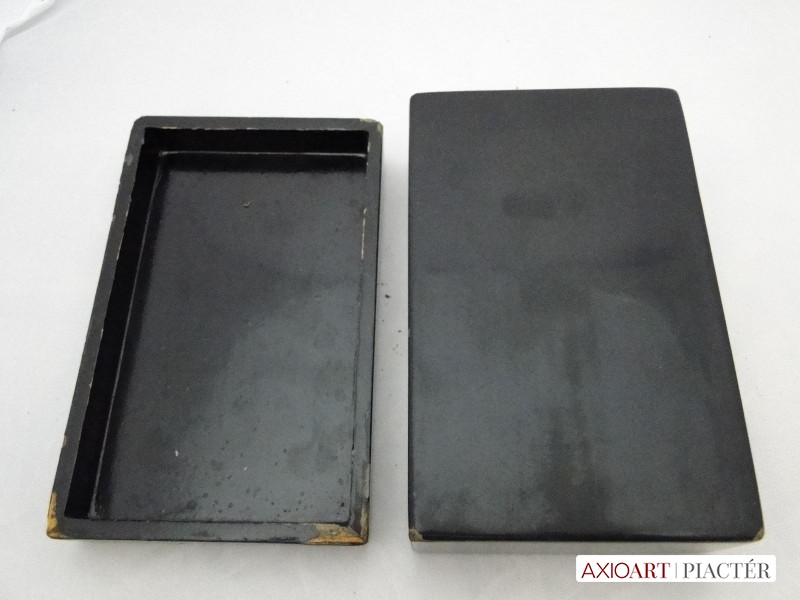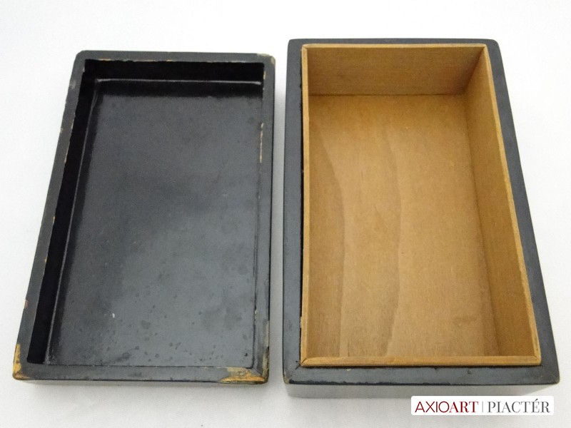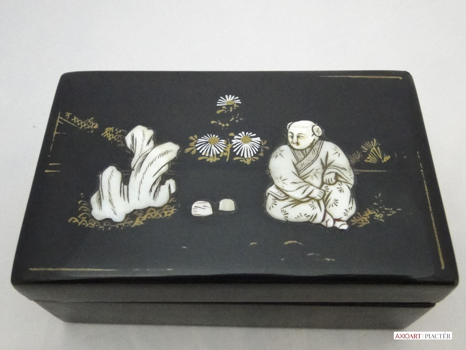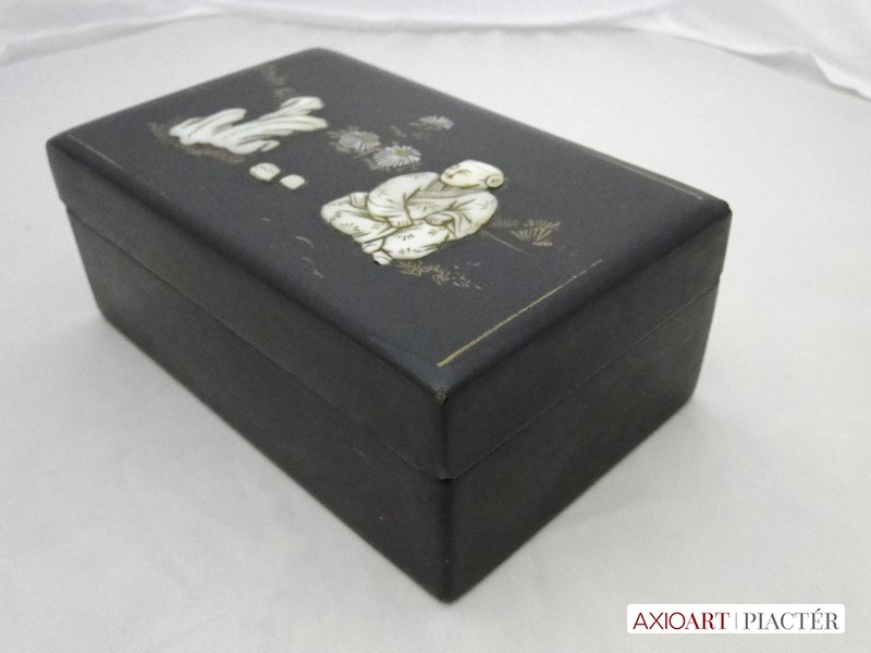 [7862/BX-2] Nagyon régi, fekete színű lakkdoboz, tetején csiszolt kagylódíszítés, japán emberábrázolás. A doboz fedelének peremén, sarkain kopásnyomok találhatóak, lásd fotó. Magasság: 5.5 cm Szélesség: 8.5 cm Hosszúság: 13.5 cm Súly: 0.385 kg A doboz belső mérete: 6,8 x 12 x 3,3 cm.