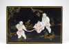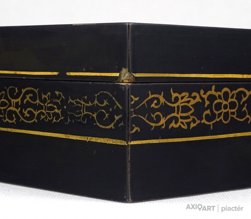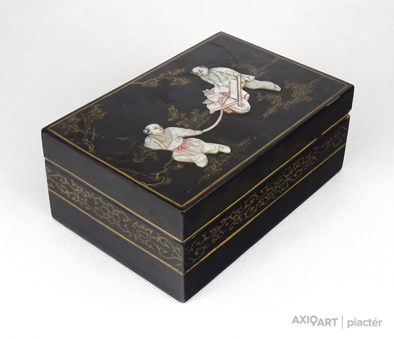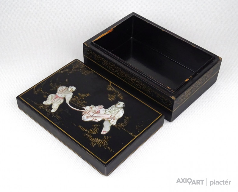 Nagyon régi, fekete színű lakkdoboz, tetején csiszolt kagylódíszítés, japán emberábrázolás.