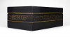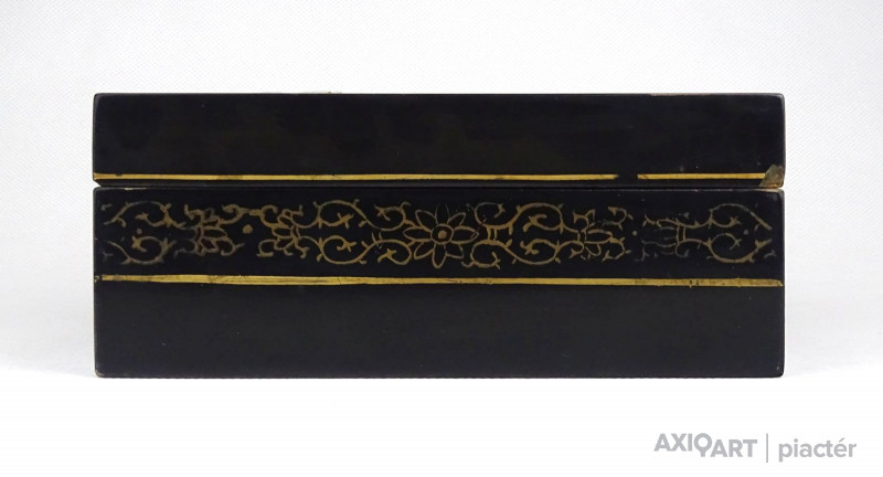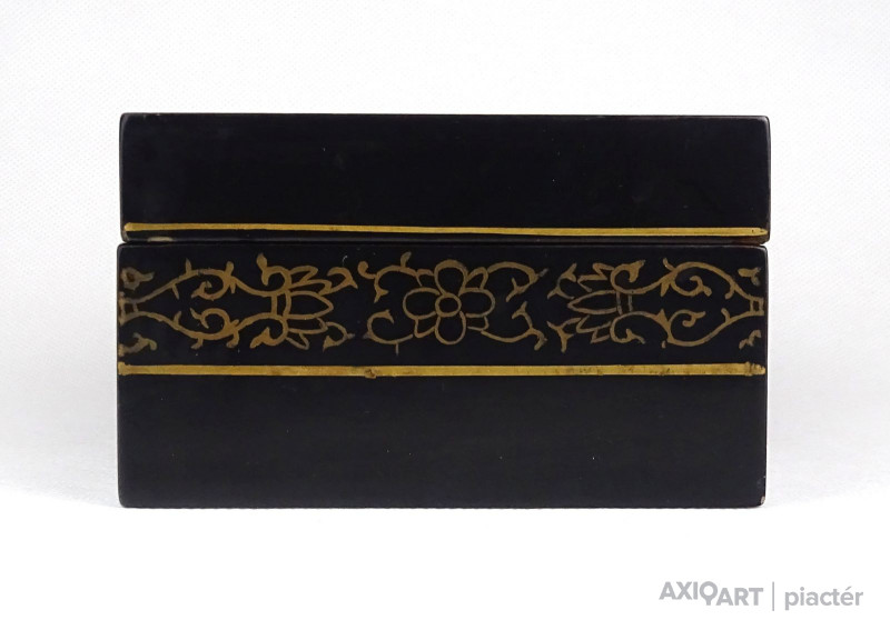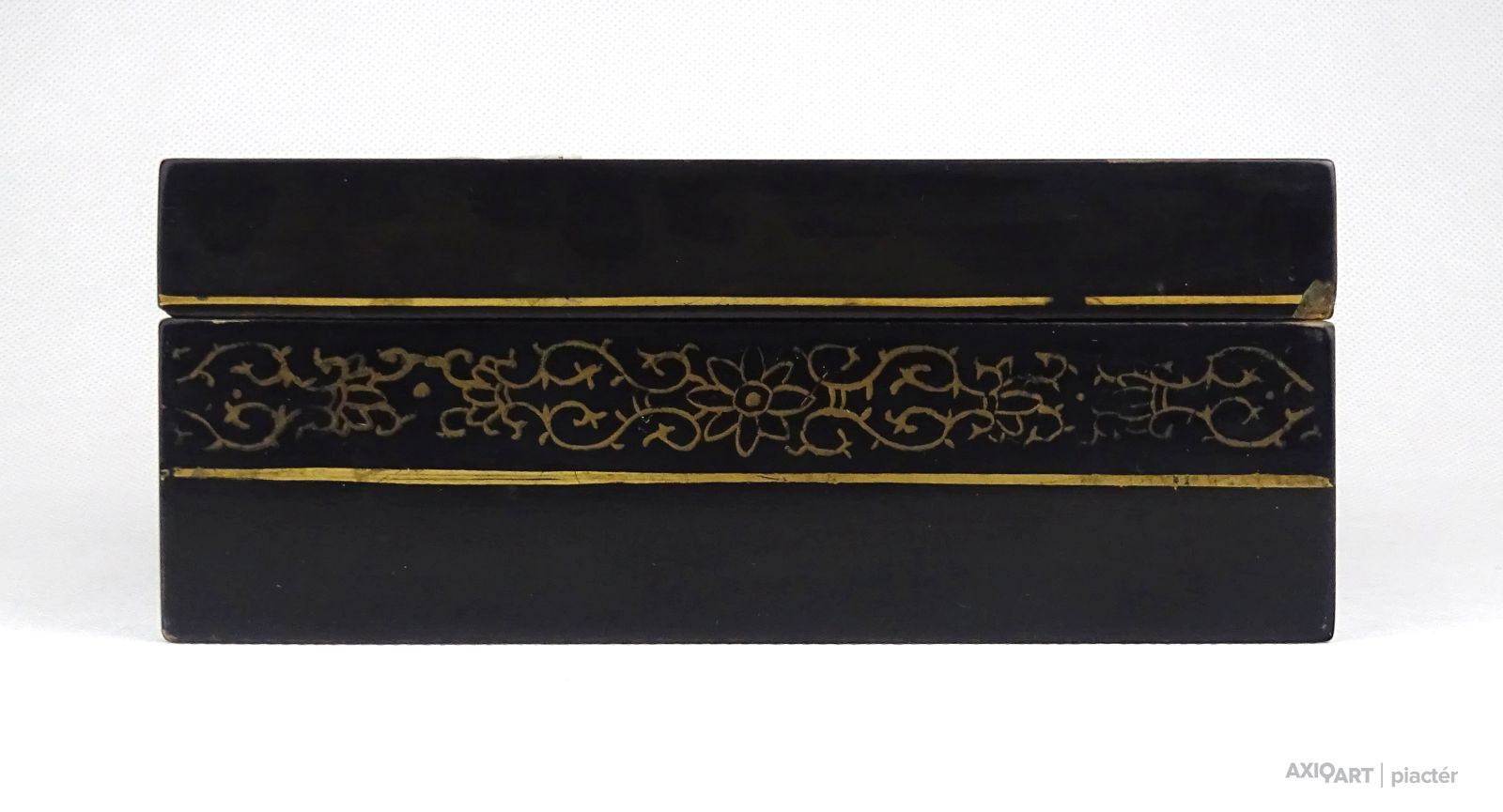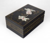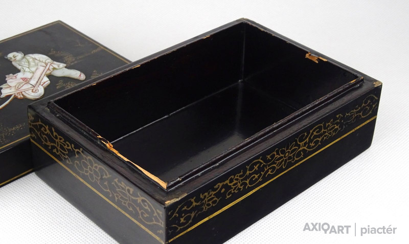 [1D828/X012] Nagyon régi, fekete színű lakkdoboz, tetején csiszolt kagylódíszítés, japán emberábrázolás. A doboz belső peremén, kisebb sérülések találhatóak, lásd fotó. Magasság: 6.5 cm Szélesség: 10.5 cm Hosszúság: 15.5 cm Súly: 0.235 kg
