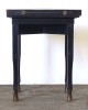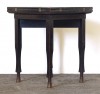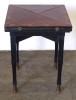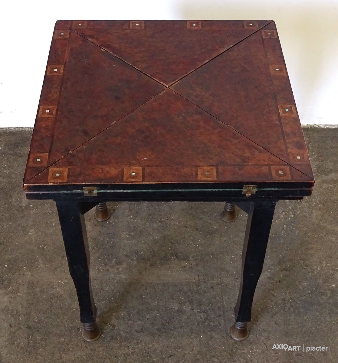 [0U700/UZ-N] Antik, bronz papucsos, bécsi szecessziós kinyitható játékasztal, kártyaasztal. Tetejét apró csiszolt gyöngyház berakás díszíti. Szerkezet stabil, szú mentes. Felületén cserélt zöld posztó található. Magasság: 74.5 cm Szélesség: 60 cm Hosszúság: 60 cm