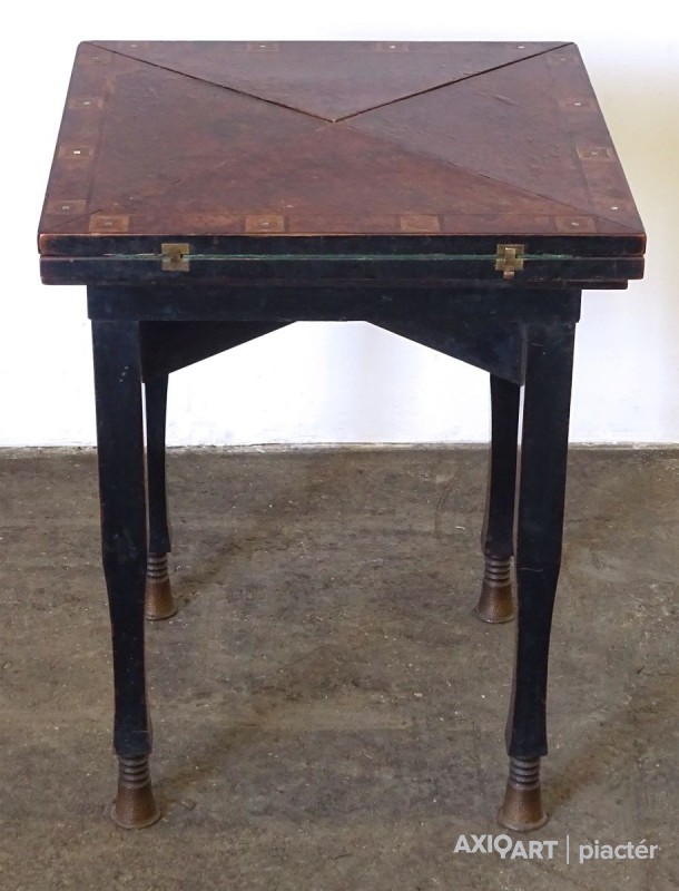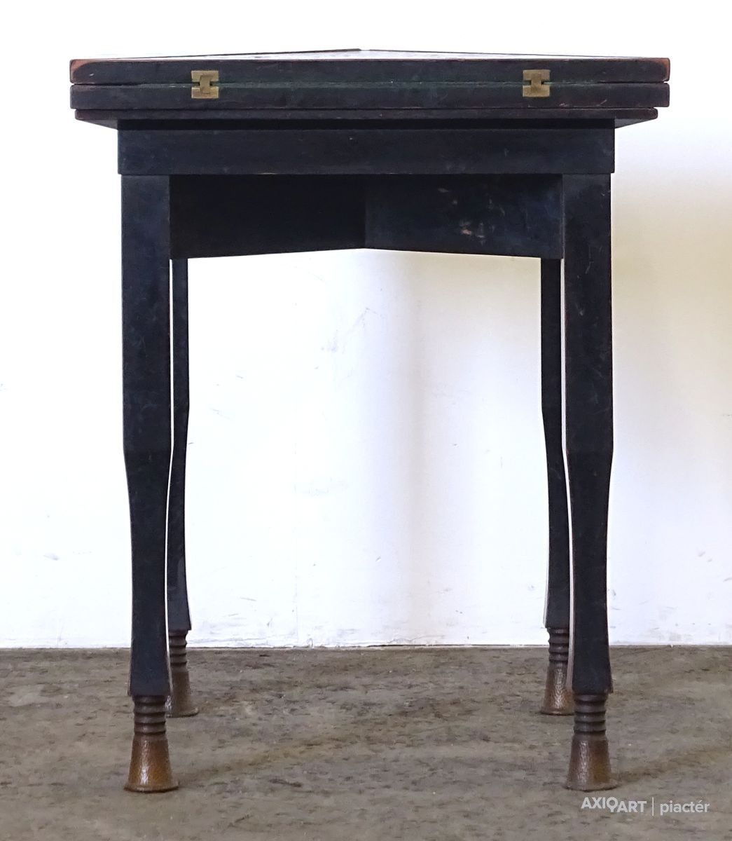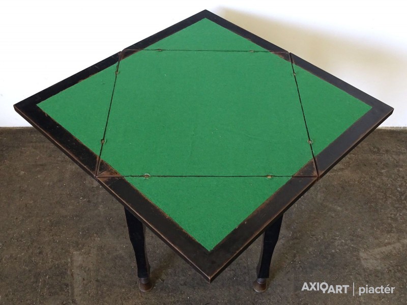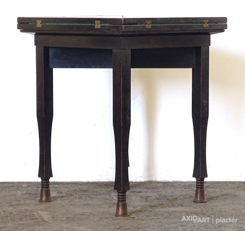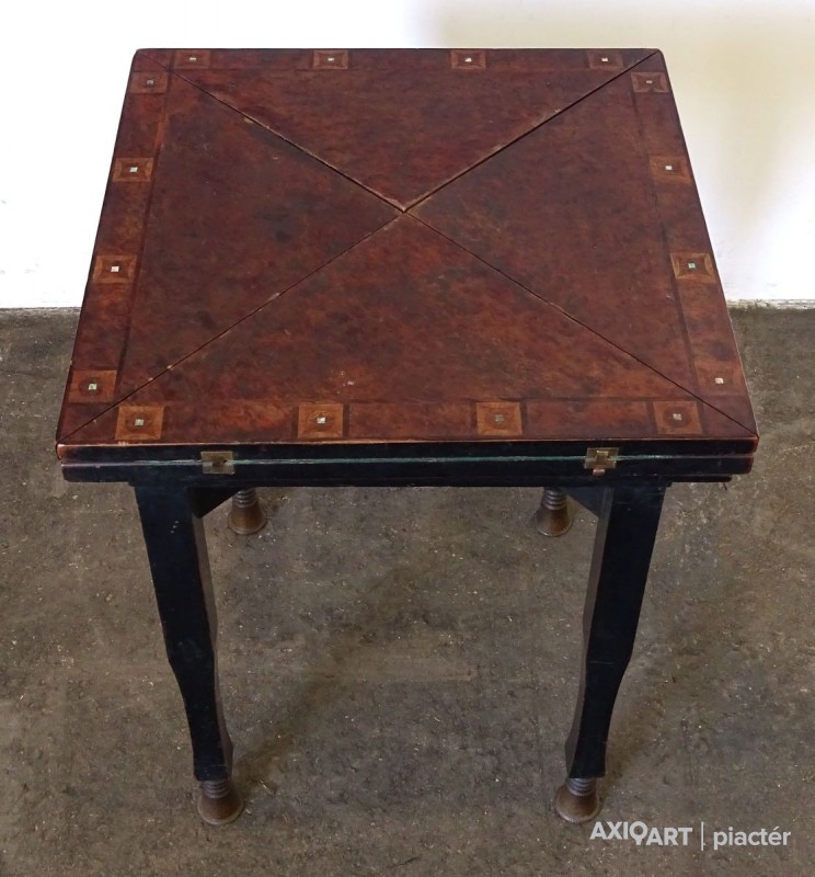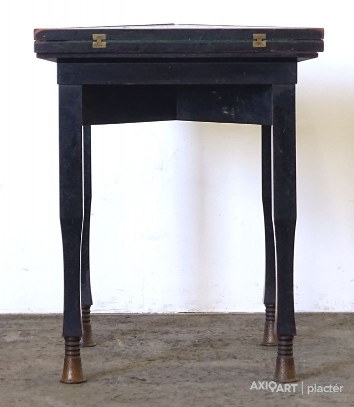Antik, bronz papucsos, bécsi szecessziós kinyitható játékasztal, kártyaasztal. Tetejét apró csiszolt gyöngyház berakás díszíti. Szerkezet stabil, szú mentes. Felületén cserélt zöld posztó található.