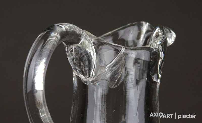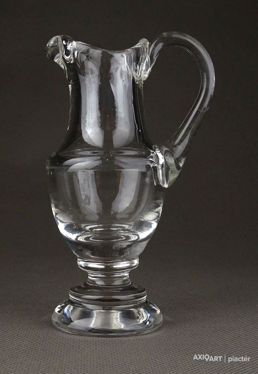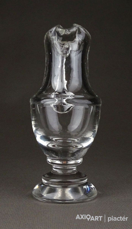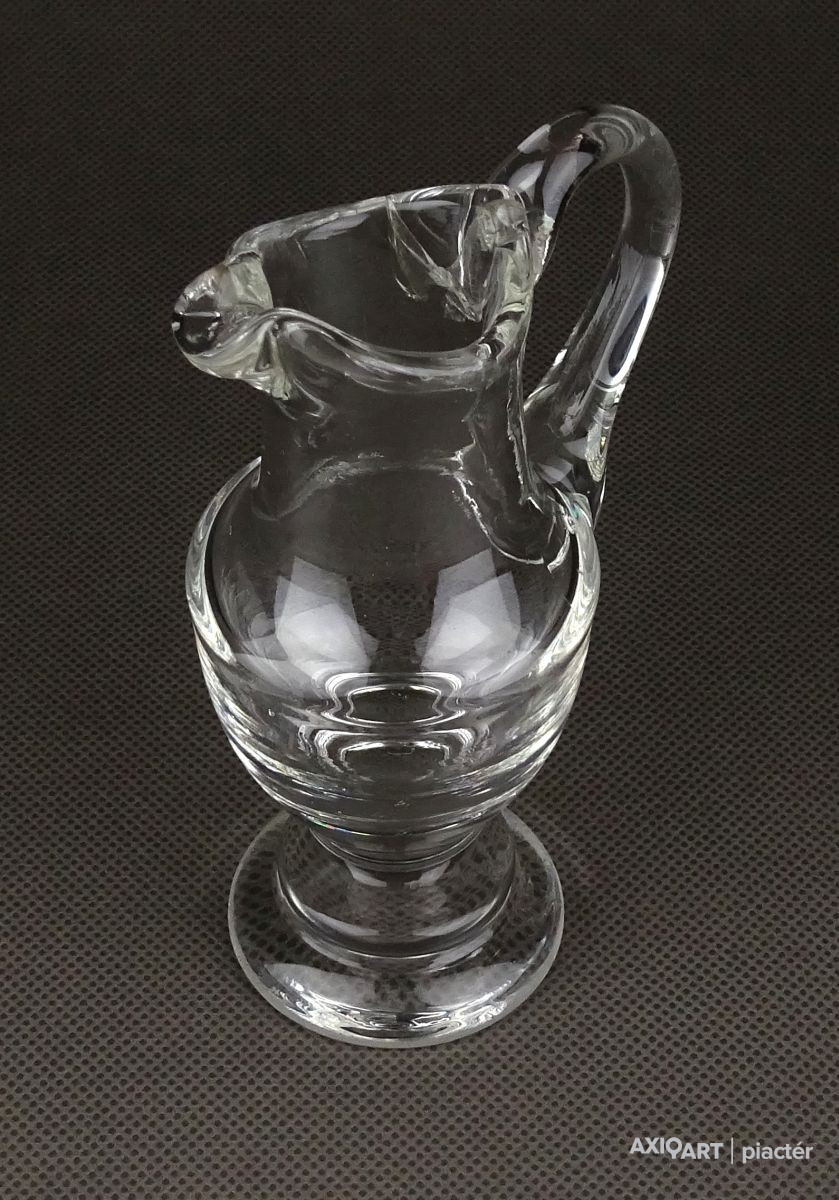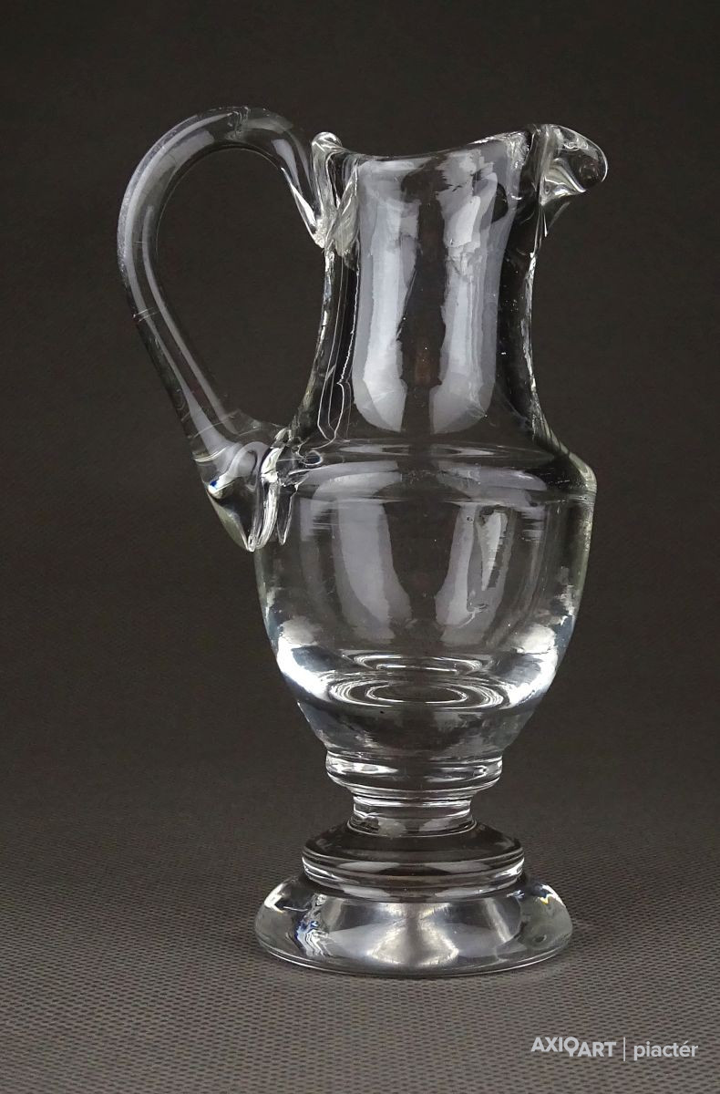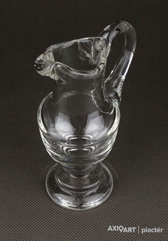 Antik, szép állapotú, kis méretű, vastag falú olajos vagy ecetes asztali kínáló. Fújt üveg kiöntő. A fül felső felénél sérülés található, lásd fotó.