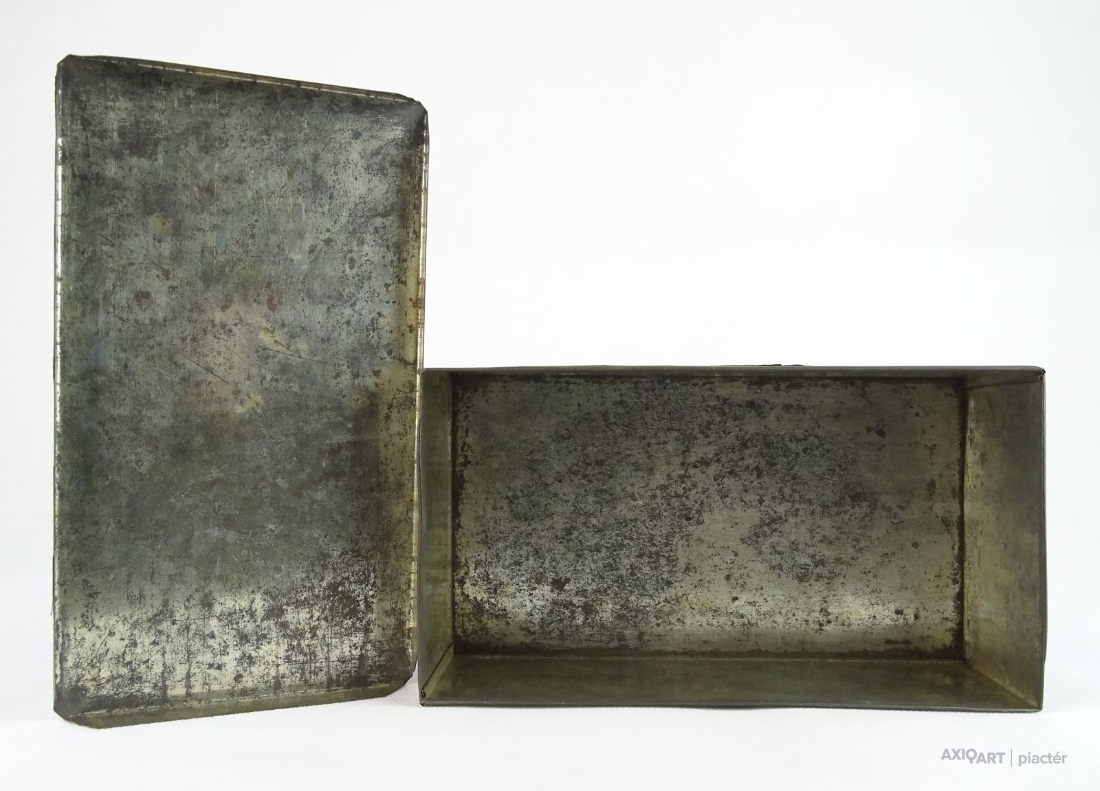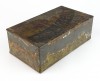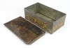 Nagyon régi teasütemény, keksz tartó fémdoboz, pléhdoboz. A doboz felületén töredékes papír alapú díszítés található, feliratokkal: