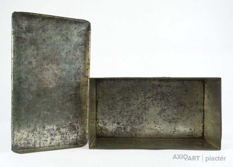 [0T401/X172] Nagyon régi teasütemény, keksz tartó fémdoboz, pléhdoboz. A doboz felületén töredékes papír alapú díszítés található, feliratokkal: KOESTLIN-KEKS HERGESTELLT MIT FEINSTER TEEBUTTER GYŐR/WIEN Magasság: 7 cm Szélesség: 11.5 cm Hosszúság: 20.5 cm Súly: 0.235 kg