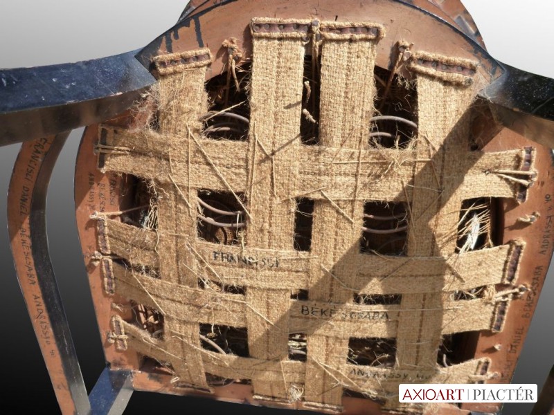 Szerkezetileg ép, a kanapé oldalsó dísz pálcikáiból 2 hiányzik, könnyen pótolható, esztergáltatható.