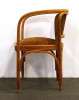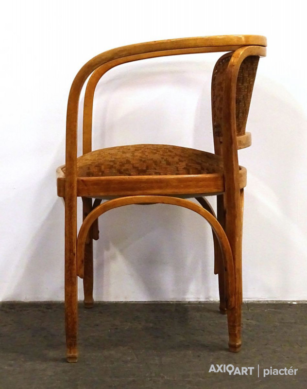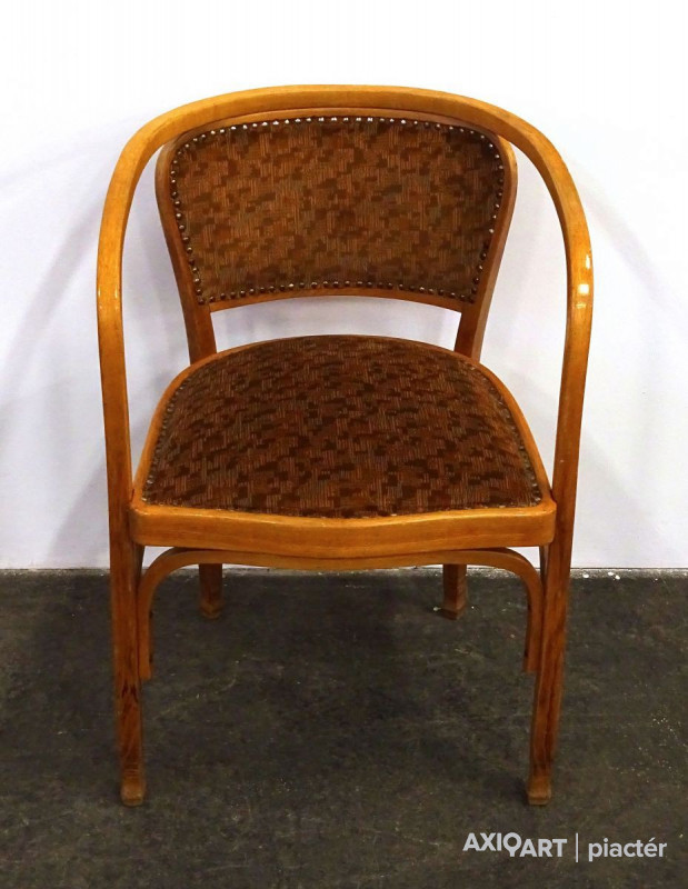 Antik, hajlított támlás, cseresznye színű, szecessziós alacsony támlás, kör karfás szék. Kohn vagy thonet forma, kárpitozott, felújítatlan állapotban. Az ülőfelülete kényelmes, rugós, afrikkal tömött.