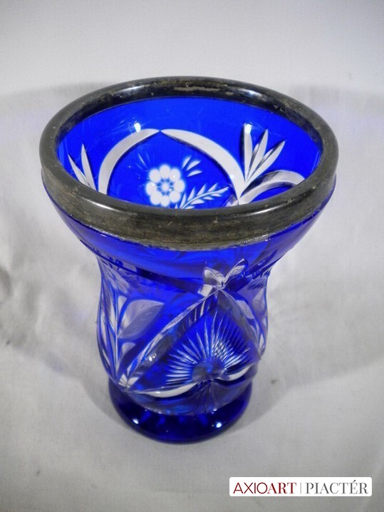 [P074/VTR-G] Hibátlan állapotú, 1800-as évekből való kék színezett kristály pohár, peremén ezüst díszítés. Magasság: 13.5 cm Szélesség: 9.5 cm