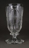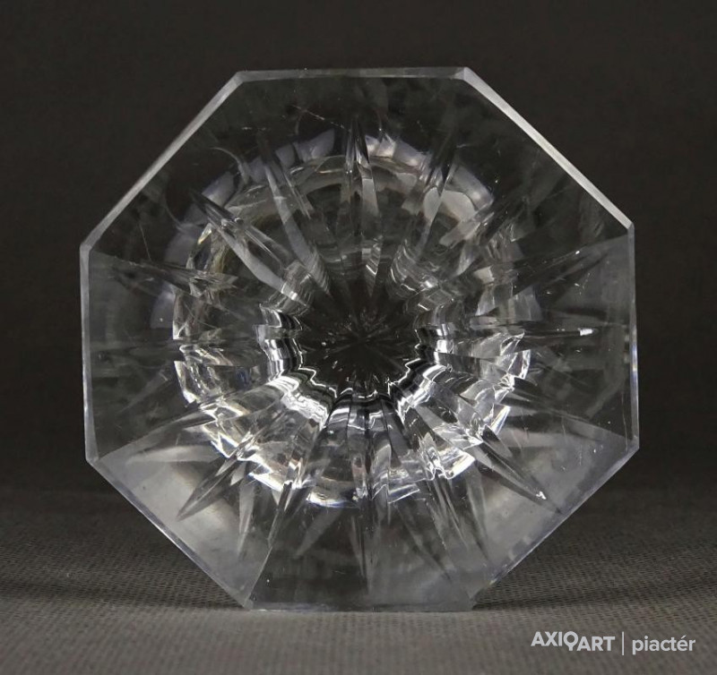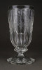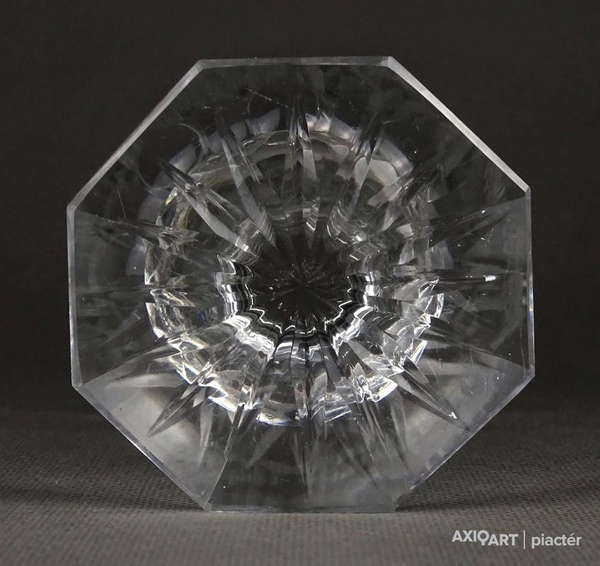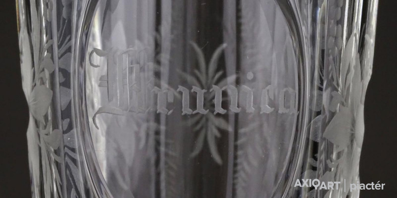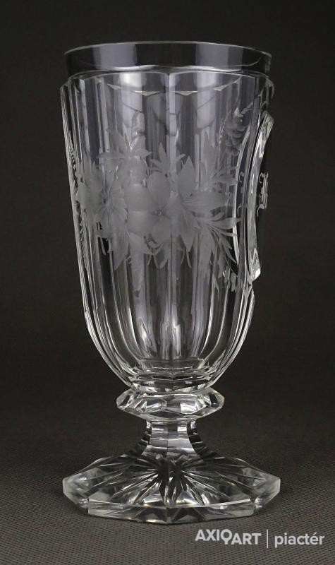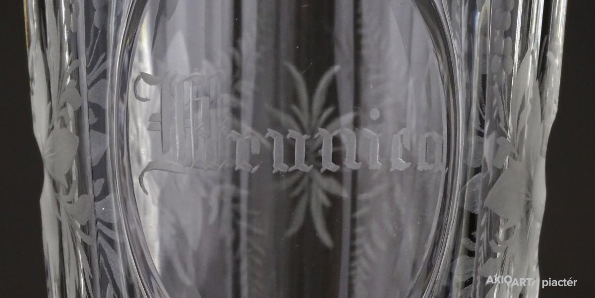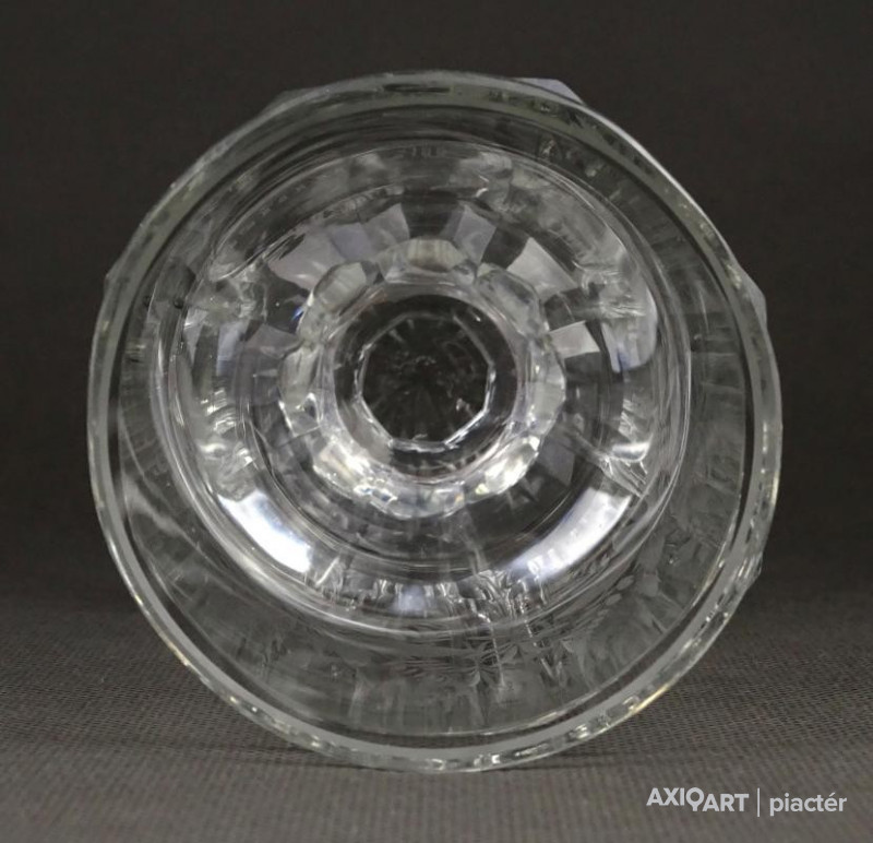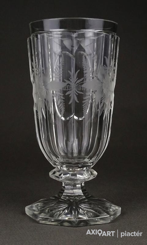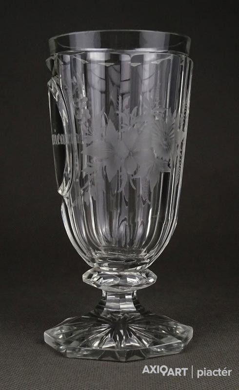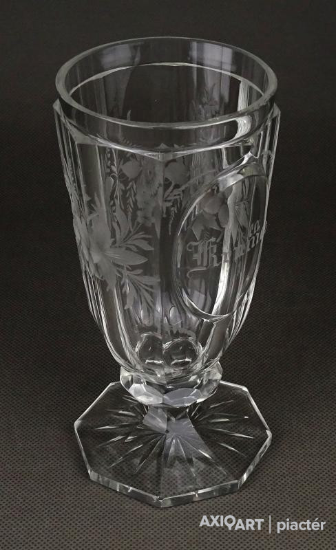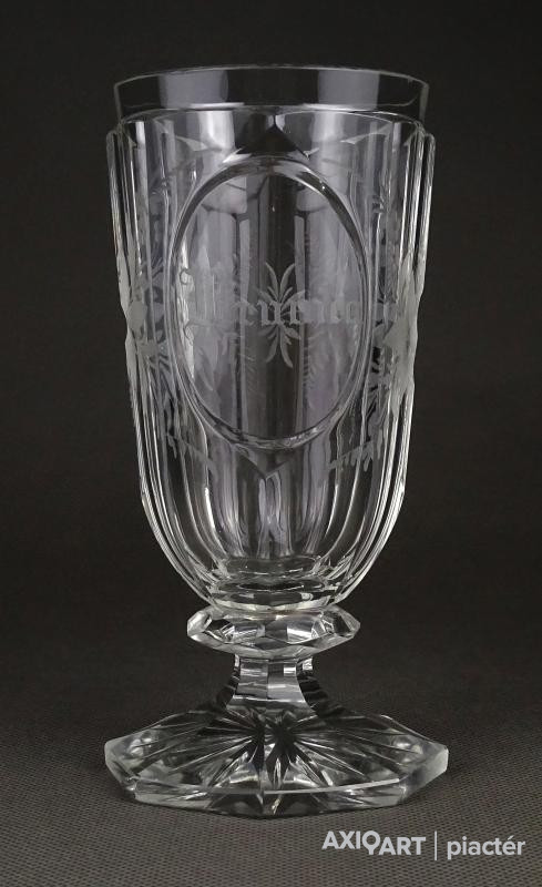 Antik, hibátlan állapotú, nyolc lapra csiszolt talpas, feliratos kúrapohár.