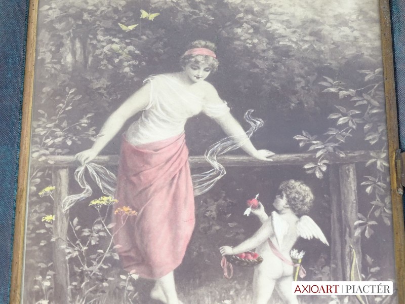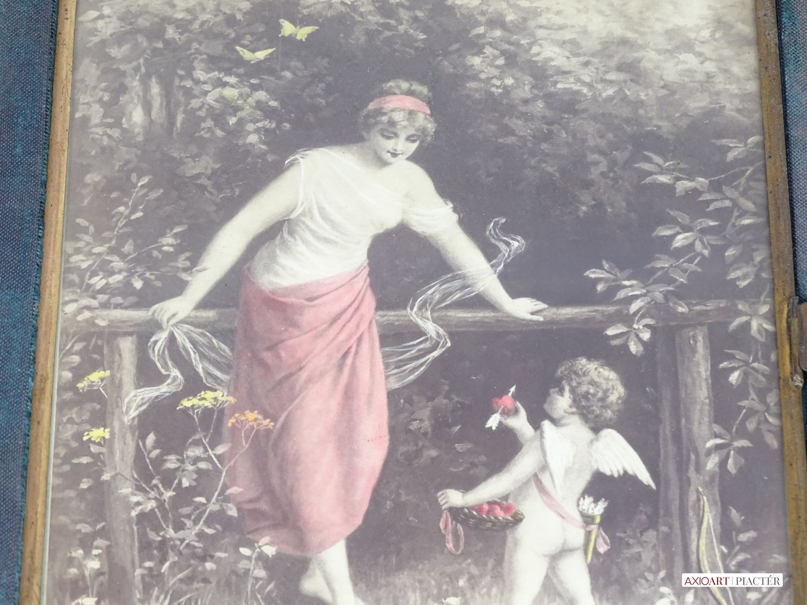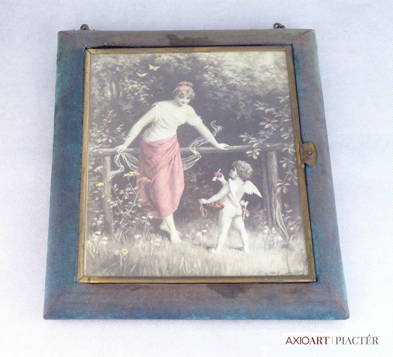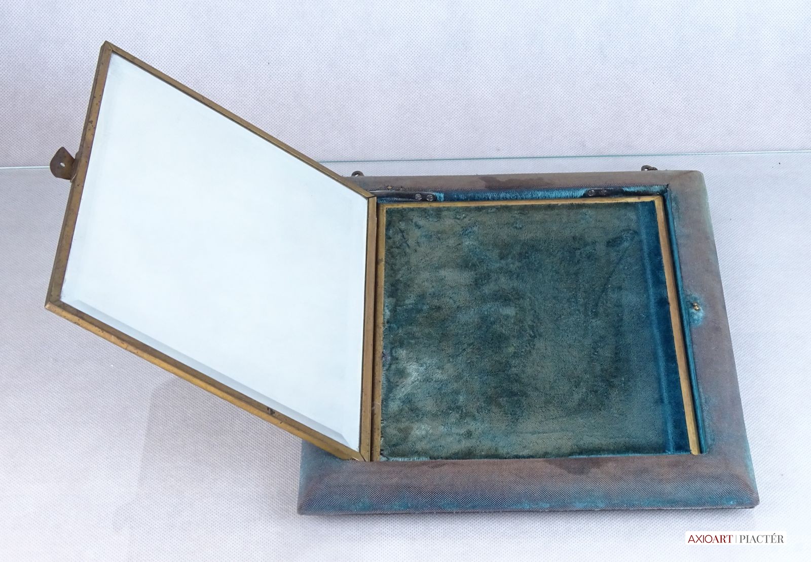 Fedlapján kívülről egy Ámor jelenet látható réz keretben. Ezt kihajtva szép állapotú metszett, fazettázott kétszárnyú tükör található.