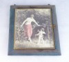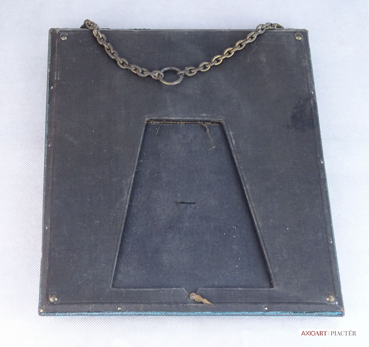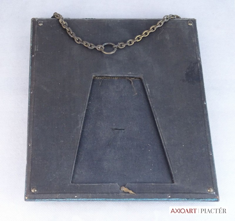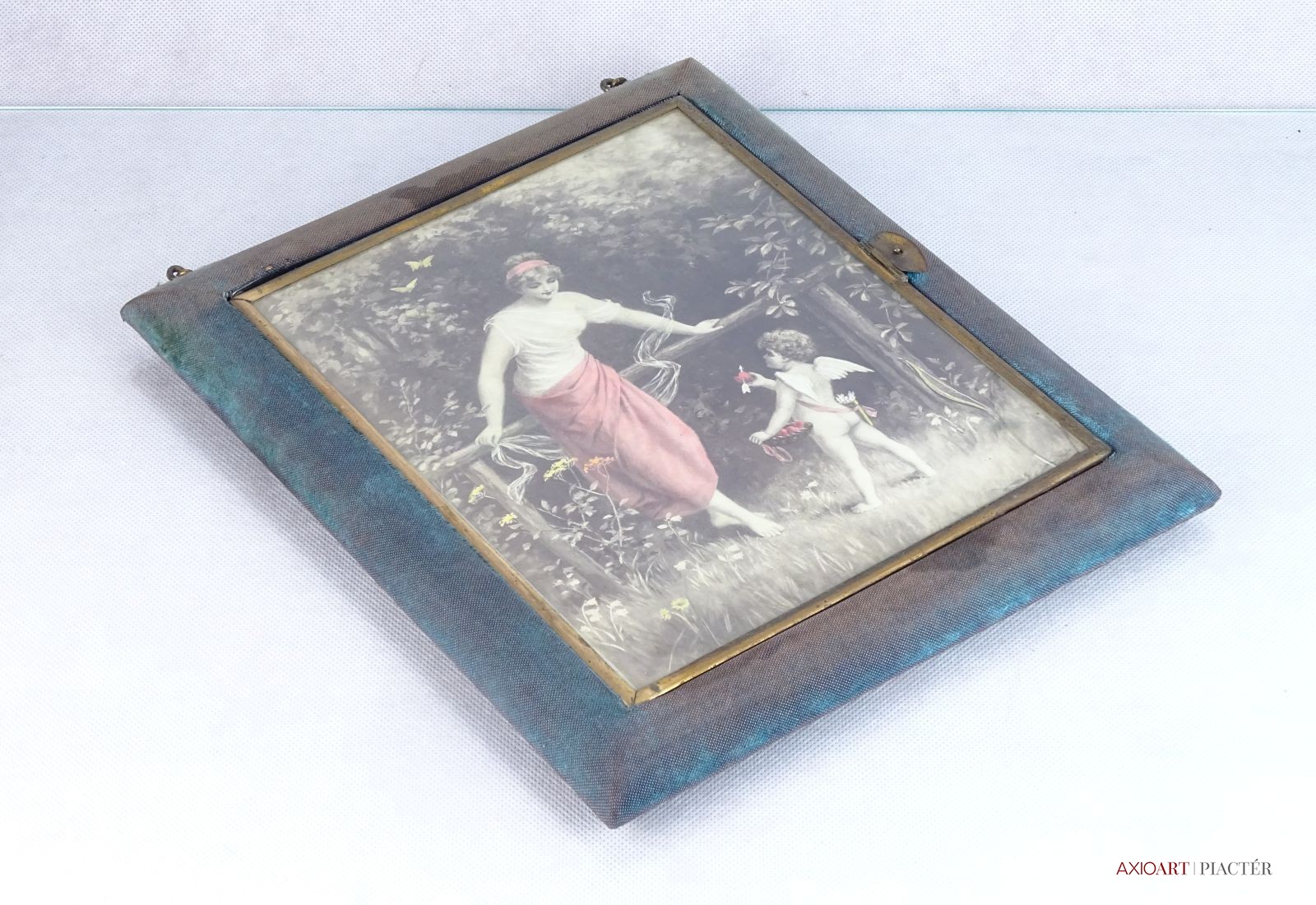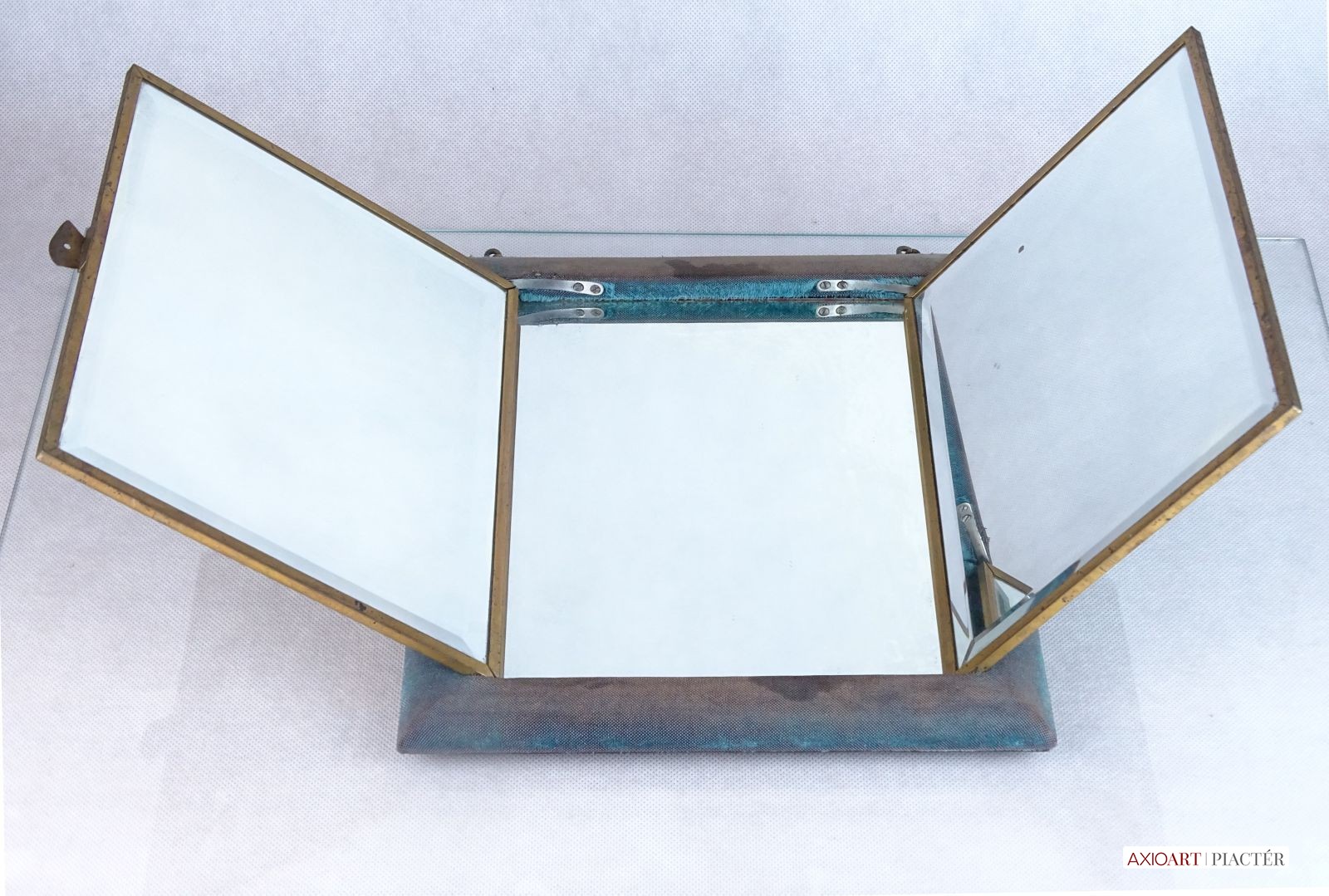 Fedlapján kívülről egy Ámor jelenet látható réz keretben. Ezt kihajtva szép állapotú metszett, fazettázott kétszárnyú tükör található.