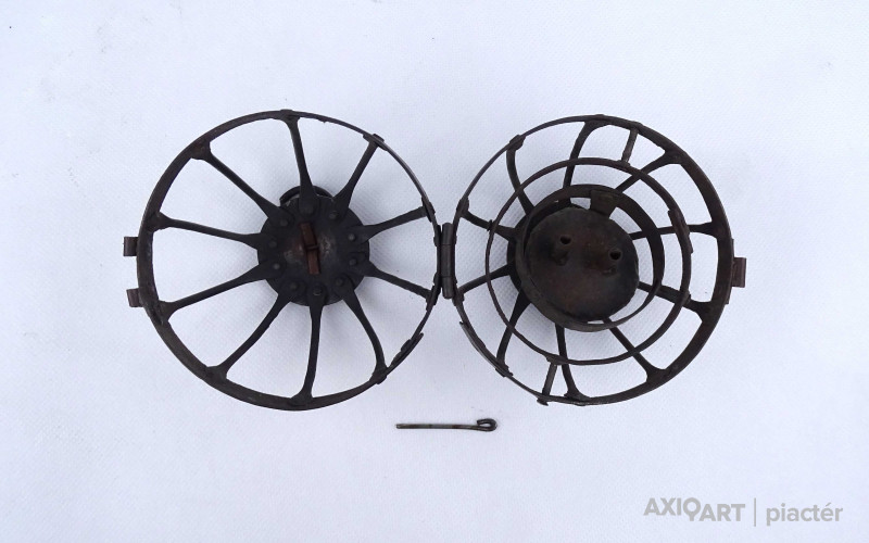[1Z965/X101] Antik, szép állapotban megmaradt, különleges gömb alakú, tengerészeti függő gyertyatartó. Különlegessége az, hogy a zárható gömbalakú kalitkán belül egymásban forgó gyűrűkből áll, közepén egy vas súllyal, ami maga a gyertyatartó. Ez a szerkezet a közepén álló gyertyát képes közel függőleges helyzetben tartani nagyobb hullámzásban is. Eredeti darab, igazi ritkaság. Magasság: 14 cm Szélesség: 11.5 cm Súly: 0.3 kg