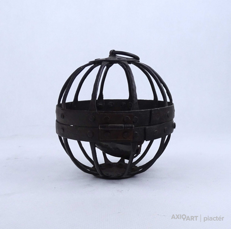 Antik, szép állapotban megmaradt, különleges gömb alakú, tengerészeti függő gyertyatartó. Különlegessége az, hogy a zárható gömbalakú kalitkán belül egymásban forgó gyűrűkből áll, közepén egy vas súllyal, ami maga a gyertyatartó. Ez a szerkezet a közepén álló gyertyát képes közel függőleges helyzetben tartani nagyobb hullámzásban is. Eredeti darab, igazi ritkaság.