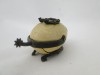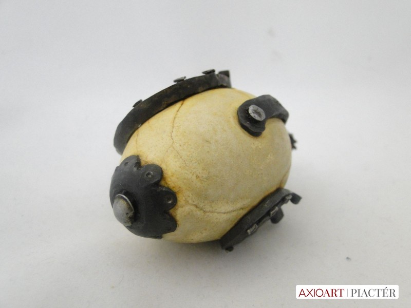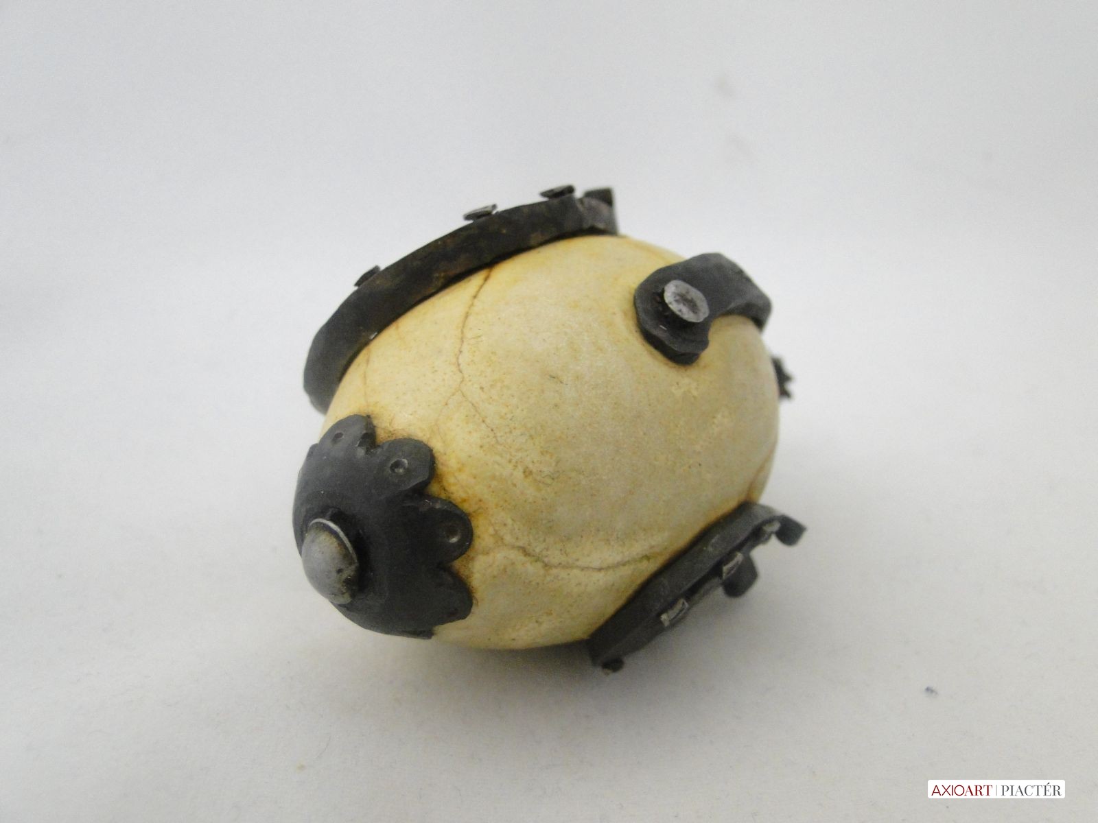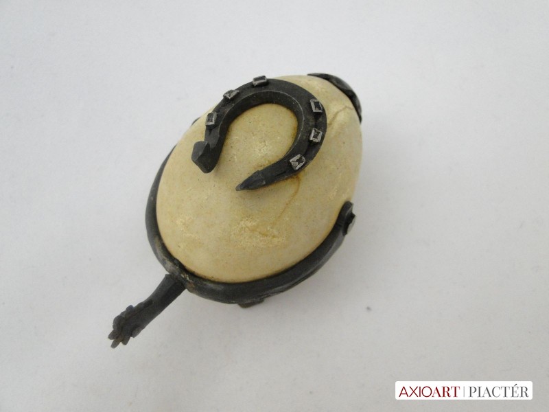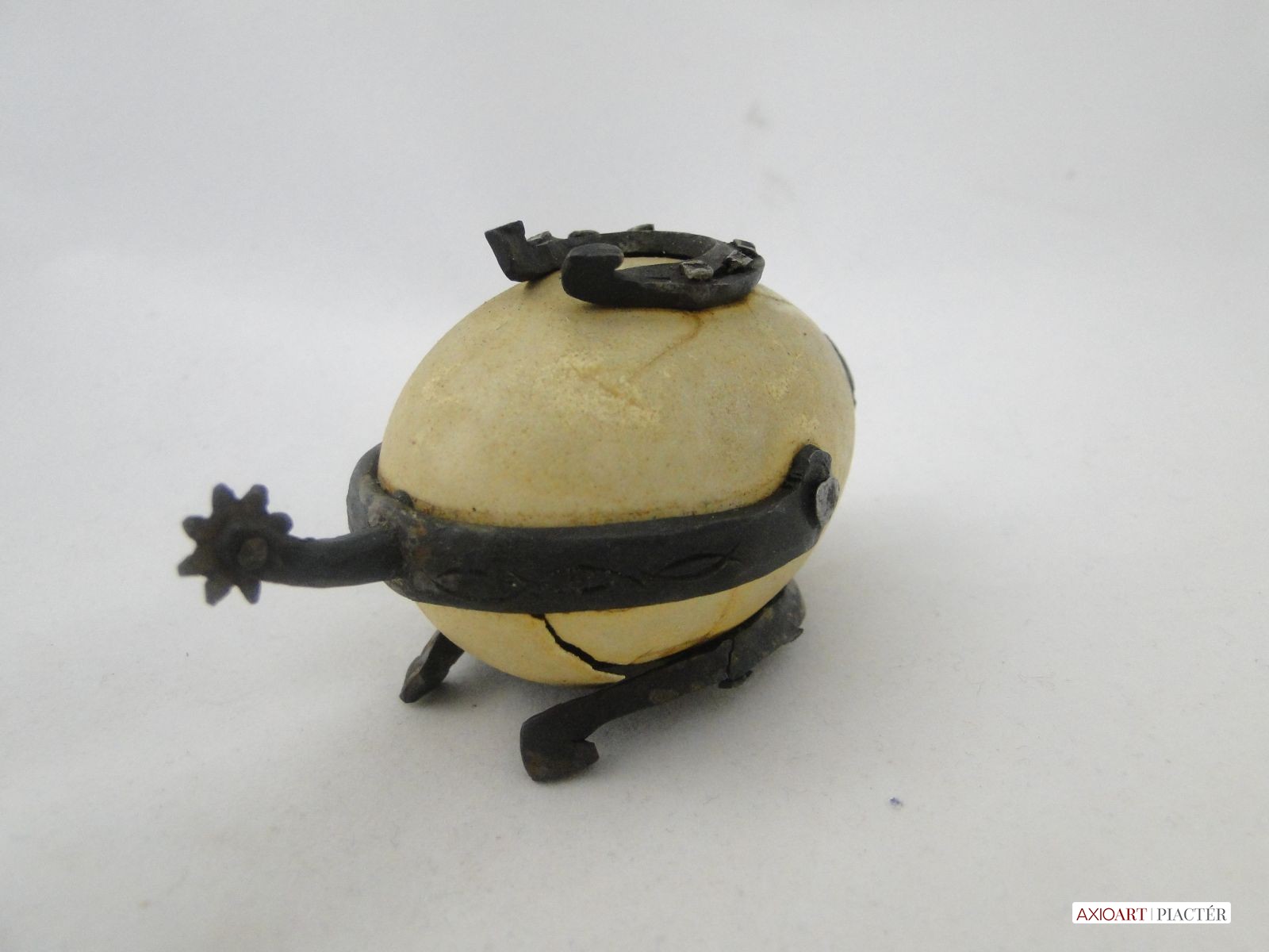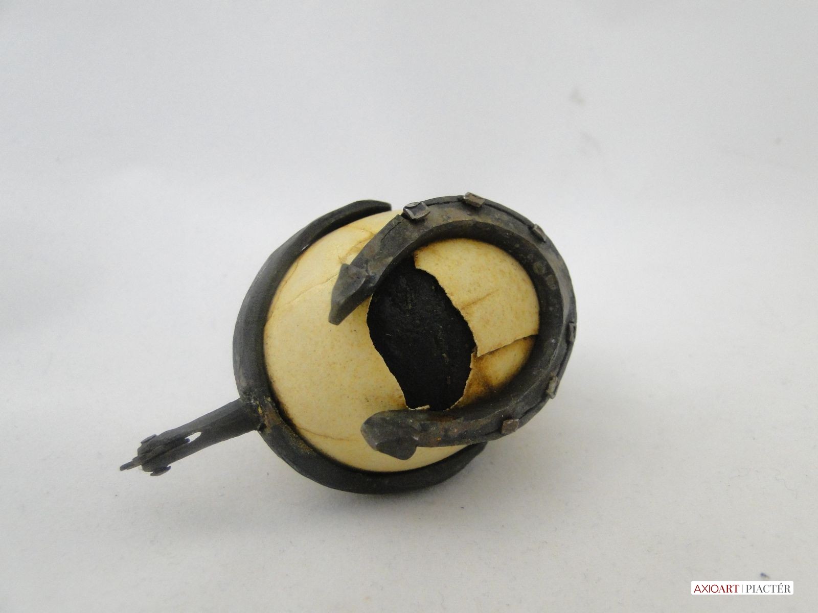 [5680/X024/7] Normál méretű tyúktojás rá formázott kettő darab kisebb, nagyobb patkó és egy darab sarkantyú, tetején végdísszel. A kovácsoltvas díszeket összesen 15 szöggel díszítették. Gyönyörű kovács kézimunka, néprajzi gyűjteménybe való extra különleges darab az 1900-as évek környékéről. Szélesség: 4.5 cm Hosszúság: 8.5 cm Súly: 0.09 kg