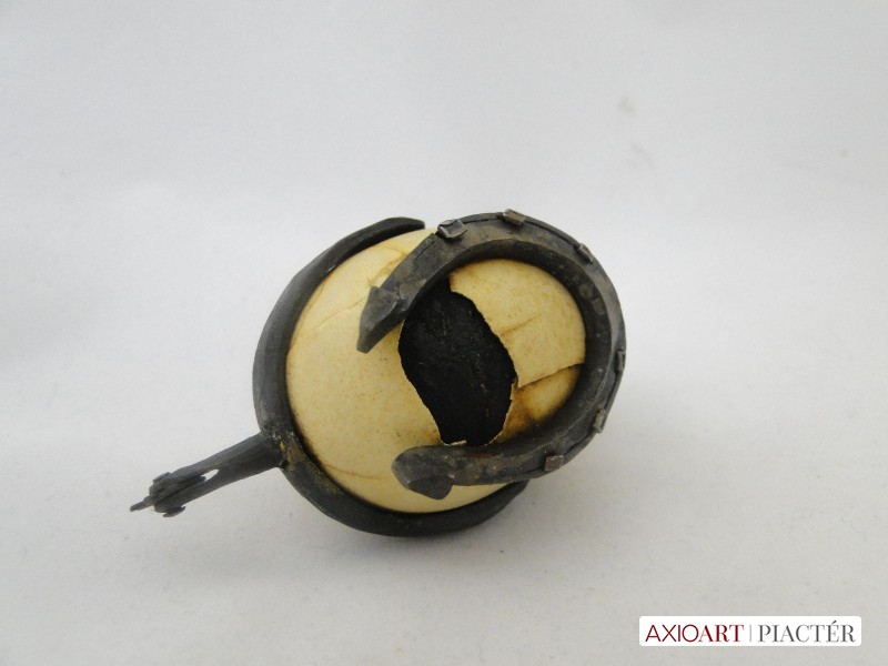 Normál méretű tyúktojás rá formázott kettő darab kisebb, nagyobb patkó és egy darab sarkantyú, tetején végdísszel. A kovácsoltvas díszeket összesen 15 szöggel díszítették. Gyönyörű kovács kézimunka, néprajzi gyűjteménybe való extra különleges darab az 1900-as évek környékéről.