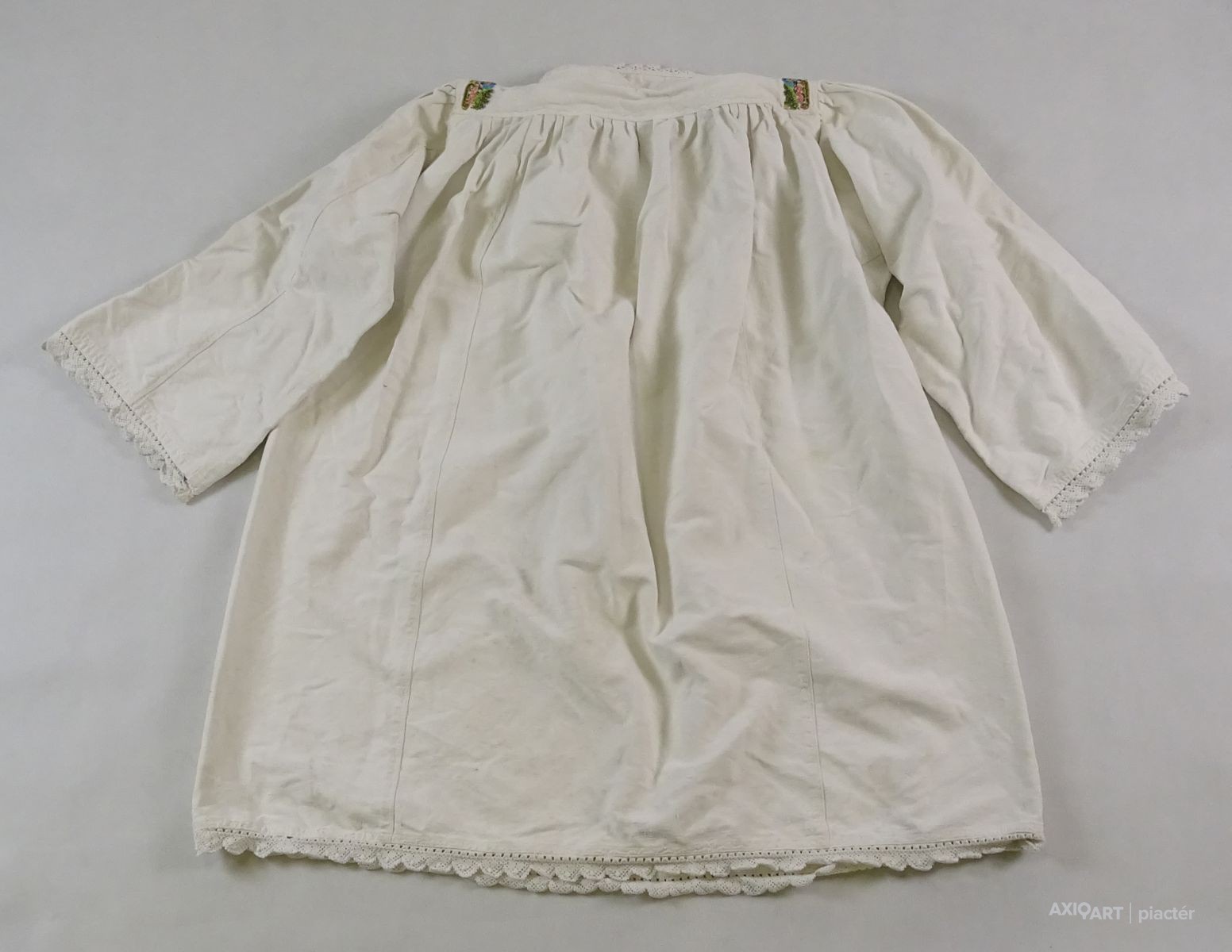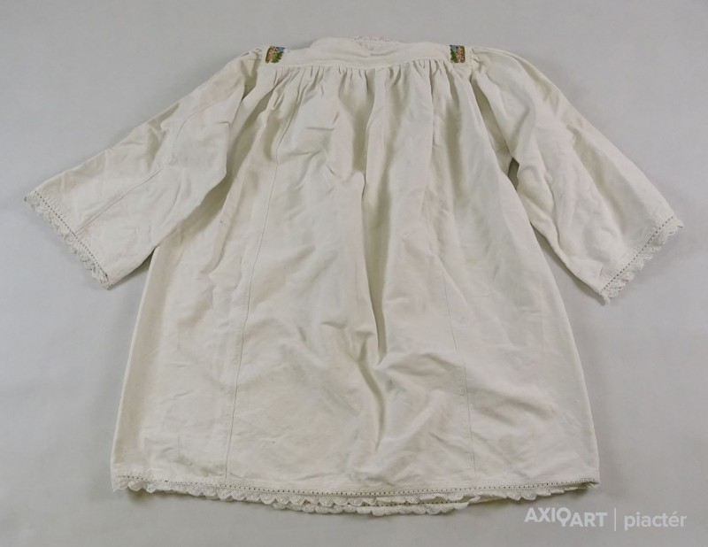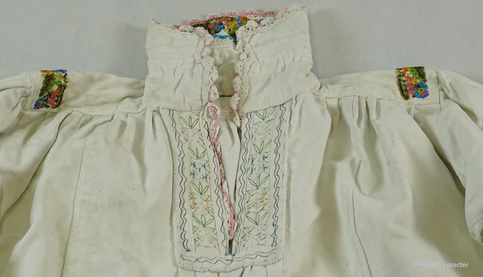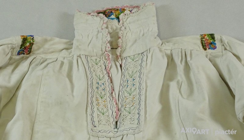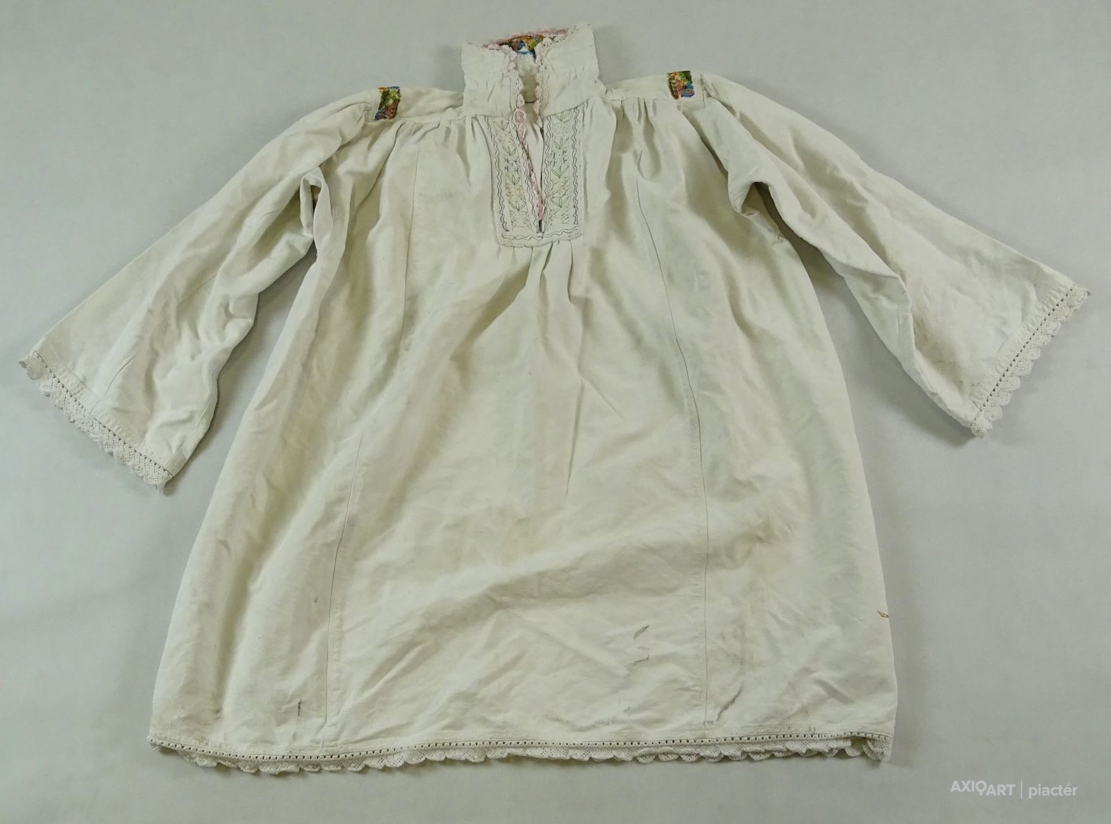 Nagyon régi, szép állapotú, lobogó ujjú, lenvászon bőujjú, galléros hálóruha, hálóing színes gyöngy díszítéssel. Használat előtt tisztítása ajánlott.