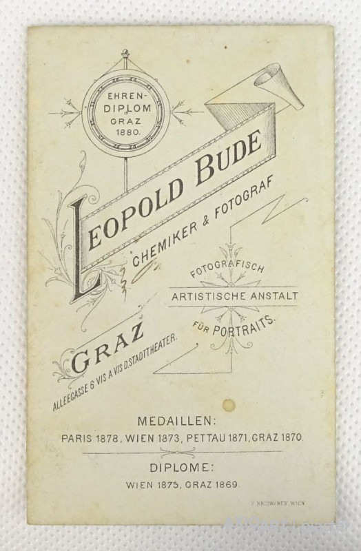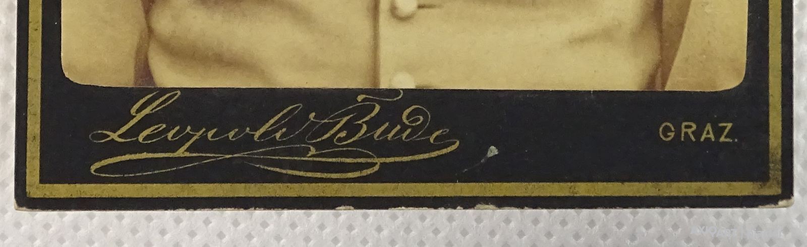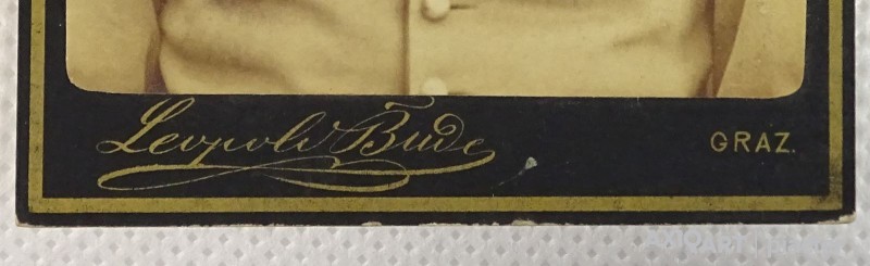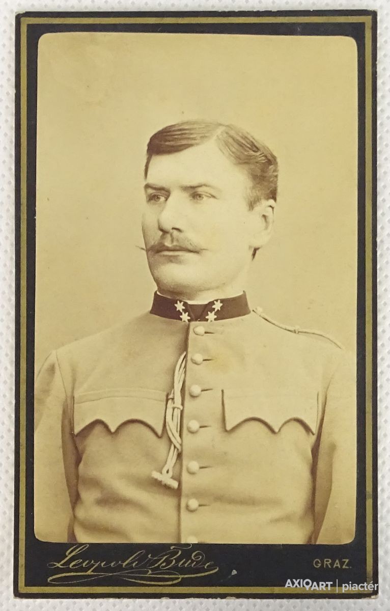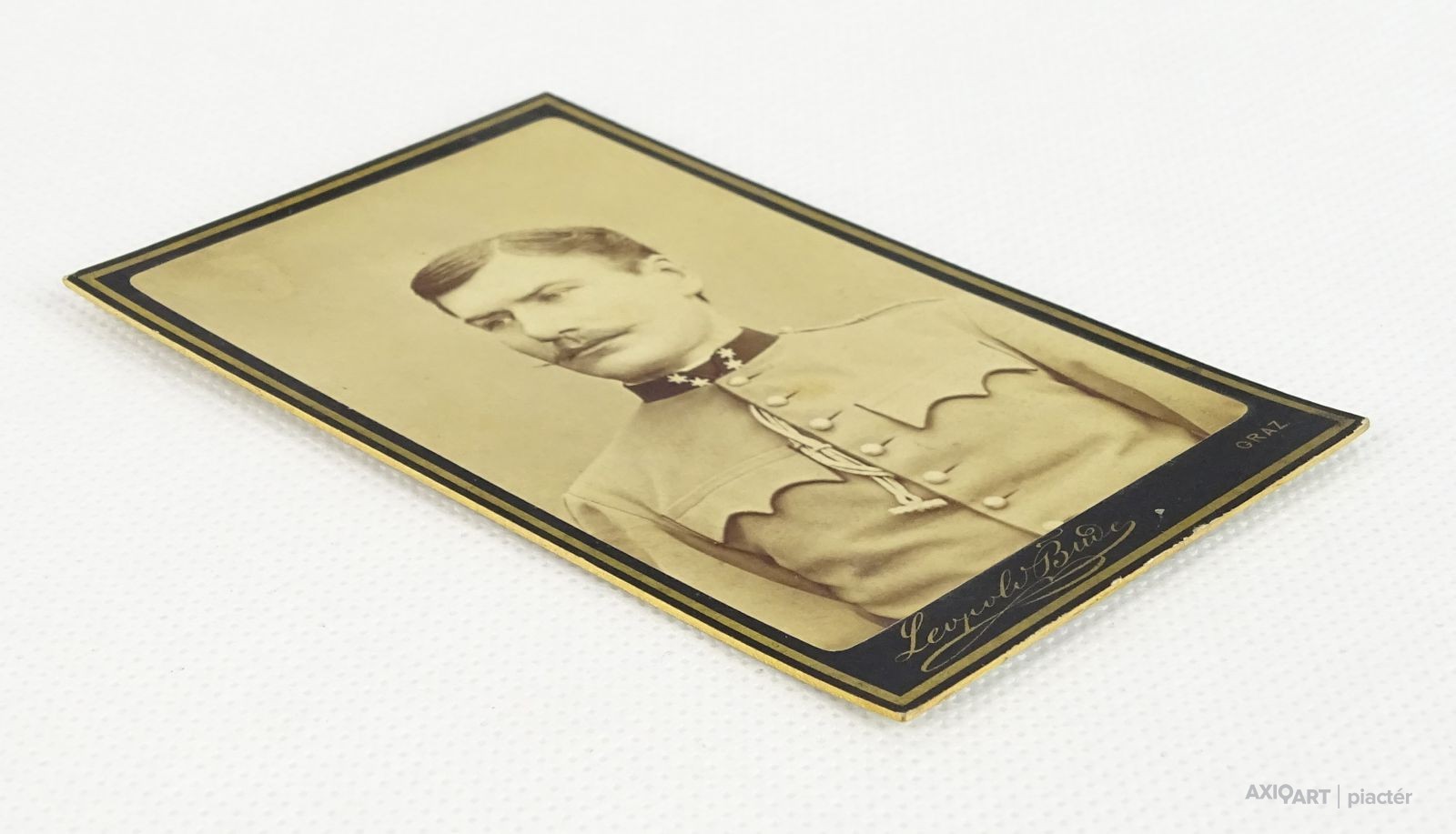 [0R891/X043] 25% ÁRENGEDMÉNY MINDEN TERMÉKÜNKRE Dec. 14-ig Antik művészi fotográfia, katona, tiszti férfi portré. Feliratok: LEOPOLD BUDE CHEMIKER & FOTOGRAF GRAZ MEDAILLEN: PARIS 1878, WIEN 1873, PETTAU 1871, GRAZ 1870 DIPLOME: WIEN 1875, GRAZ 1869 Magasság: 10.5 cm Szélesség: 6.5 cm Súly: 0.007 kg