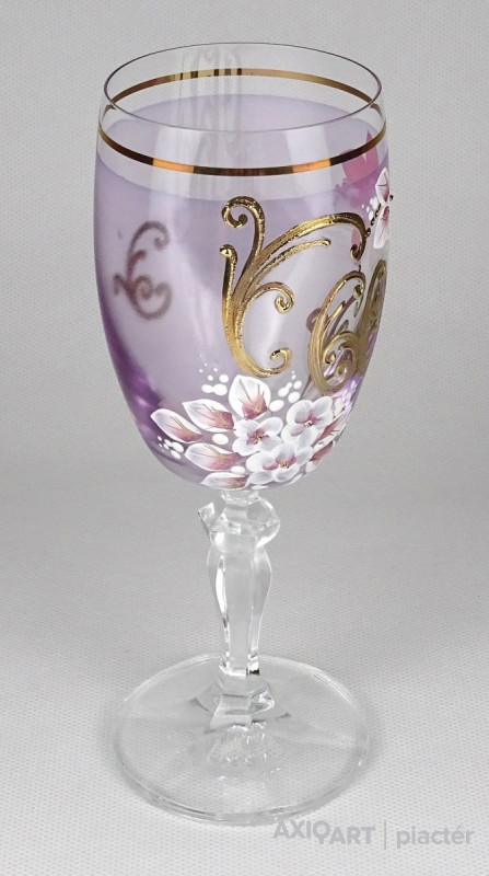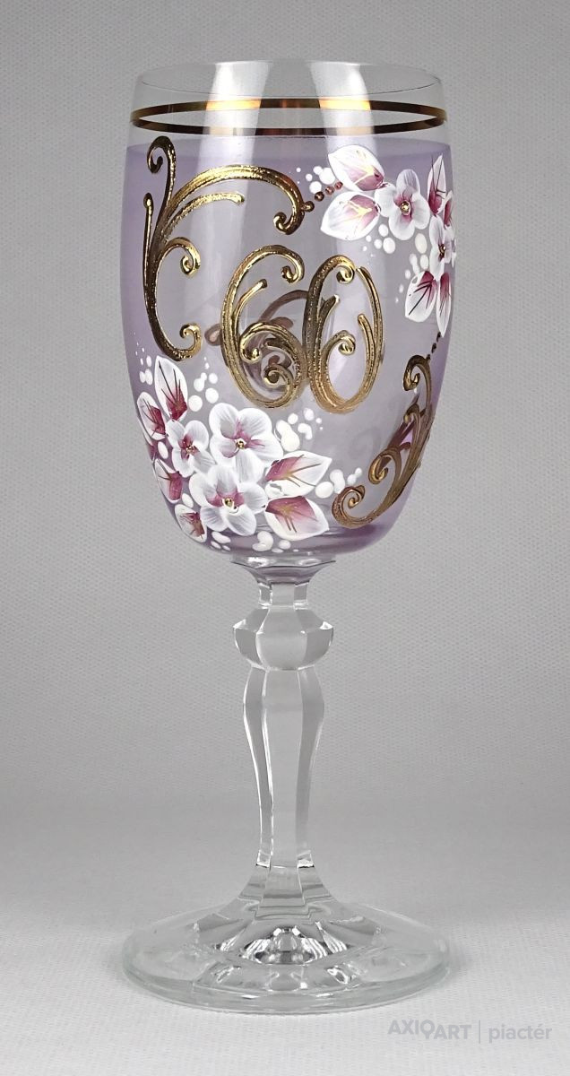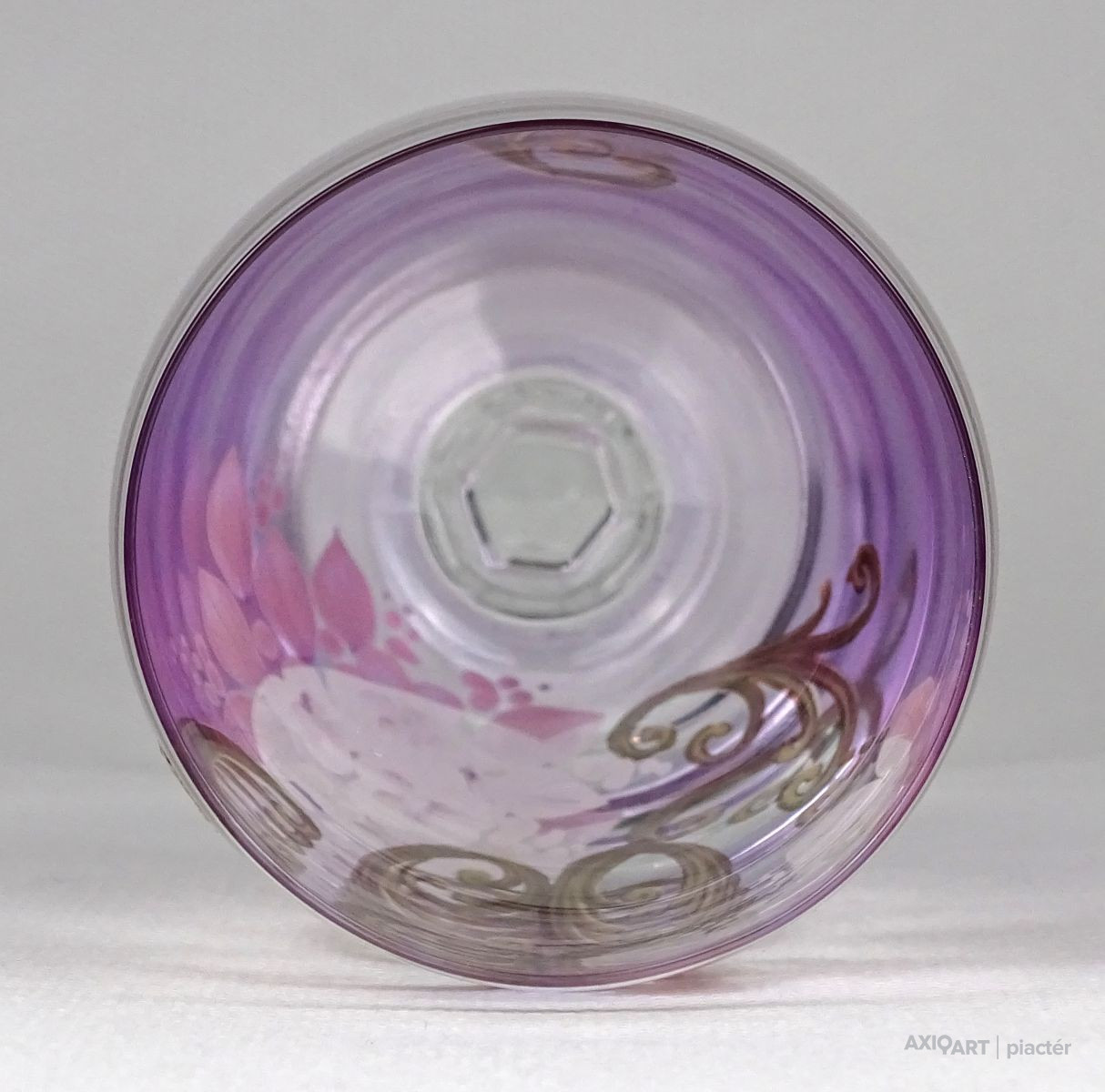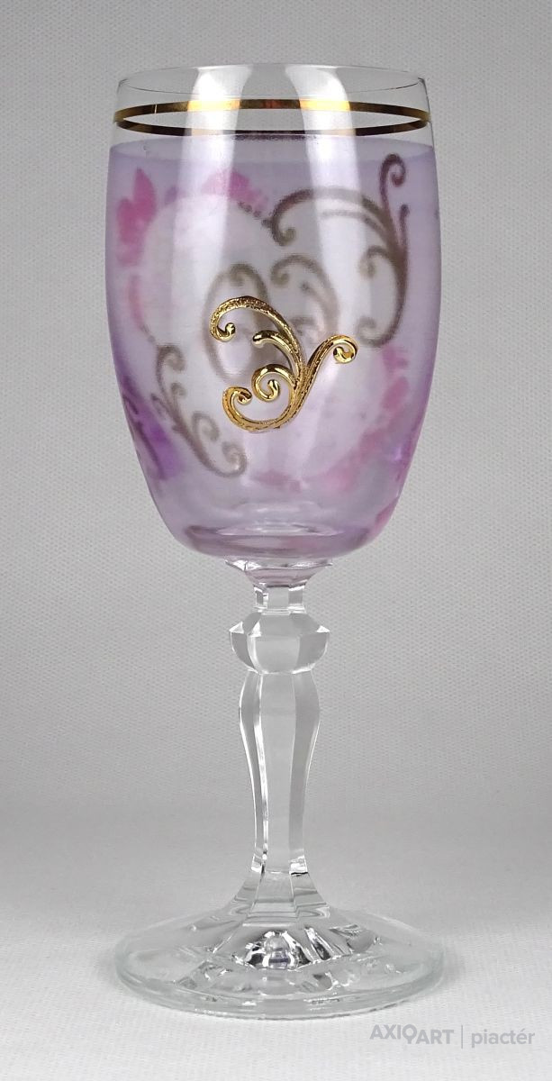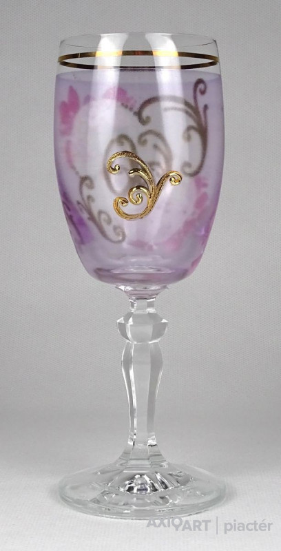 Hibátlan állapotú, nagyon dúsan aranyozott jellegzetes mintájú talpas pohár, díszpohár. Oldalát 60-as szám díszíti.