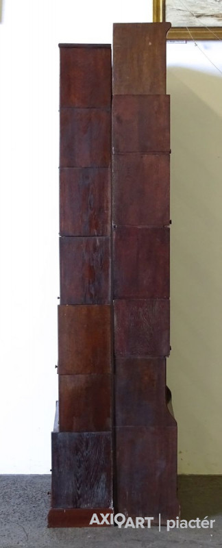 [1Q158/KCS] Antik hét elemes Lingel szekrény, kettő darab. Több darabból összeépített darabok. Nem egységes méretűek. A szintek többsége össze van szögelve. Több száz könyv tárolására alkalmas.