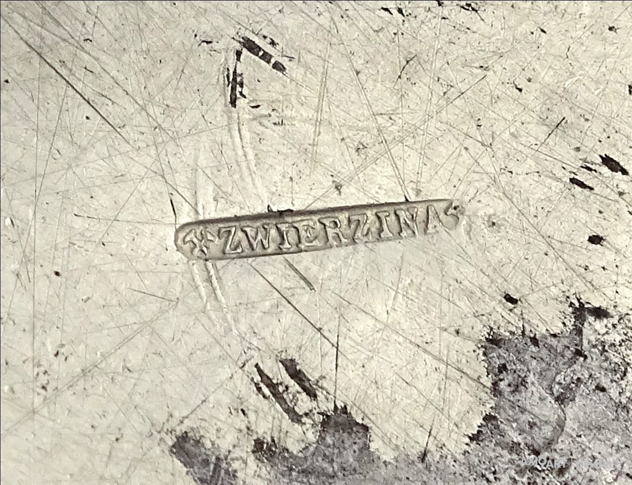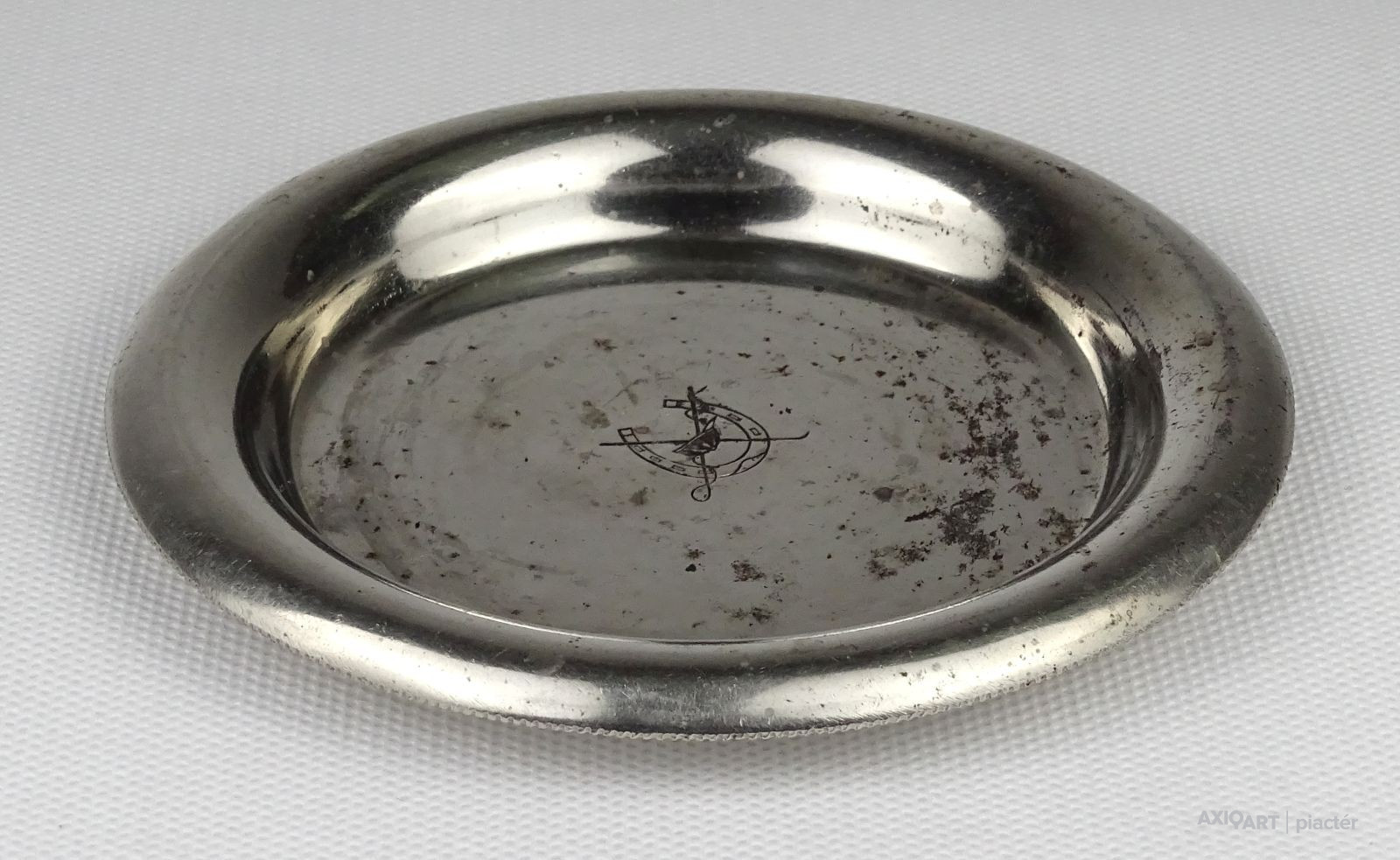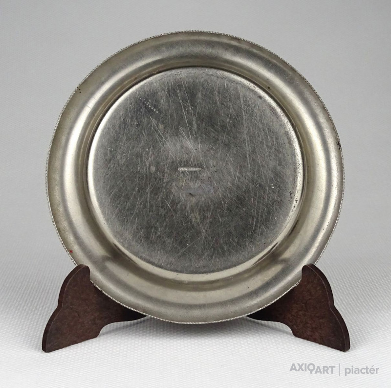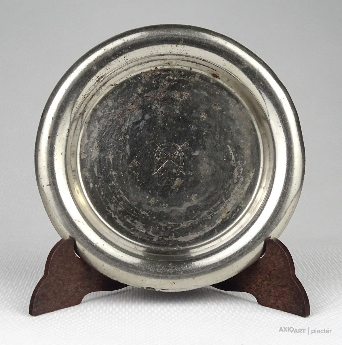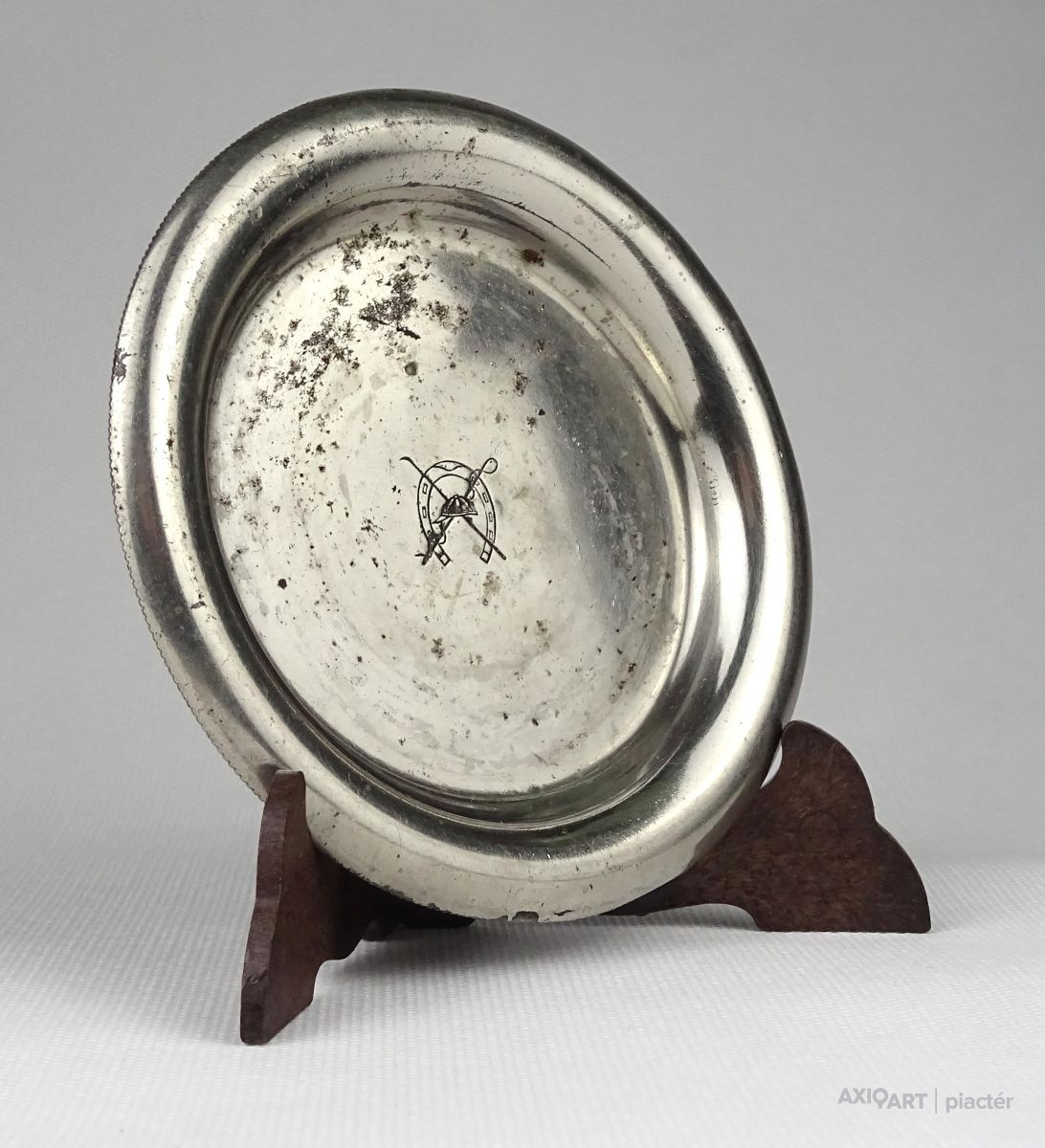 [1J289/X074] Nagyon régi, ritka, jelzett alpakka tál, tálka. Közepén zsokésapka, lovaglópálca és patkó díszítés látható. Alján jelzés: ZWIERZINA Szélesség: 11.3 cm Súly: 0.08 kg