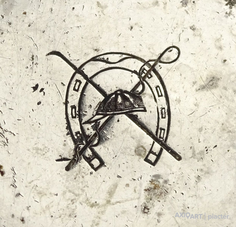 Nagyon régi, ritka, jelzett alpakka tál, tálka. Közepén zsokésapka, lovaglópálca és patkó díszítés látható.