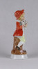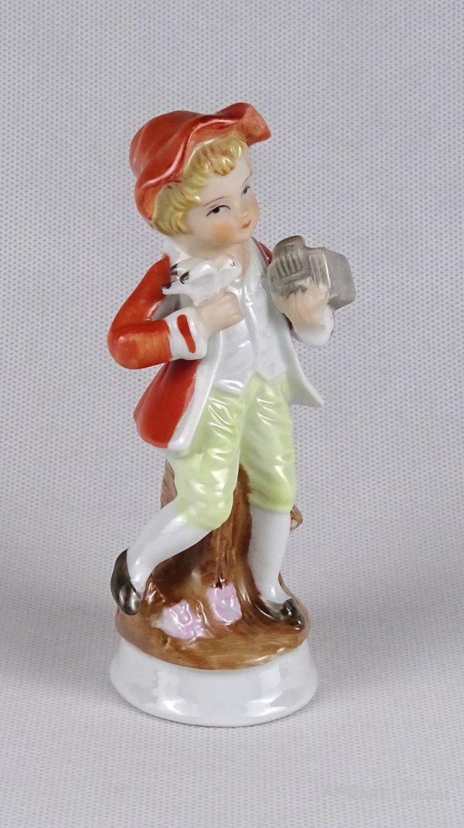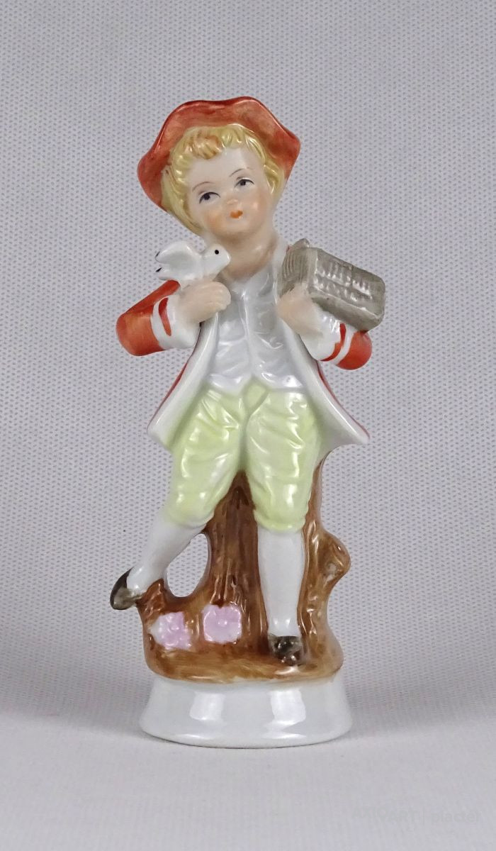 Régi, talapzaton álló hibátlan porcelán figura. Kalapos fiú, kezében madárkalitka és madár, galamb.