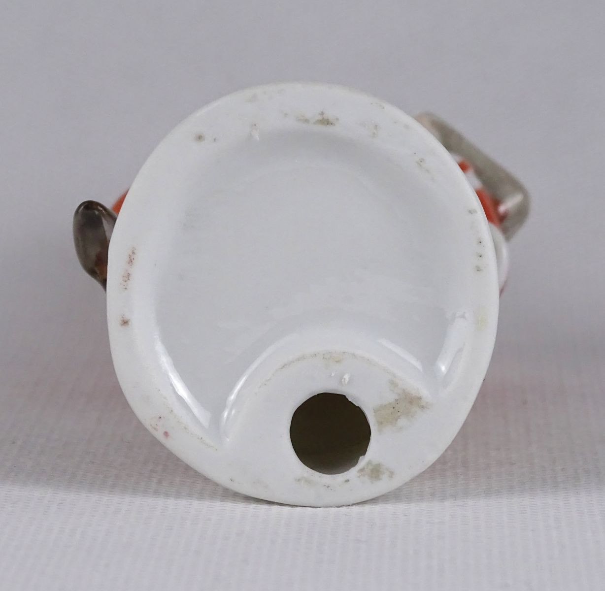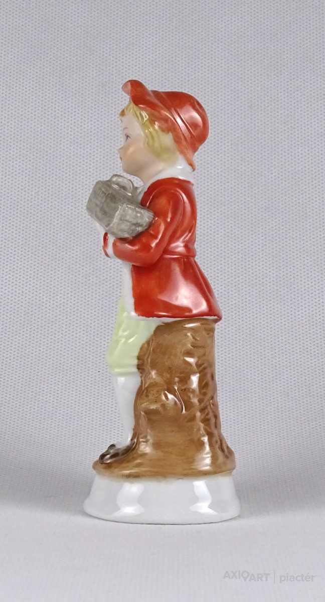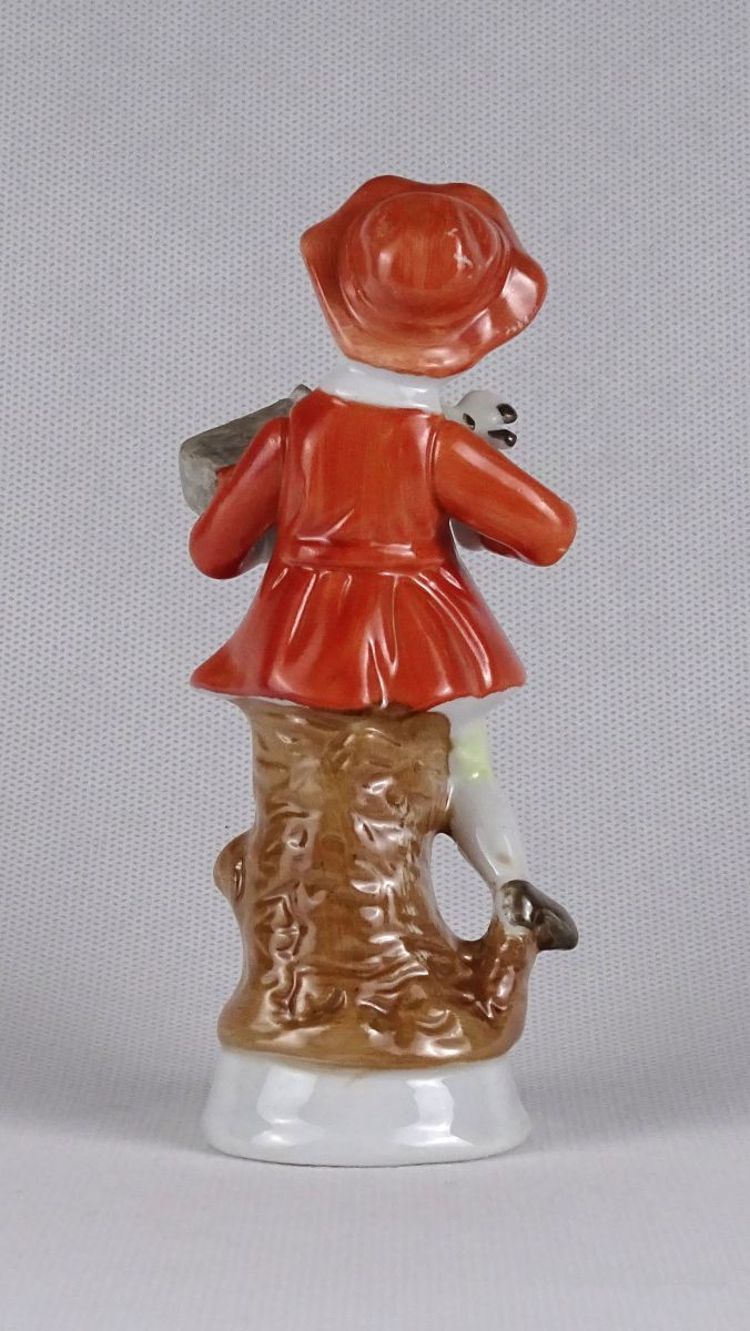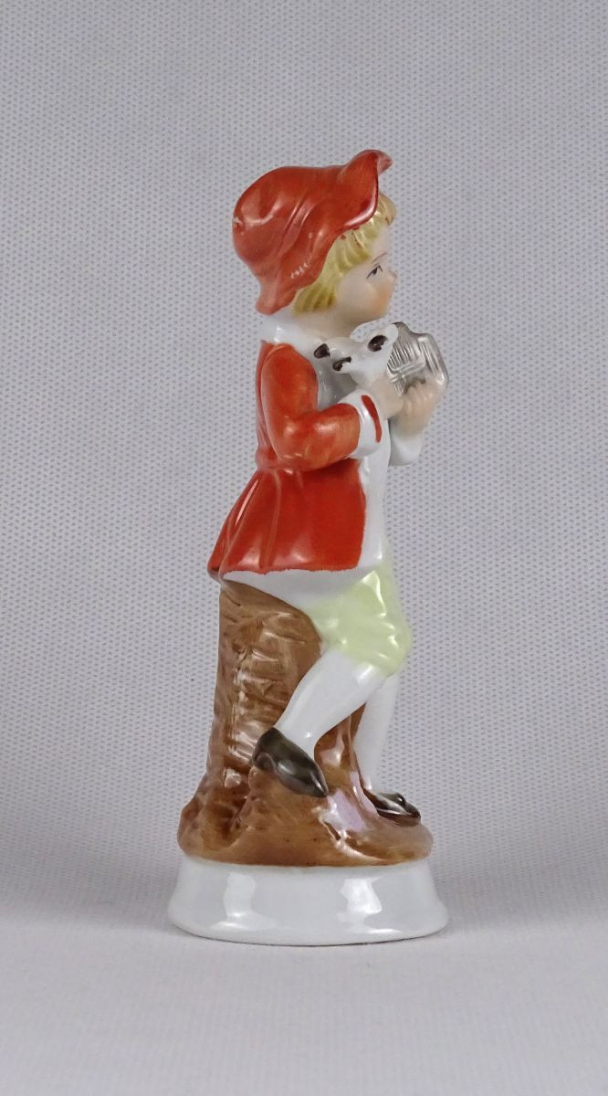 [1T332/X075] Régi, talapzaton álló hibátlan porcelán figura. Kalapos fiú, kezében madárkalitka és madár, galamb. Magasság: 13 cm Súly: 0.09 kg