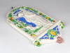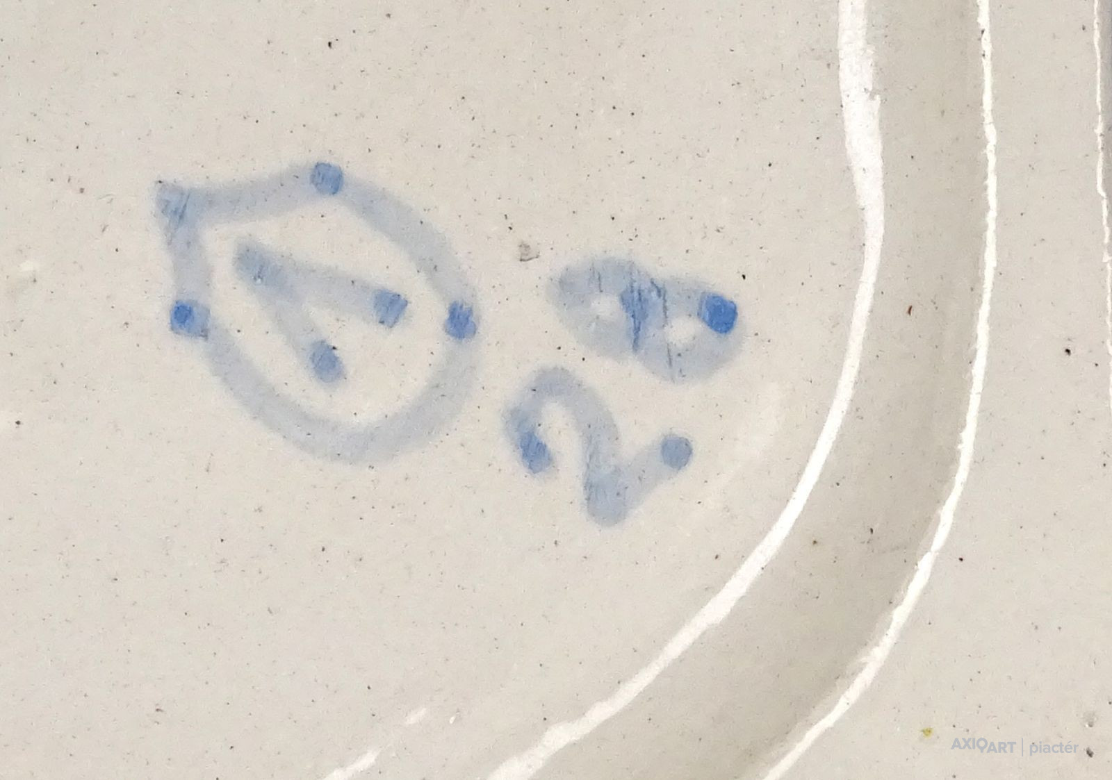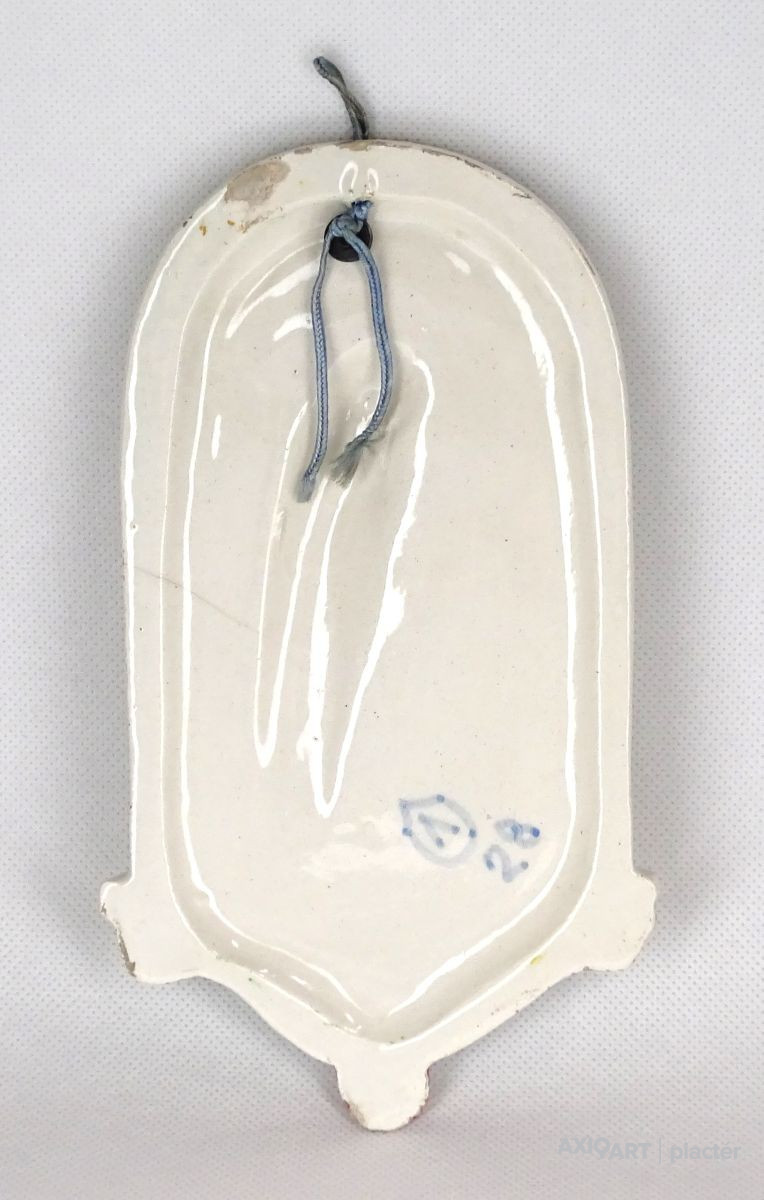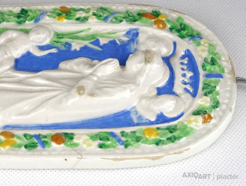 Régi, szép állapotú, falra akasztási lehetőséggel rendelkező vallási témájú fajansz falidísz. Korona alatt Mária az újszülött gyermek Jézussal. Hátoldalán egy hajszálrepedés található. Rajta kézzel írott jelzés, lásd fotó.