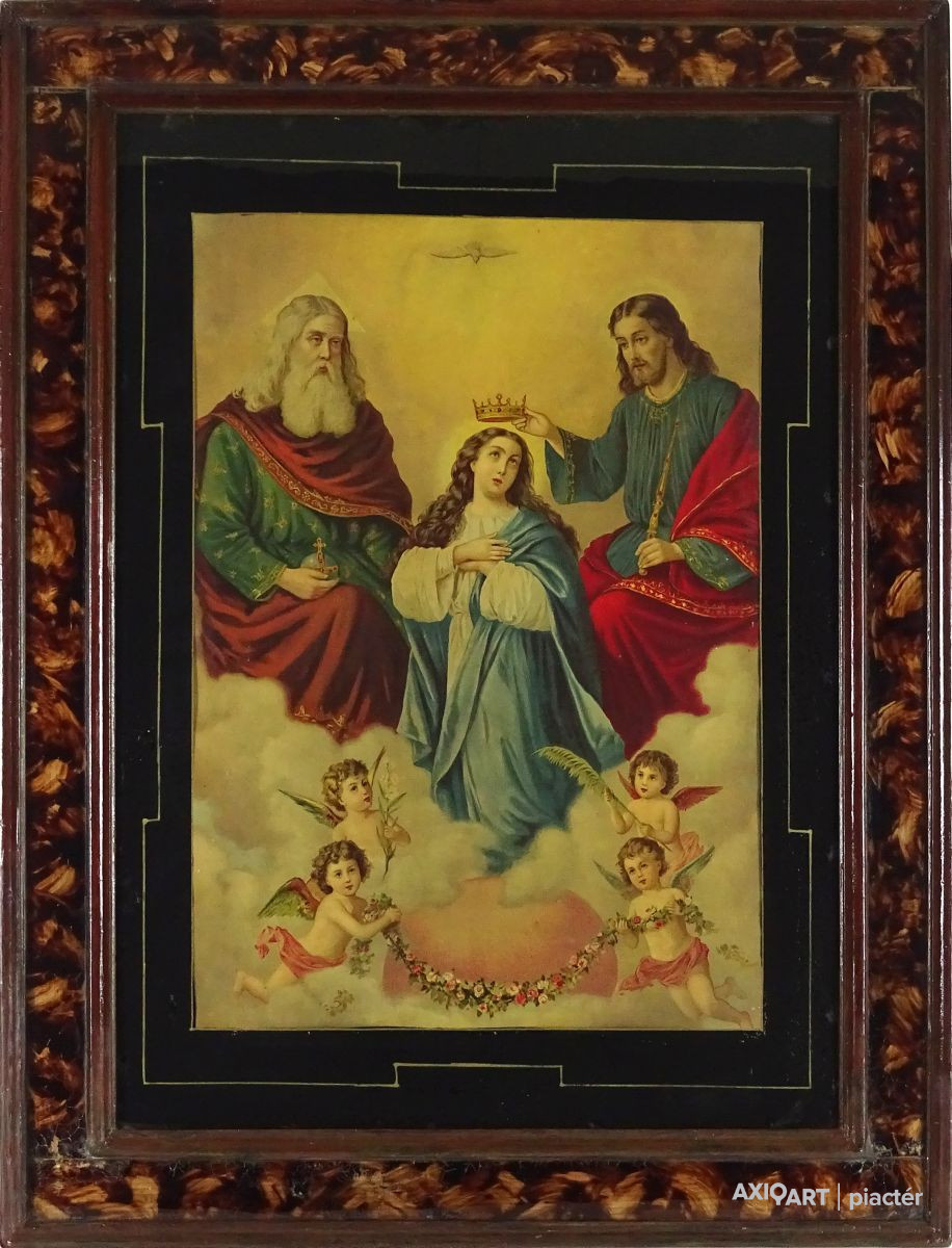 [1K357/039] Antik keretezett szentkép, színes nyomat üvegkép. Arany csíkokkal díszített fekete háttérben található színes olajnyomat, papír nyomat. A barna keretben körben flóderezett teknőc mintás üvegbetétek találhatók. Magasság: 74 cm Szélesség: 56.5 cm Súly: 3.13 kg Mária megkoronázása    Ugrás a navigációhozUgrás a kereséshez Megkoronázott Mária szobor Strasbourgban - A Jelenések könyve így ír erről: "Az égen nagy jel tűnt fel: egy asszony, öltözete a Nap, lába alatt a Hold, fején tizenkét csillagból korona." (Jel 12.1) Szent István magyar király felajánlja a magyar koronát, Alcantarai Szent Péter-templom, Ferenciek tere, Budapest Szűz Mária megkoronázásnak ábrázolása a magyar Szent Koronával Mária megkoronázása vagy Szűz Mária megkoronázása, egy római katolikus szándék kifejezése, hogy Máriának megkülönböztetett tisztelet jár, mint egy királynőnek.  Utalások  Énekek éneke (4.8) Jelenések könyve (12 1-7) Szűz Mária úgy szól Lourdesban Bernadetthoz, hogy Fia mellett páratlan hatalma illetve méltósága van. Fatimában Luciának királynőként mutatkozik be. Ha öt hónap első öt szombatján megáldoznak és rózsafüzért imádkoznak, akkor az embereknek rendkívüli kegyelmeket közvetít. Ebben való munkálkodásában Jézus dicsőítése a végső célja.  Teológia  Máriát már a világ kezdetekor jelölte ki Isten arra a szerepre, hogy Isten Fiát megszülje. A világ kezdetétől készítette fel erre a hivatásra. Amit az emberiség hajnalán Éva (társával Ádámmal) a paradicsomban elrontott, - nem engedelmeskedett Isten szavának - Mária helyre hozta, engedelmes életet élve elfogadta Isten akaratát és igent mondott az angyali üdvözletnek. A kereszthalálkor, abban a pillanatban amikor Jézus oldalába döfte a lándzsát a római katona, egybeforrt szíve Jézuséval. Mária mennybevételét vallja a katolikus egyház, ahová megdicsőülve érkezett. A mennybeviteli liturgia szerint a korona a földi szenvedésének jutalma, mely a mennyben dicsőséggé válik. Anyai példa az embereknek, ezért megkülönböztetett tisztelet jár annak az asszonynak aki bűntelenül élt. A katolikus egyház avval fejezi ki tiszteletét, hogy ikonográfiájában Máriát koronával a fején ábrázolják sok esetben. Az egyház nem mint üres barokkos szertartásnak veszi Mária megkoronázását, hanem az anyai szeretet szeplőtelen tisztaságának figyelem felkeltésének példáját fejezi ki: tekintsünk fel örök eszményképünkre.  Forrás: wikipédia